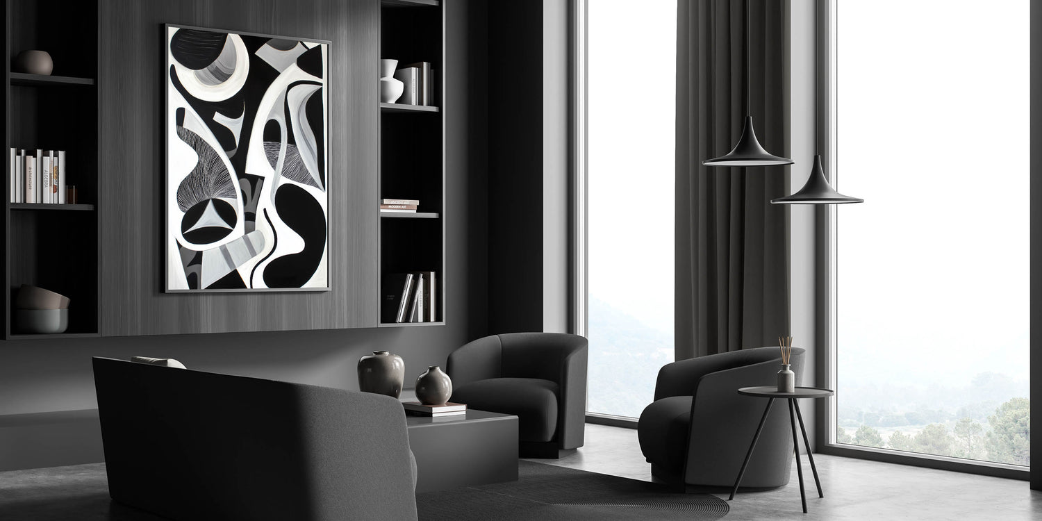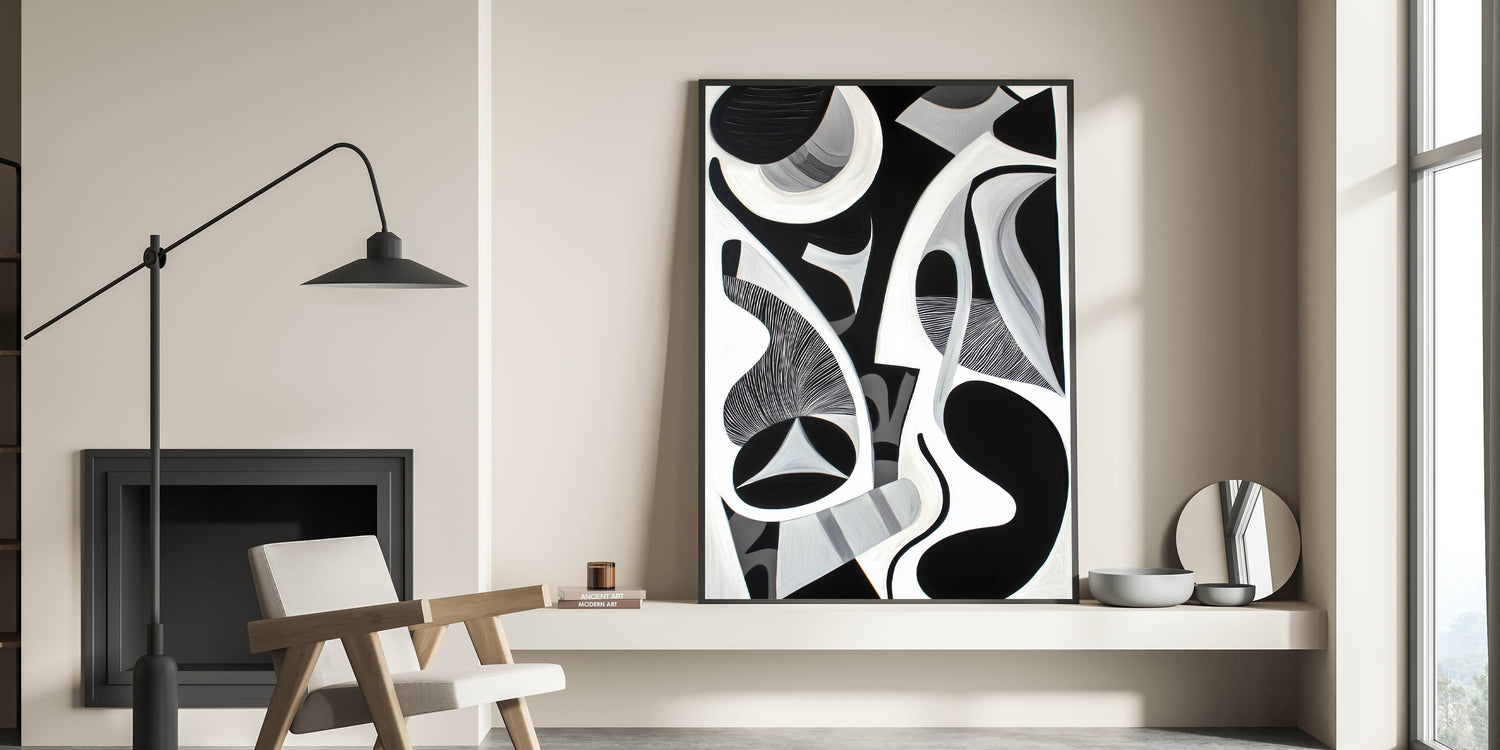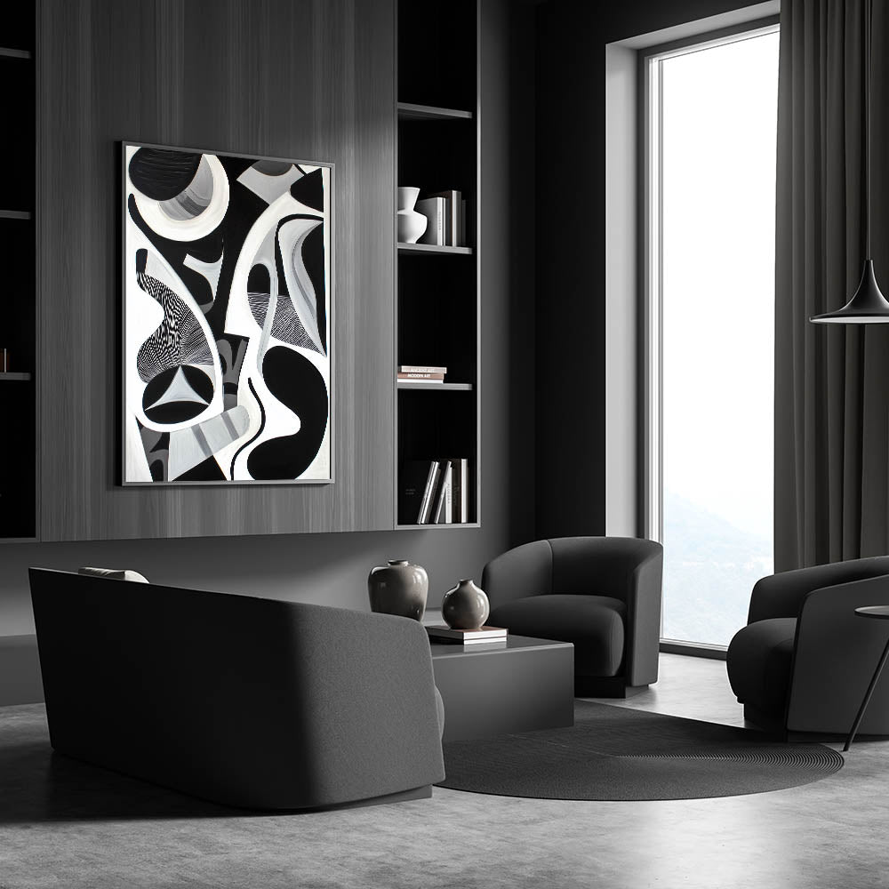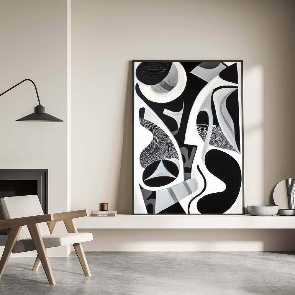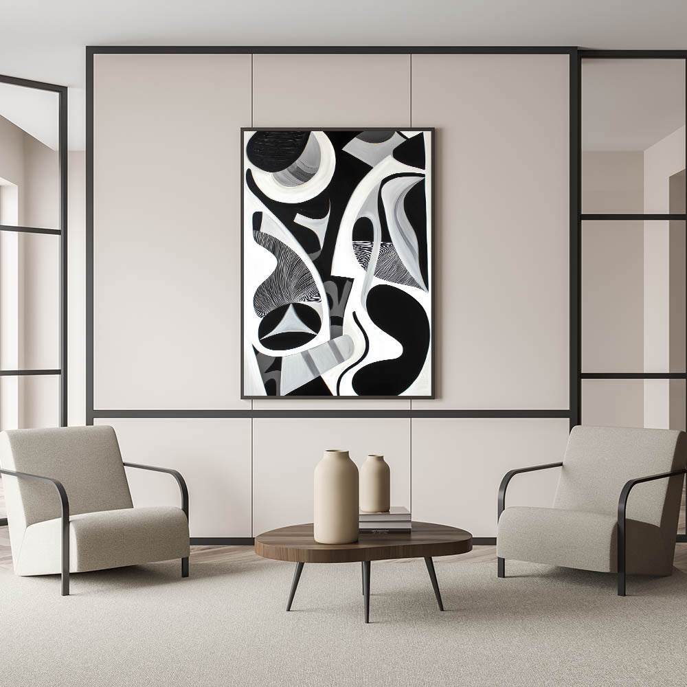 Make a bold statement with this modern wall art, featuring a striking black and white abstract composition. This living room wall art is designed with flowing geometric shapes and intricate patterns, making it an eye-catching addition to contemporary decor. The contrast between deep black, crisp white, and soft gray adds sophistication and modern appeal to any interior.