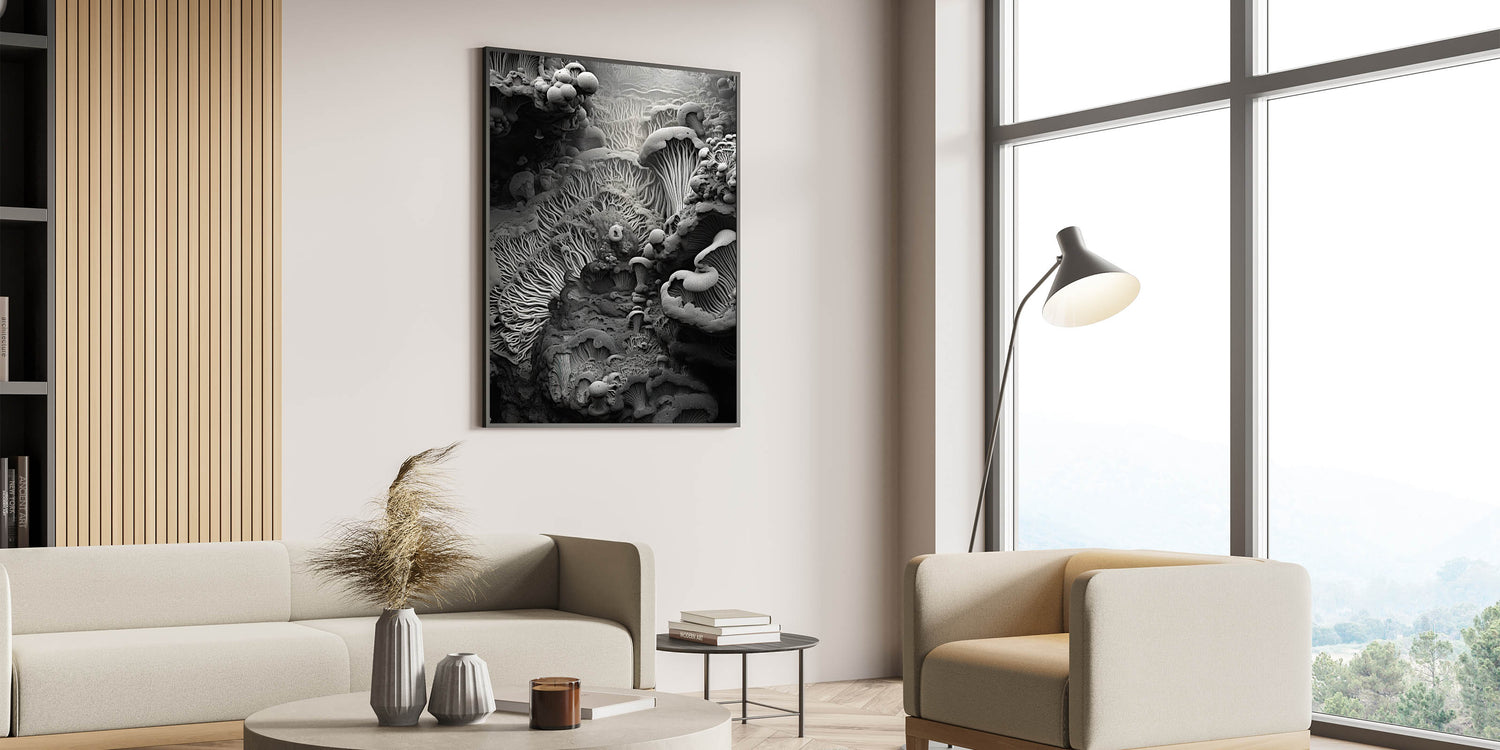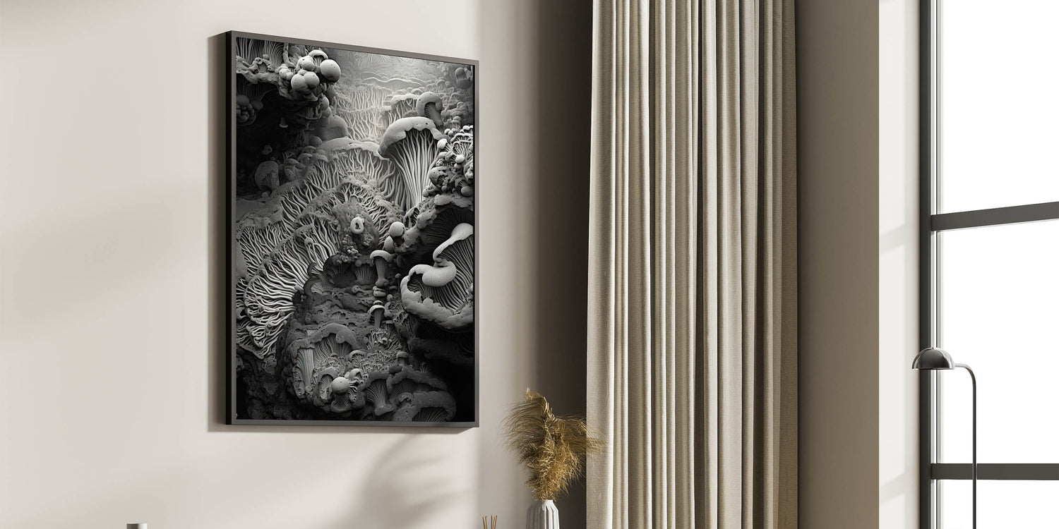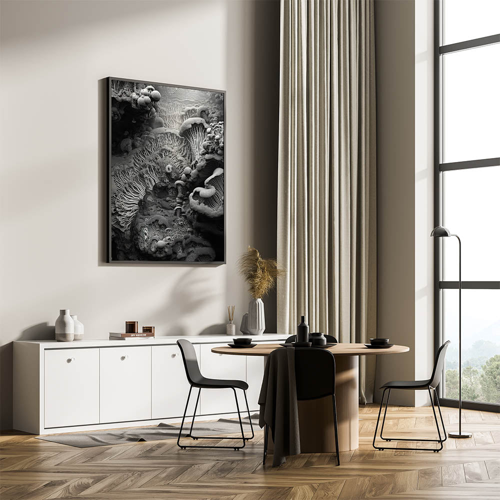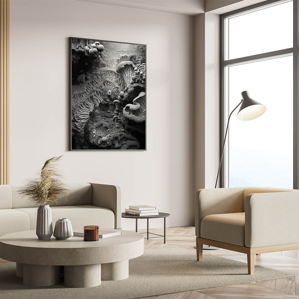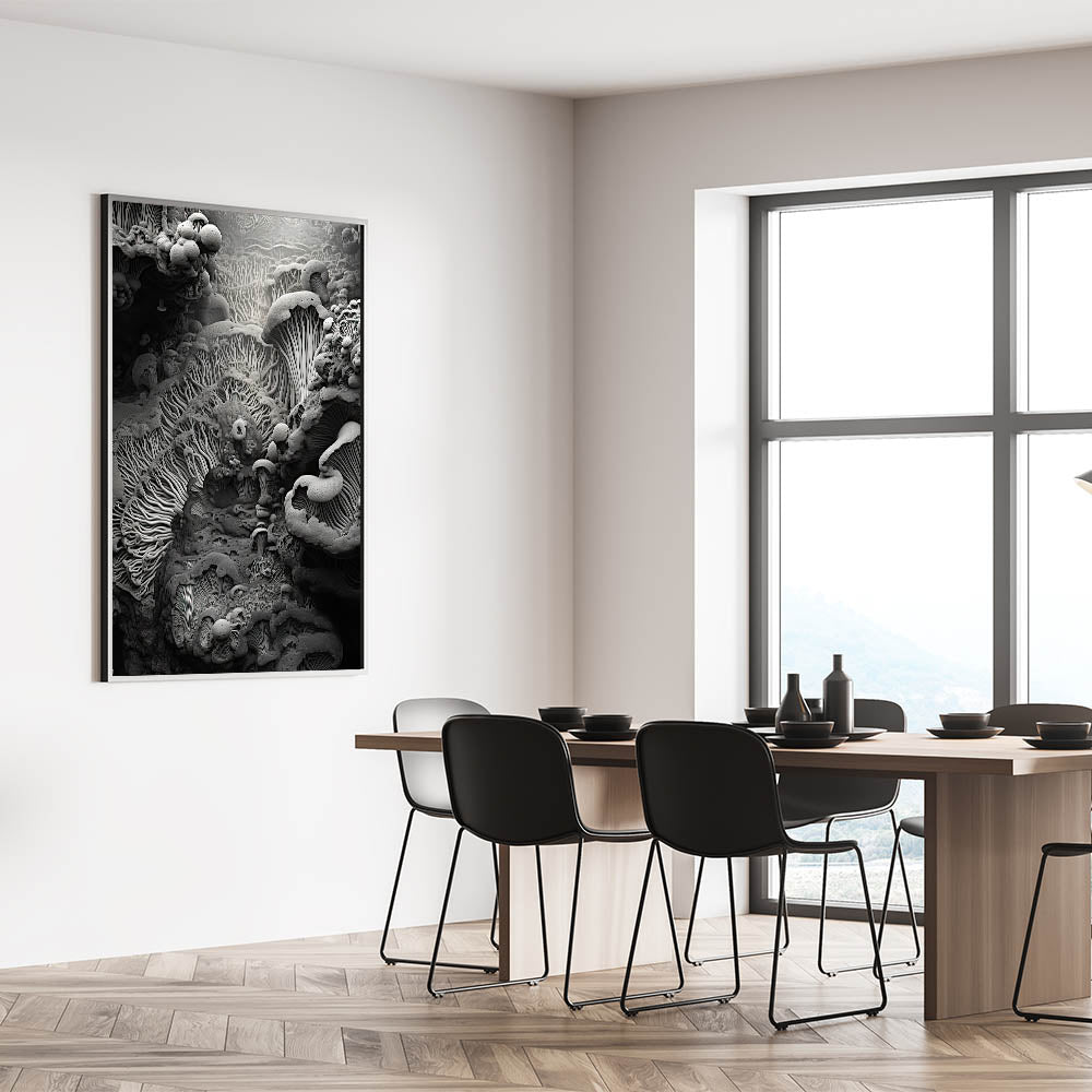 Delve into the serene elegance of nature with this monochrome fungi macro wall art. The artwork captures a stunning closeup of layered mushroom structures, showcasing intricate gills and organic textures. The grayscale color palette accentuates the fine details, creating a timeless, sophisticated look that’s perfect for minimalist spaces. The subtle gradient from shadowed tones to lighter highlights adds depth, drawing the viewer into the intricate world of fungi.