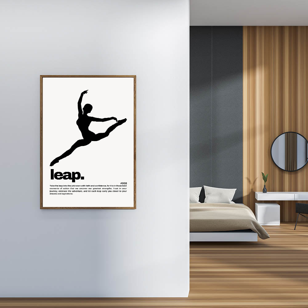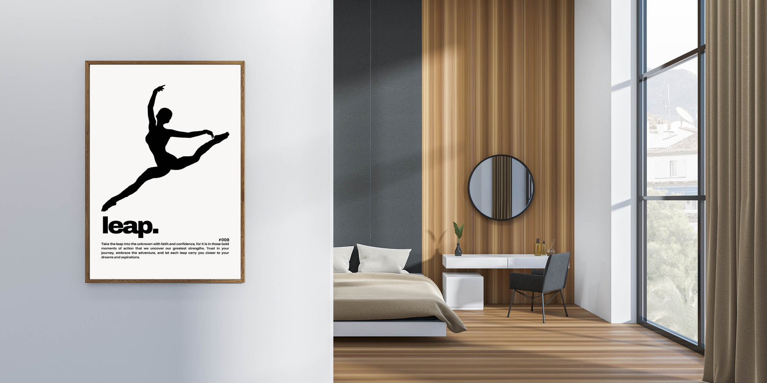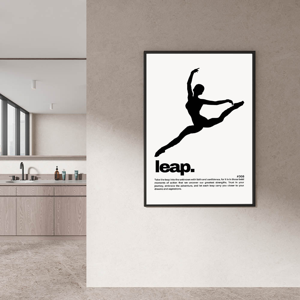 Take bold steps forward with our "Leap" monochrome motivational typography art print. Featuring a graceful silhouette of a dancer in mid-leap, this design captures the essence of courage and determination. The contrasting shades of gray and black, combined with minimalist typography, make this piece a powerful focal point for any modern or contemporary space. Ideal for home offices, living rooms, or dance studios, this art print serves as a daily reminder to embrace risks and pursue dreams fearlessly.