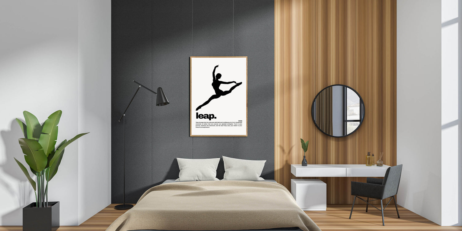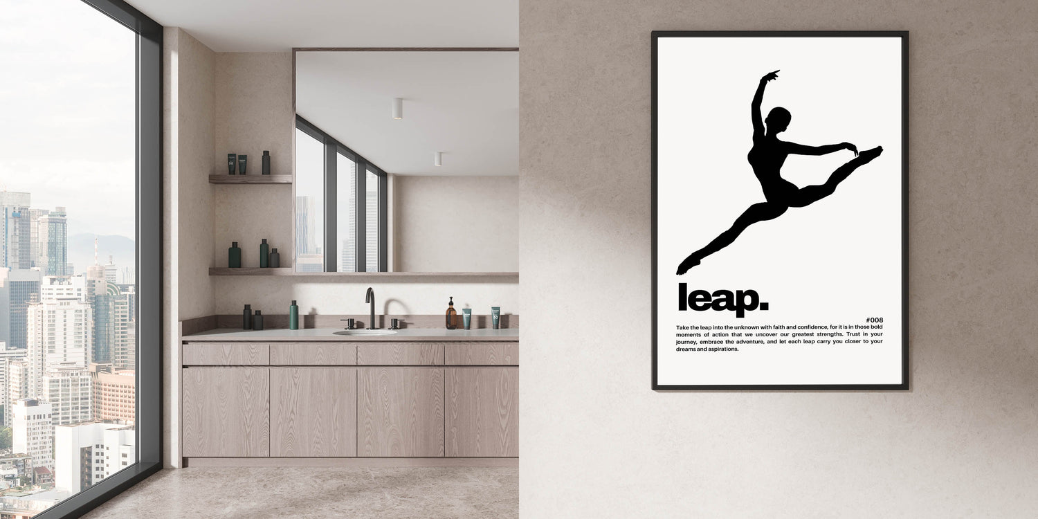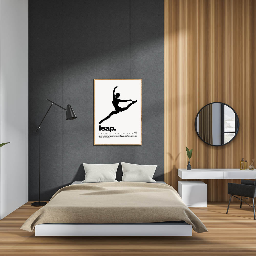Take bold steps forward with our "Leap" monochrome motivational typography art print. Featuring a graceful silhouette of a dancer in mid-leap, this design captures the essence of courage and determination. The contrasting shades of gray and black, combined with minimalist typography, make this piece a powerful focal point for any modern or contemporary space. Ideal for home offices, living rooms, or dance studios, this art print serves as a daily reminder to embrace risks and pursue dreams fearlessly.