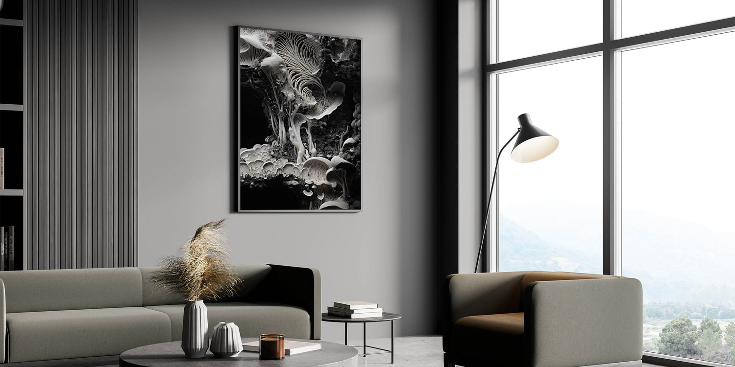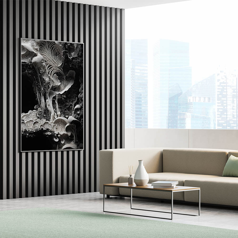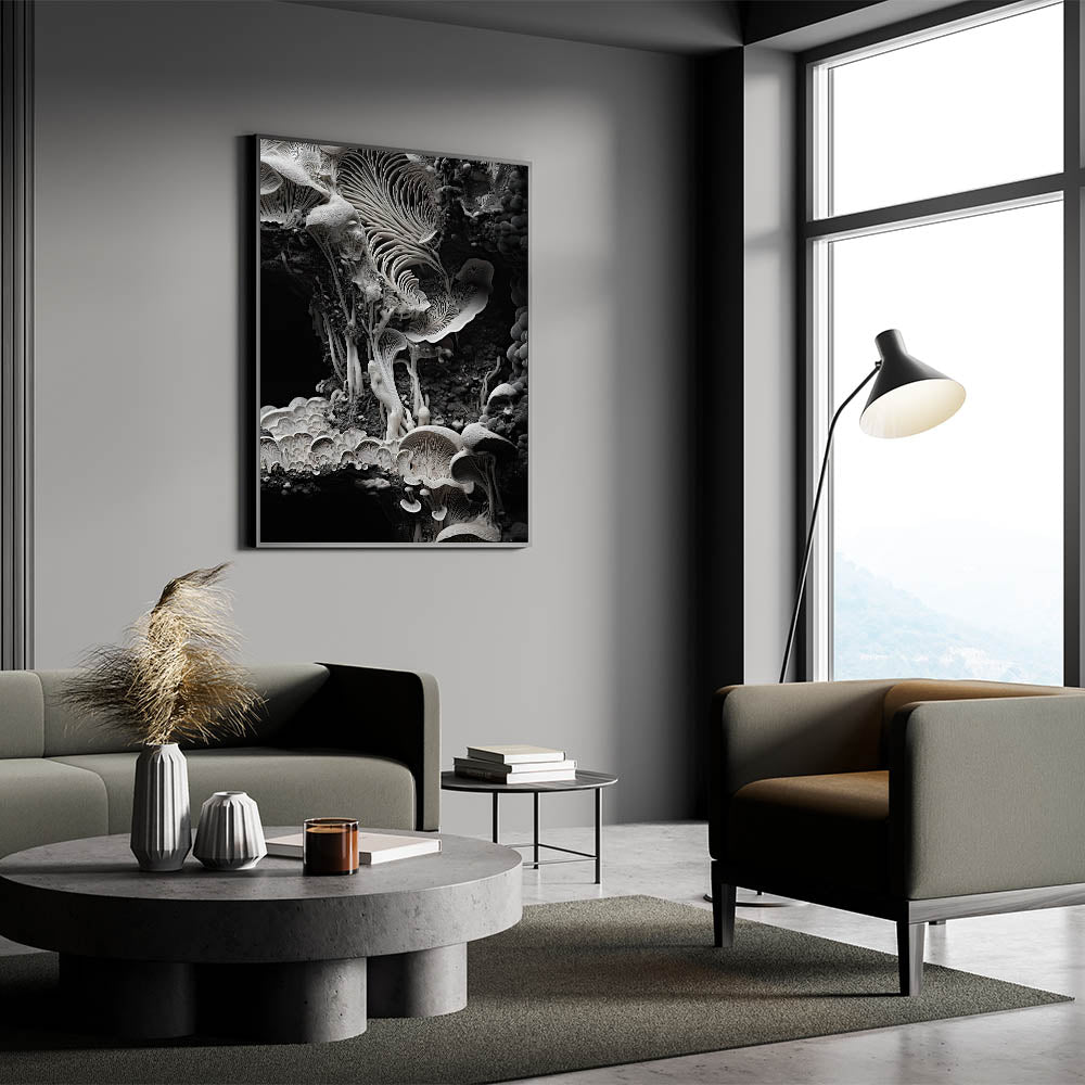 Enhance your space with this breathtaking monochrome mushroom macro wall art, a masterpiece of organic elegance. Featuring high-resolution photography, this design showcases the intricate textures and delicate patterns of mushrooms in a striking black-and-white palette. Its minimalist aesthetic and timeless appeal make it a perfect addition to modern and nature-inspired interiors.
