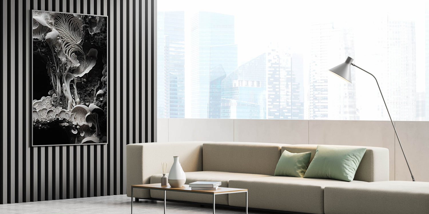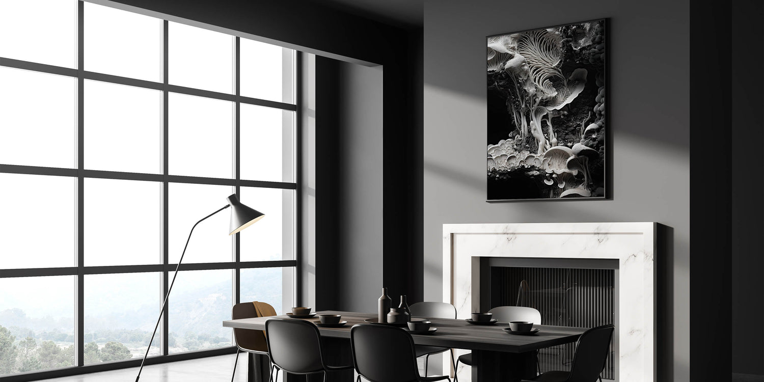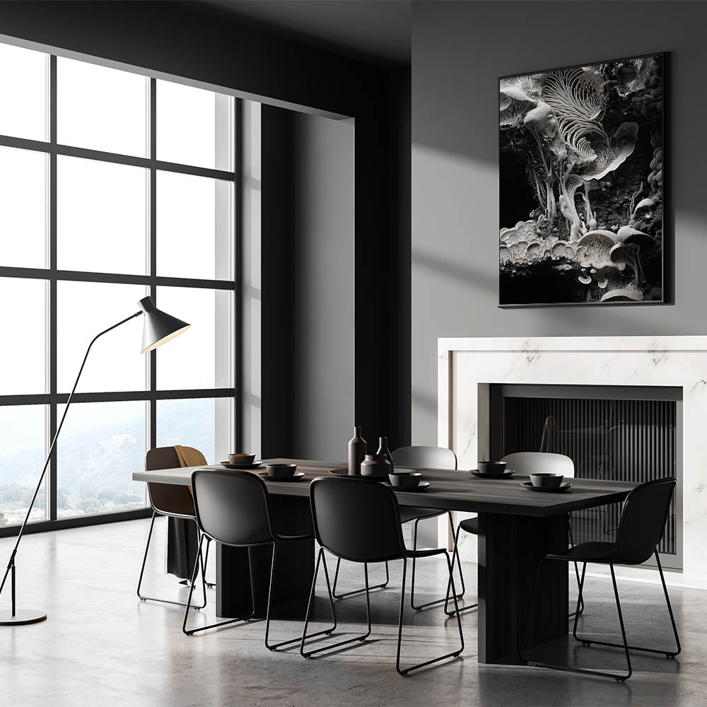 Enhance your space with this breathtaking monochrome mushroom macro wall art, a masterpiece of organic elegance. Featuring high-resolution photography, this design showcases the intricate textures and delicate patterns of mushrooms in a striking black-and-white palette. Its minimalist aesthetic and timeless appeal make it a perfect addition to modern and nature-inspired interiors.
