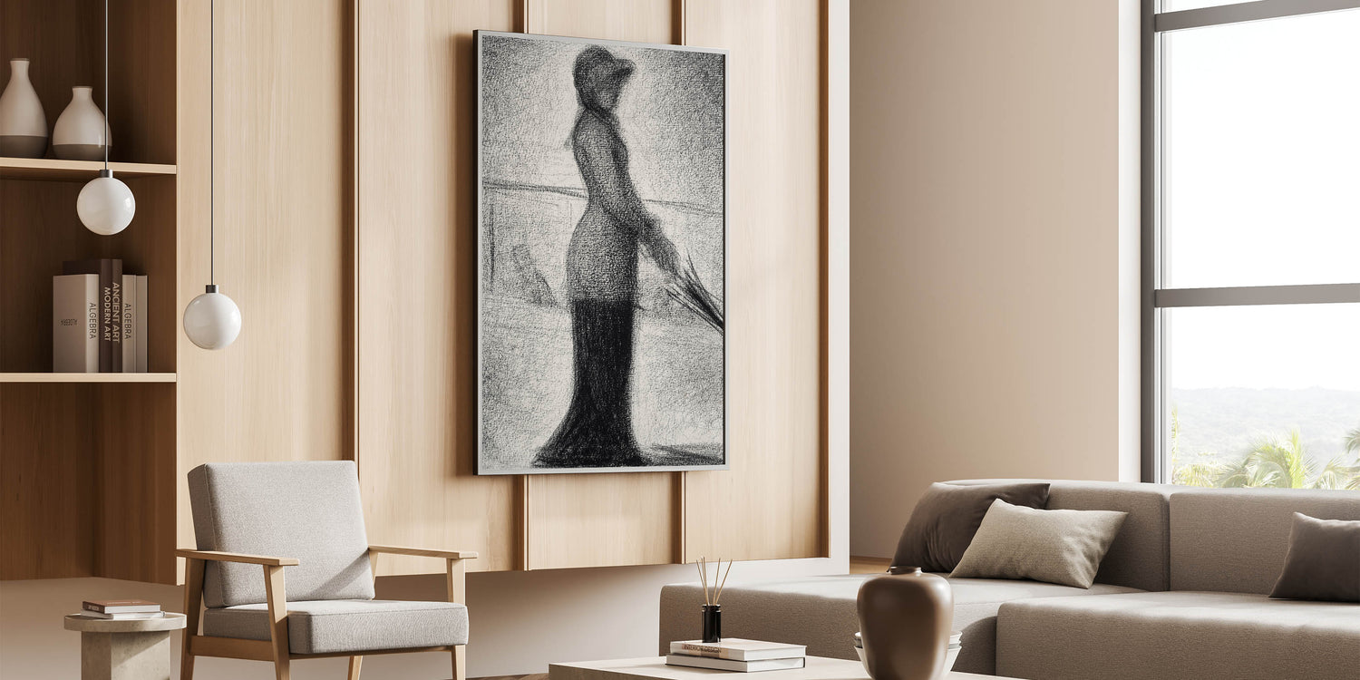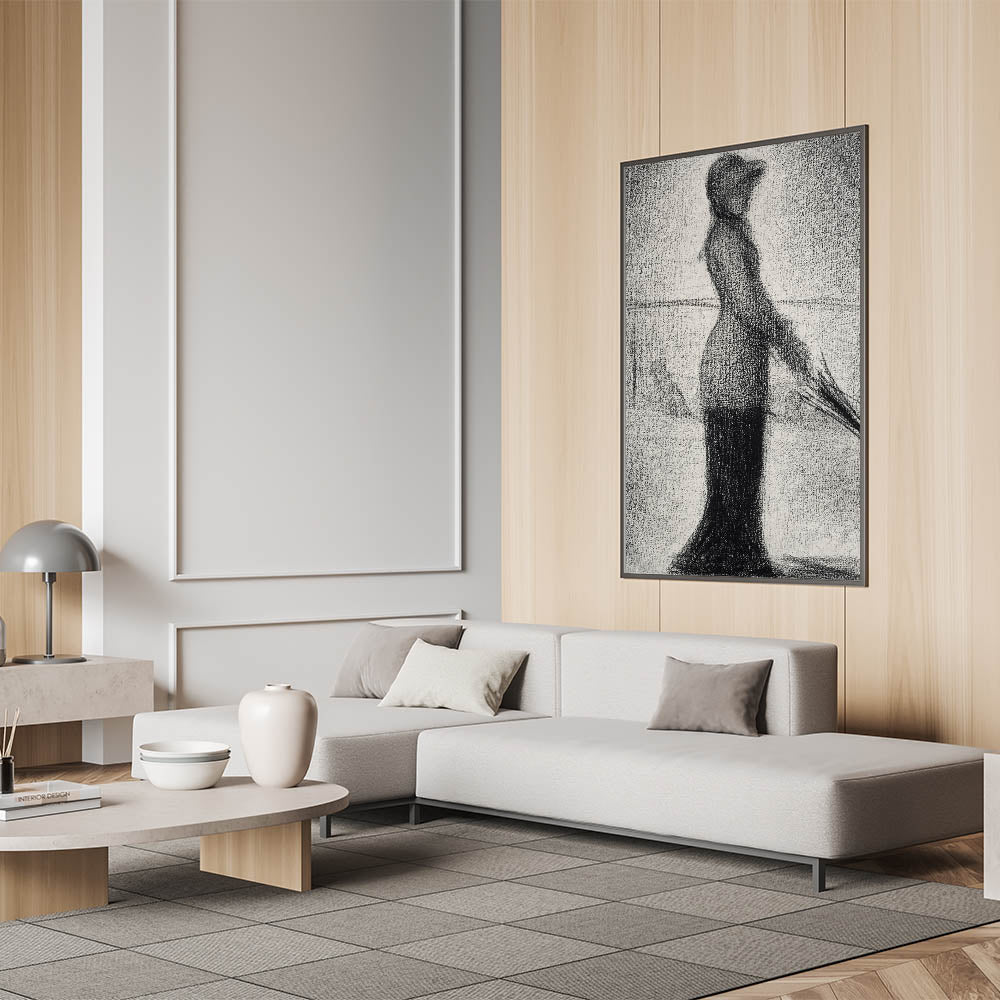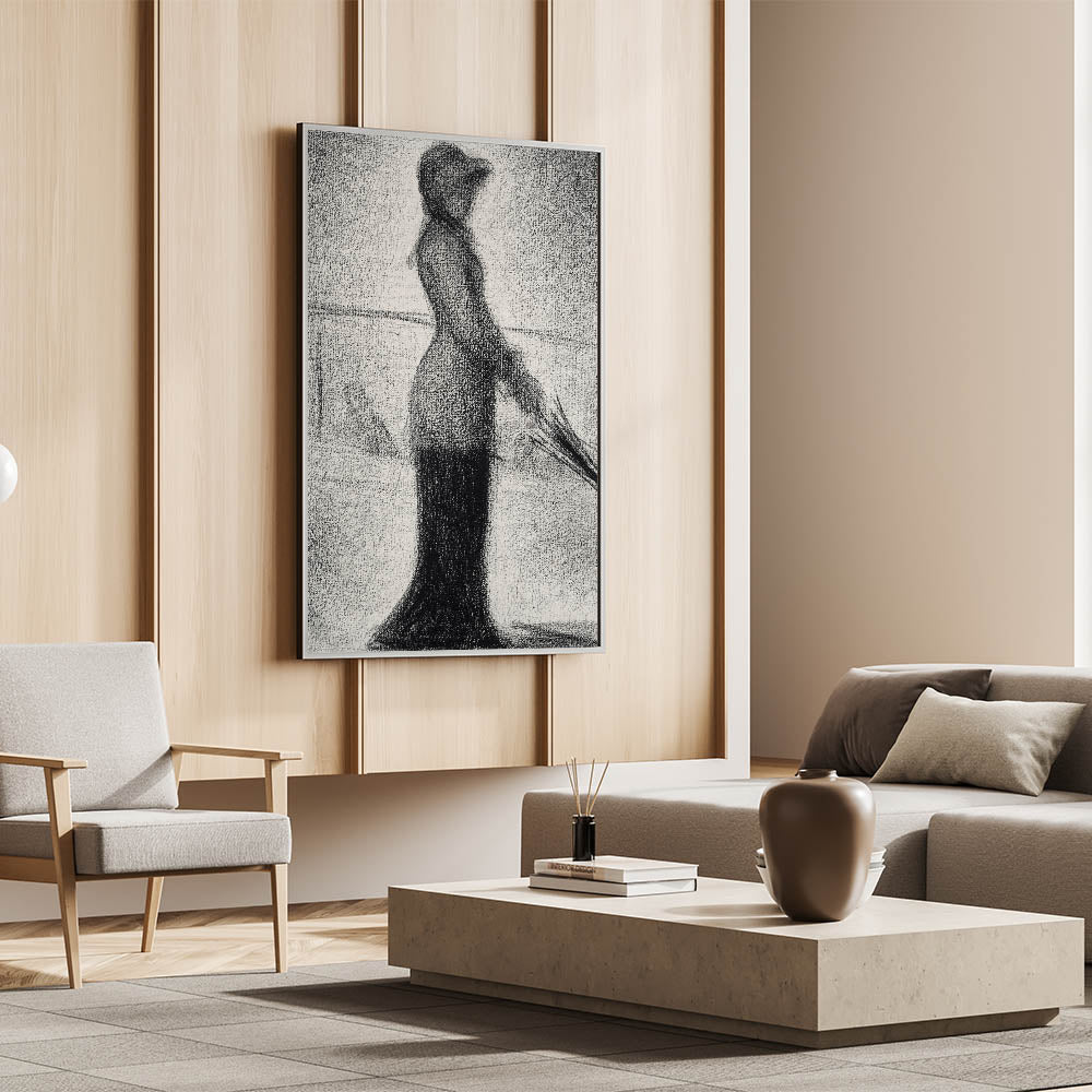 Enhance your decor with this graceful monochromatic artwork by Georges Seurat, Woman with Parasol. This piece captures the silhouette of a woman holding a parasol, rendered in Seurat’s distinctive Pointillism technique, creating a soft, textured effect. The simplicity and elegance of the composition make it perfect for minimalist and modern interiors, bringing an understated sophistication to any space. Ideal for those who appreciate fine detail and serene compositions, this artwork adds a quiet beauty to living rooms, studies, or personal retreats.