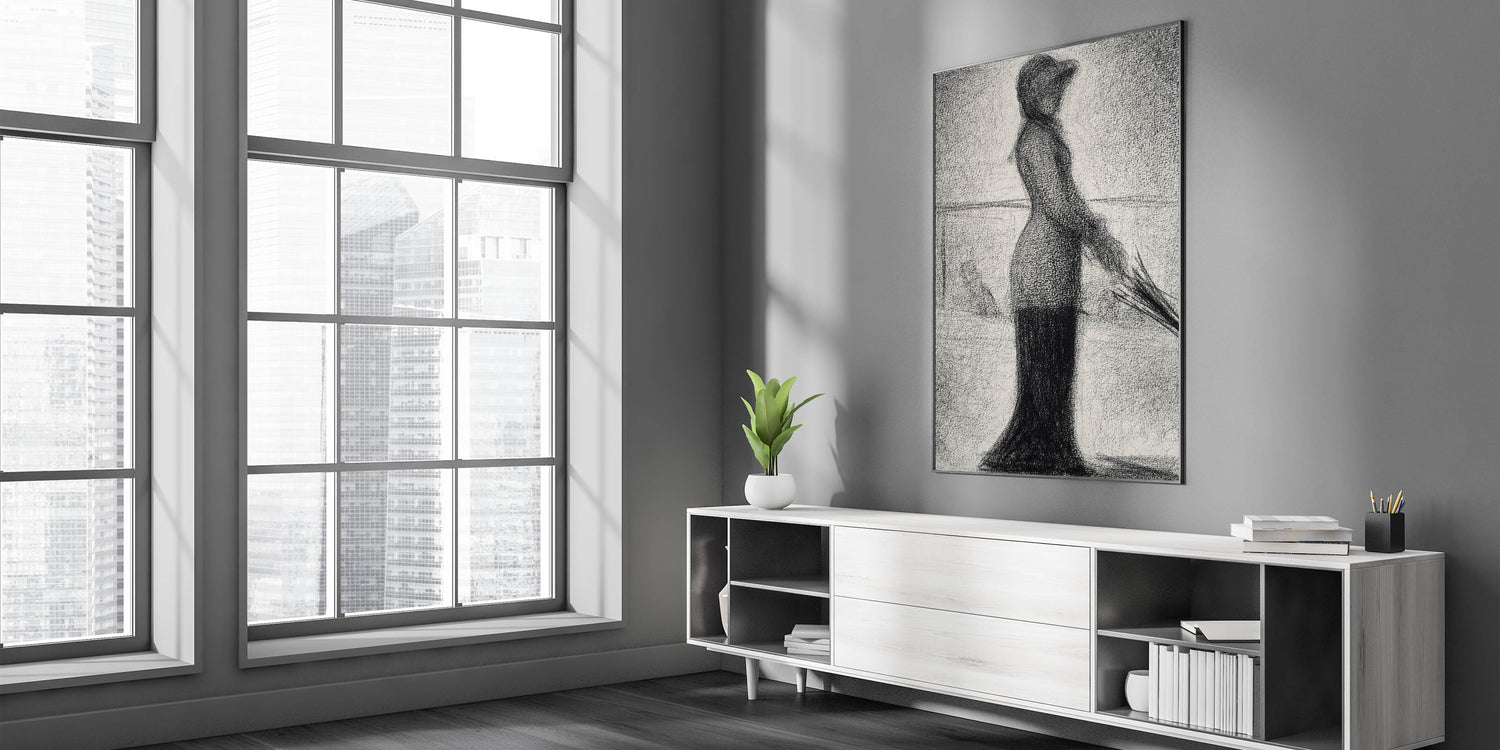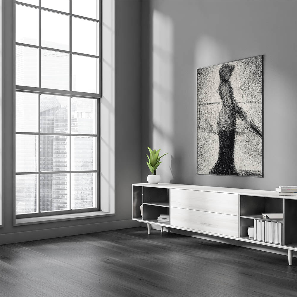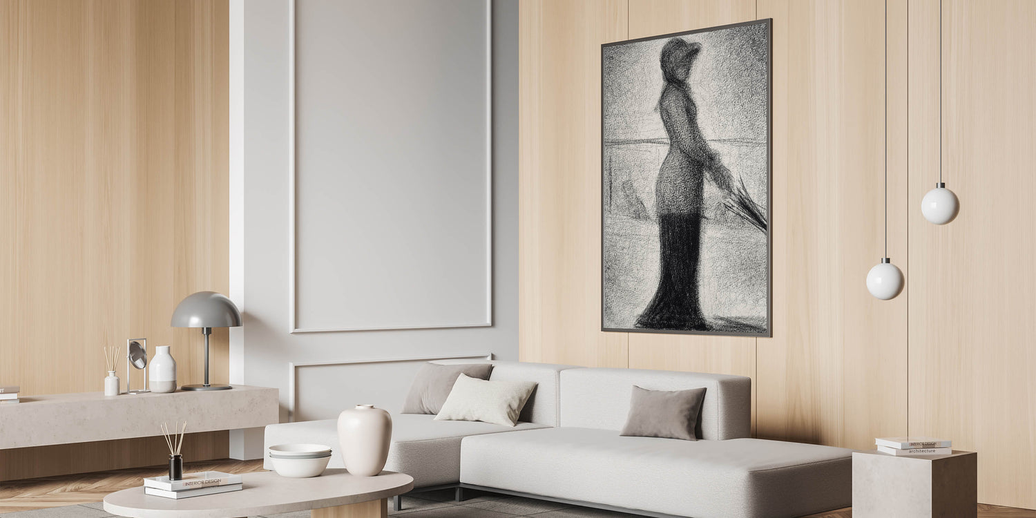 Enhance your decor with this graceful monochromatic artwork by Georges Seurat, Woman with Parasol. This piece captures the silhouette of a woman holding a parasol, rendered in Seurat’s distinctive Pointillism technique, creating a soft, textured effect. The simplicity and elegance of the composition make it perfect for minimalist and modern interiors, bringing an understated sophistication to any space. Ideal for those who appreciate fine detail and serene compositions, this artwork adds a quiet beauty to living rooms, studies, or personal retreats.