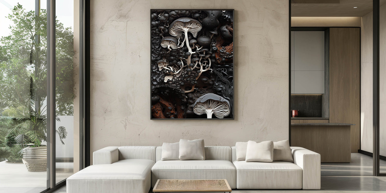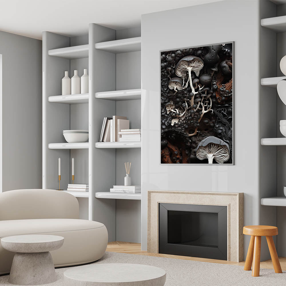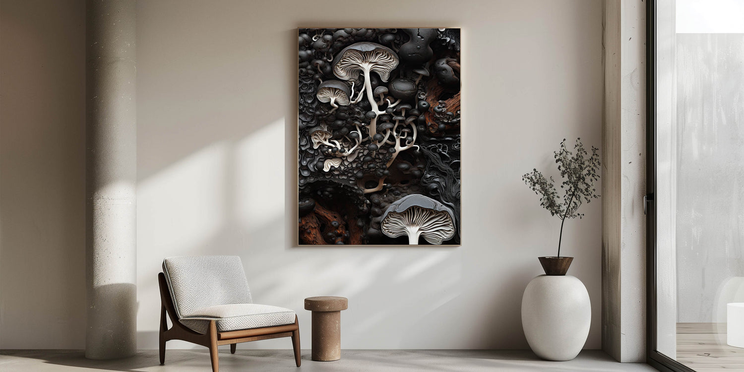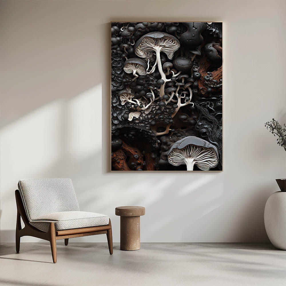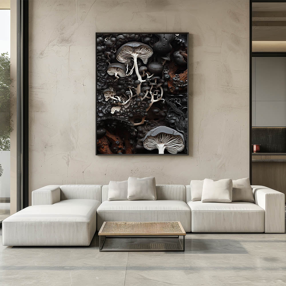 Dive into the mysterious depths of the forest with this moody mushroom macro wall art. The artwork captures the intricate details of delicate mushrooms set against a dark, textured backdrop. Shades of black, brown, and cream come together to highlight the complex forms and organic patterns, creating a sense of depth and drama. This piece is a perfect choice for anyone seeking a nature-inspired decor element with a hint of mystique.