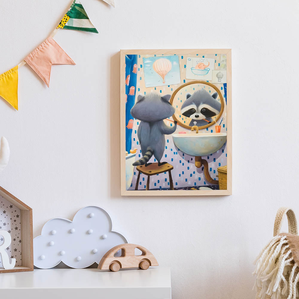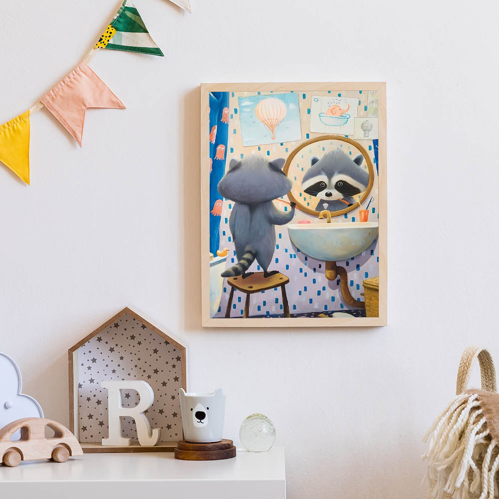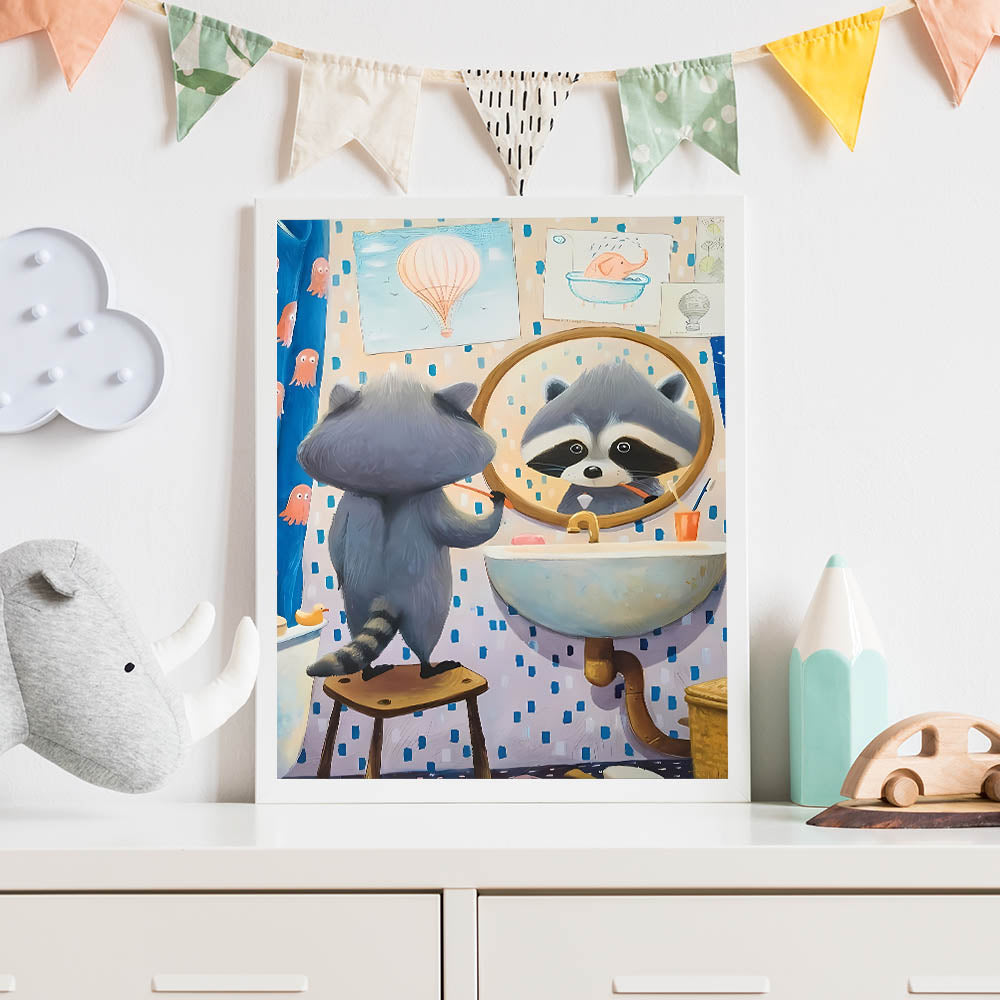 Add a touch of fun and whimsy to your child’s space with this Morning Raccoon wall art. This delightful illustration features an adorable raccoon standing on a stool in front of a mirror, getting ready for the day. The cozy bathroom setting, playful details like the toothbrush, duck, and charming wall drawings, make this children’s room decor a perfect fit for any boys' bedroom, nursery, or playroom.