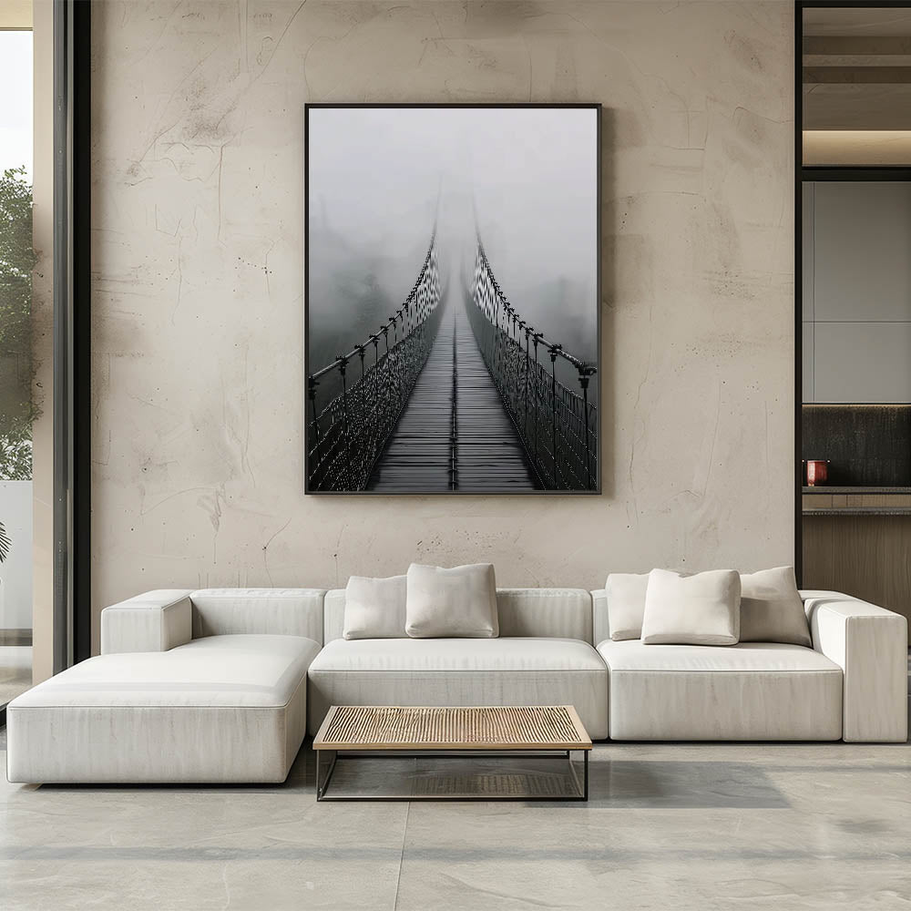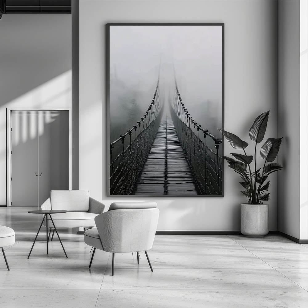 Step into a world of mystery and serenity with this foggy suspension bridge wall art. Captured in black and white, this artwork showcases a suspension bridge vanishing into a dense fog, creating a sense of depth and intrigue. The minimalist and atmospheric composition makes it perfect for contemporary, modern, or rustic interiors. Whether displayed in a living room, bedroom, or office, this piece evokes a timeless and contemplative ambiance.