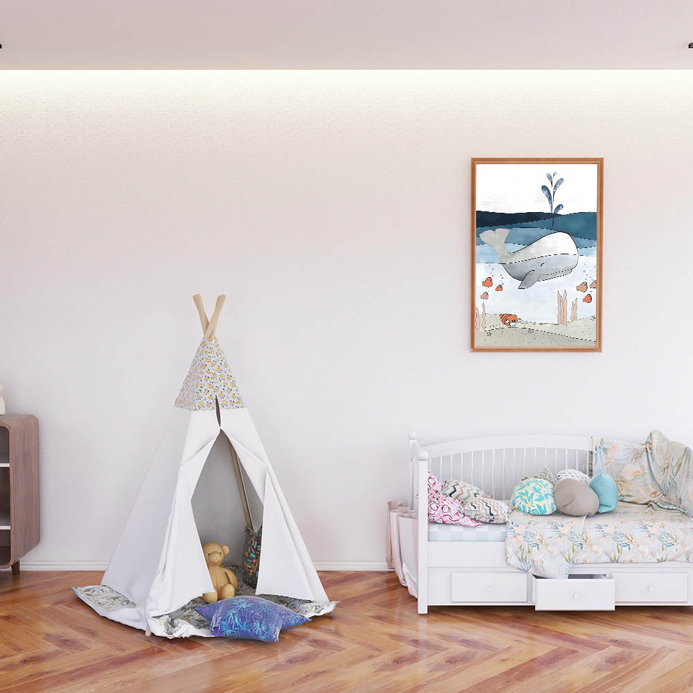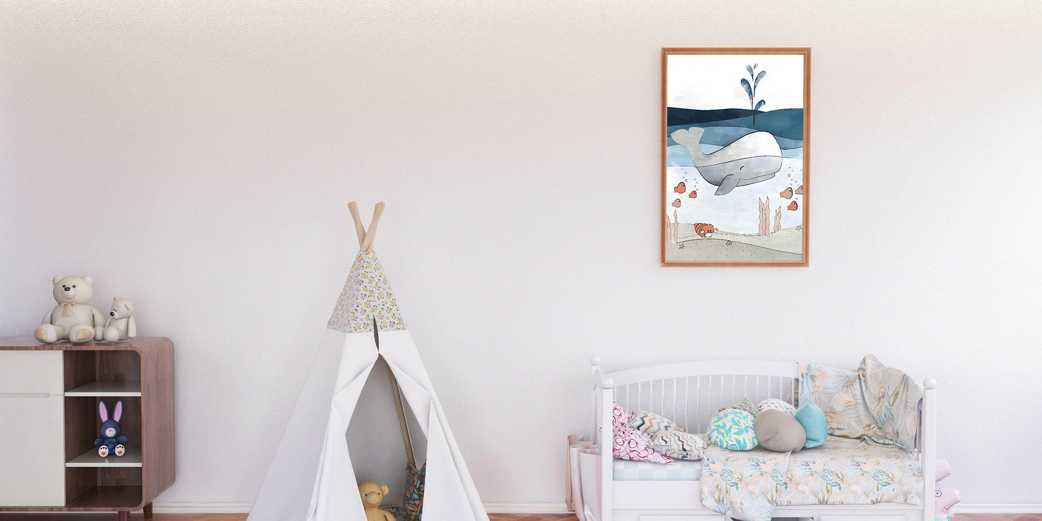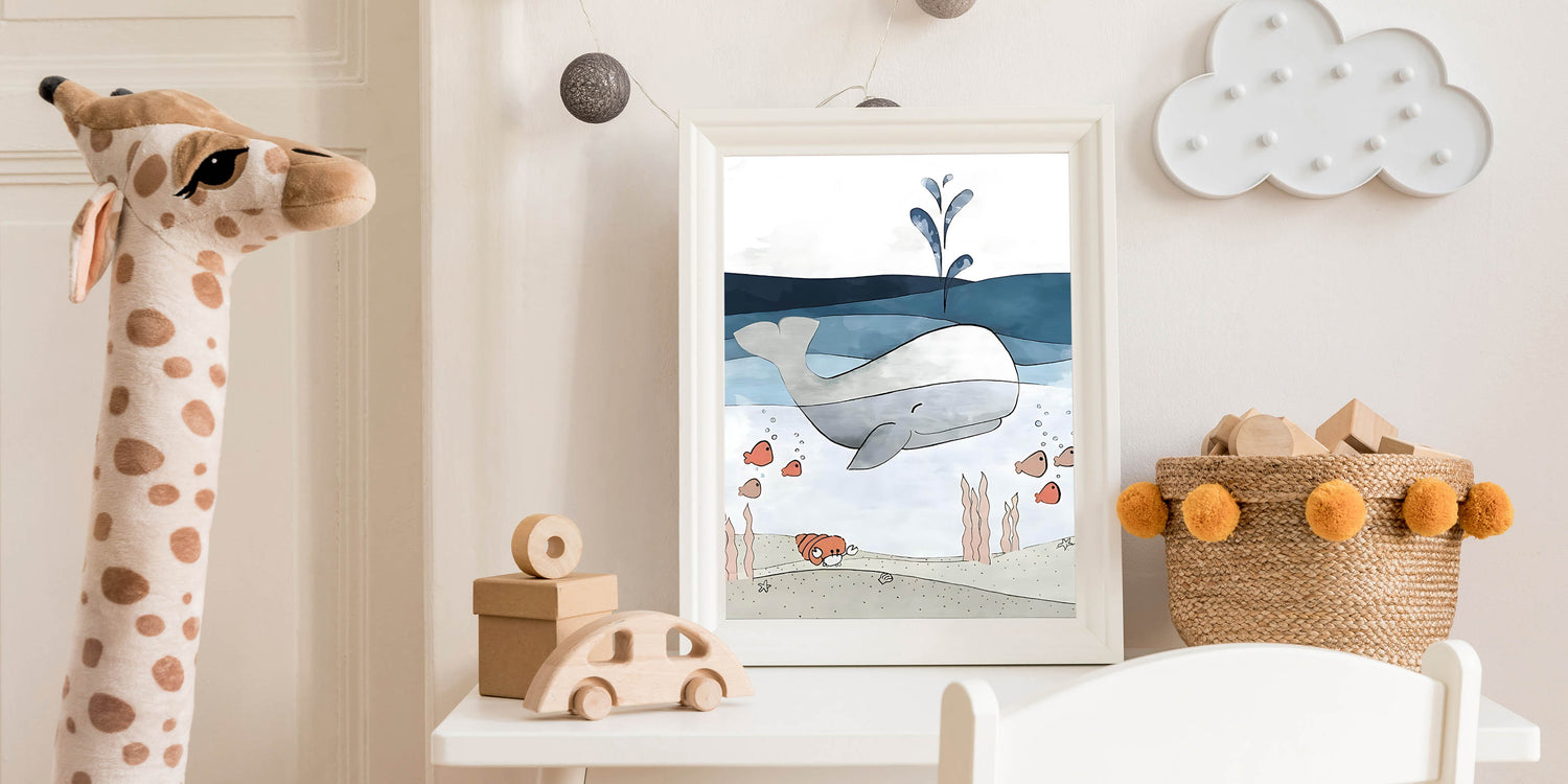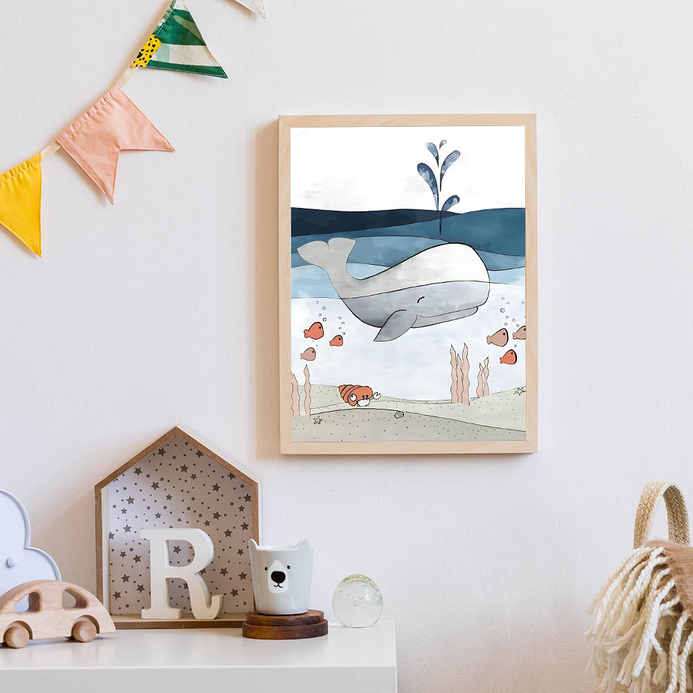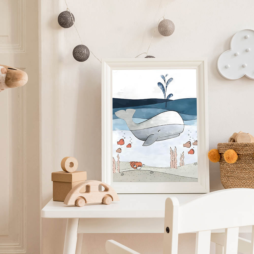 Transform your child’s space into a soothing underwater world with this nursery wall art featuring a peaceful whale surrounded by ocean life. The soft blues and neutral tones create a calming atmosphere, making it an excellent choice for boys’ bedroom art, kids wall art prints, and playroom wall art.
