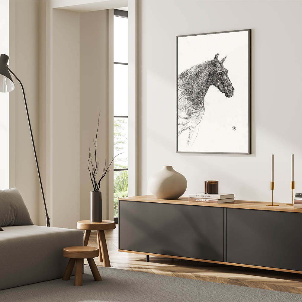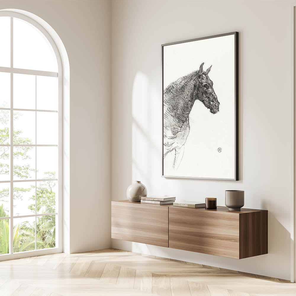 Capture the raw beauty of "Old Horse," an elegant Impressionist sketch by Henri de Toulouse-Lautrec. This black-and-white drawing highlights the expressive power of line work, portraying the timeless strength and wisdom of a horse. The minimalist design and intricate details create a striking piece that blends simplicity with artistic sophistication.
