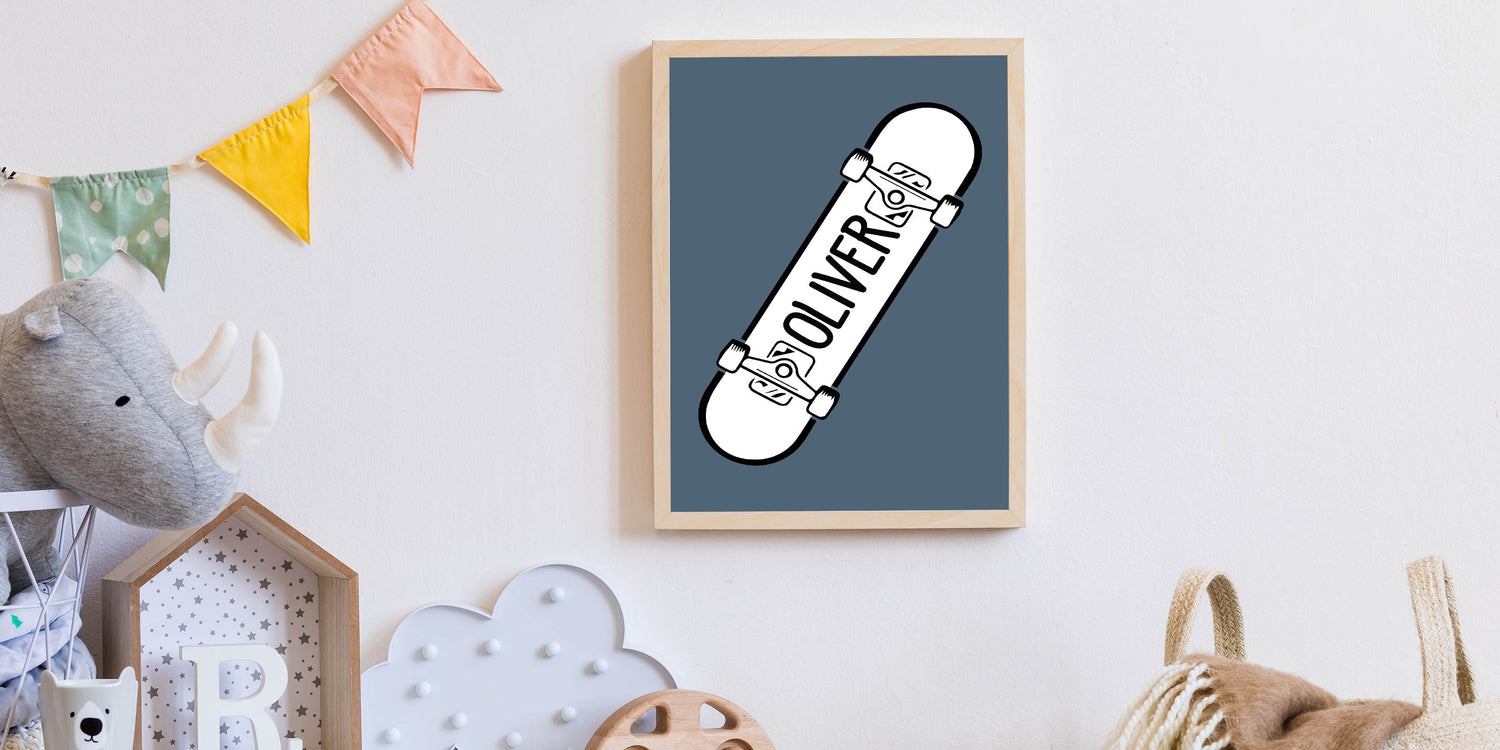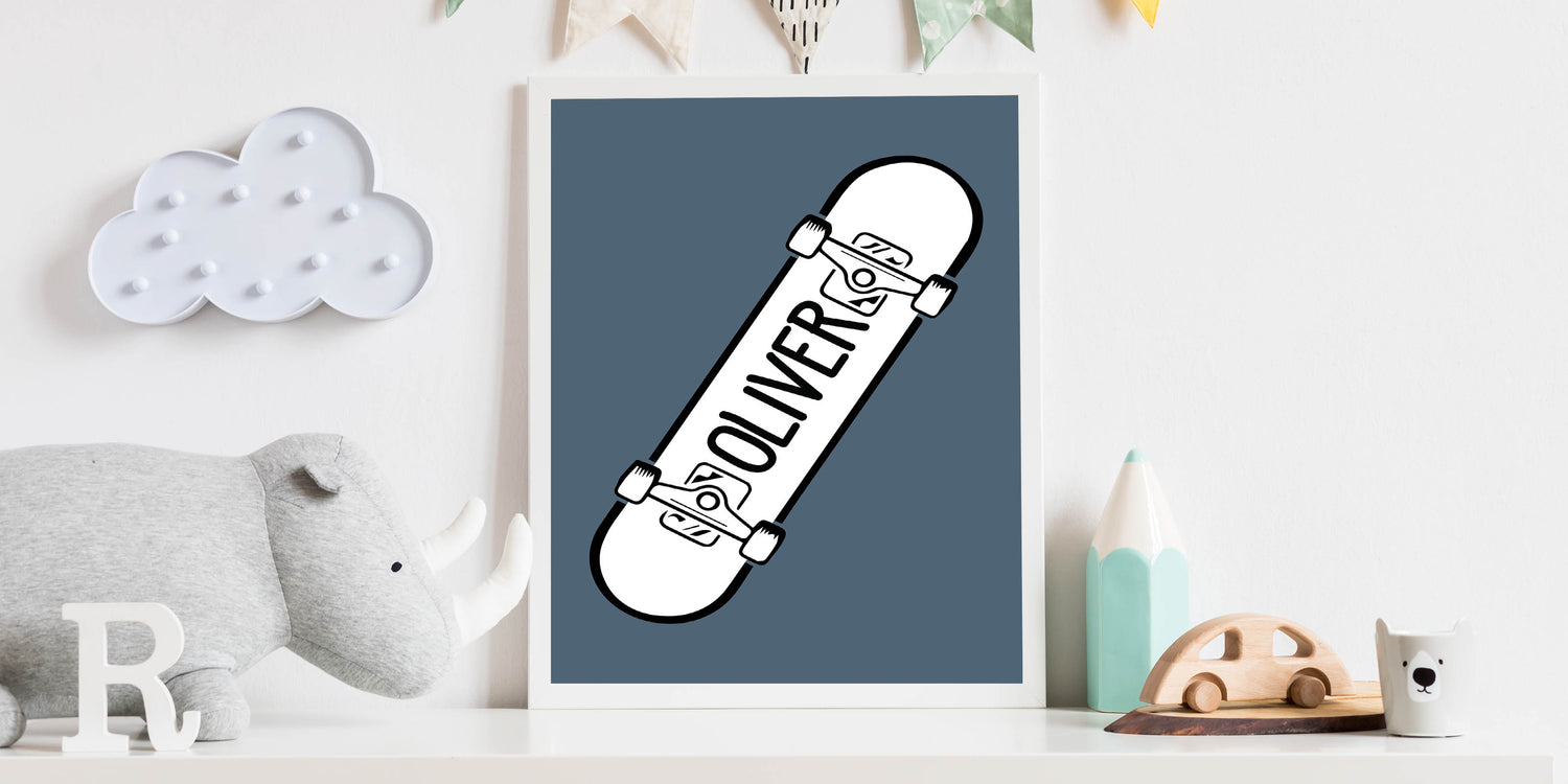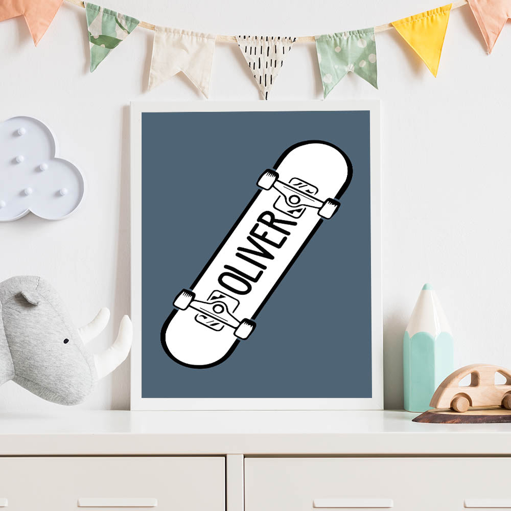 Add a custom and cool touch to your child’s space with this Personalized Skateboard wall art, a perfect piece for young skaters and action sports lovers. Featuring a bold black and white skateboard design with a customizable name on a muted blue background, this artwork is perfect for bringing an urban, adventurous vibe to any boys' bedroom, playroom, or nursery.