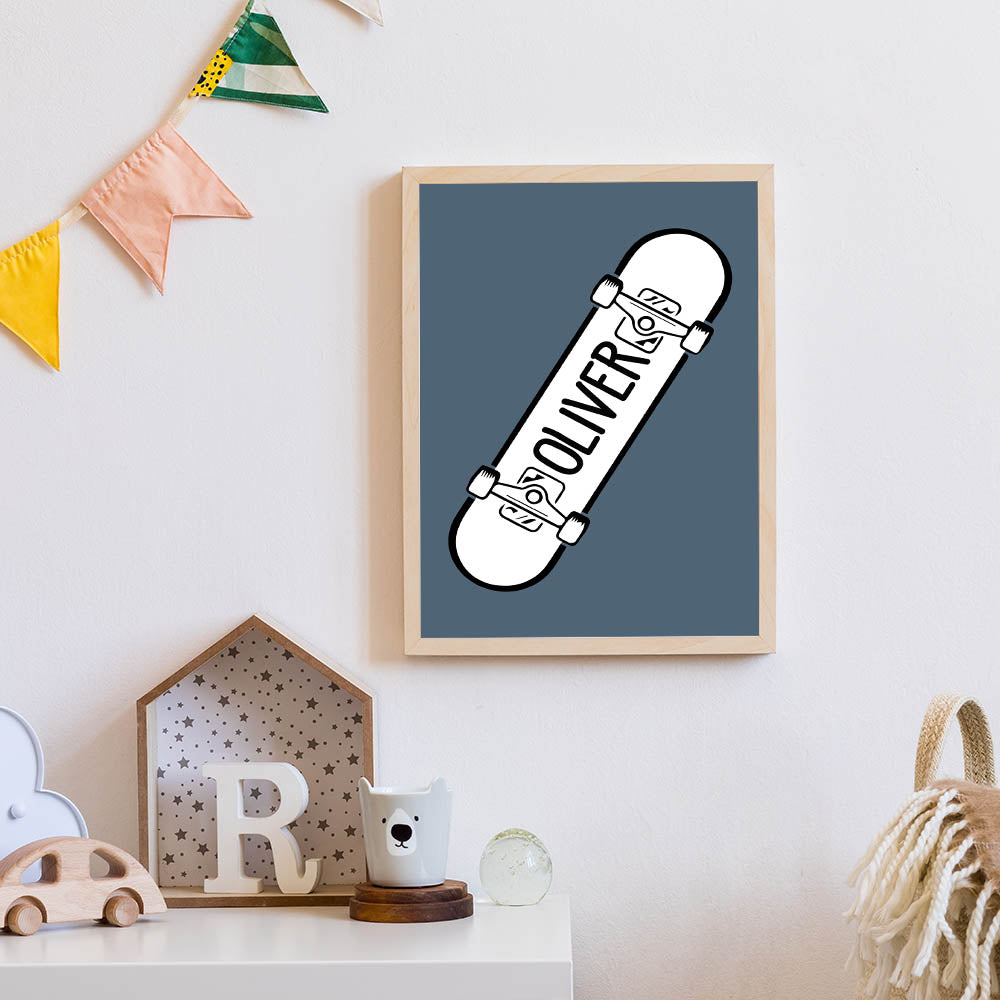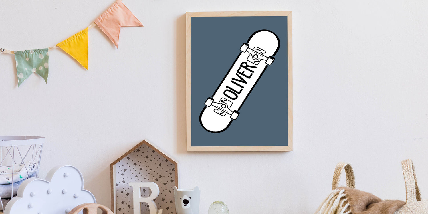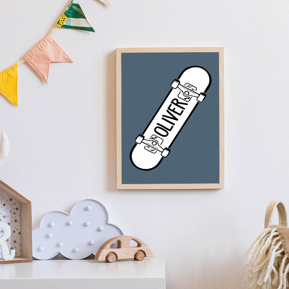 Add a custom and cool touch to your child’s space with this Personalized Skateboard wall art, a perfect piece for young skaters and action sports lovers. Featuring a bold black and white skateboard design with a customizable name on a muted blue background, this artwork is perfect for bringing an urban, adventurous vibe to any boys' bedroom, playroom, or nursery.