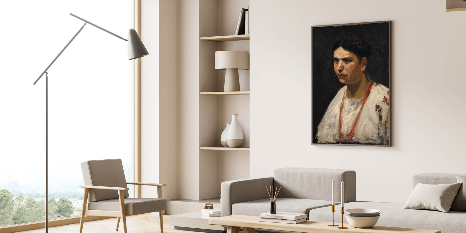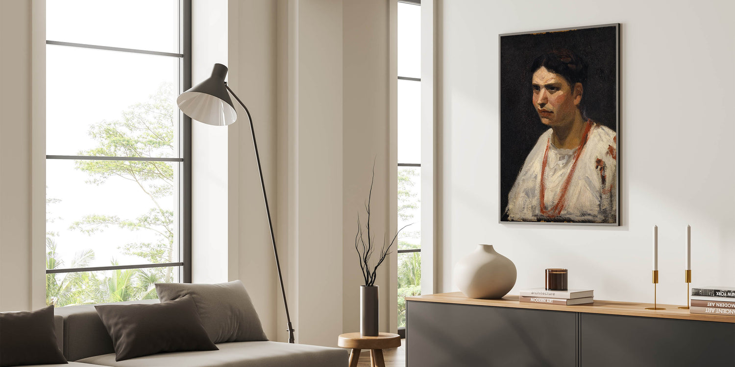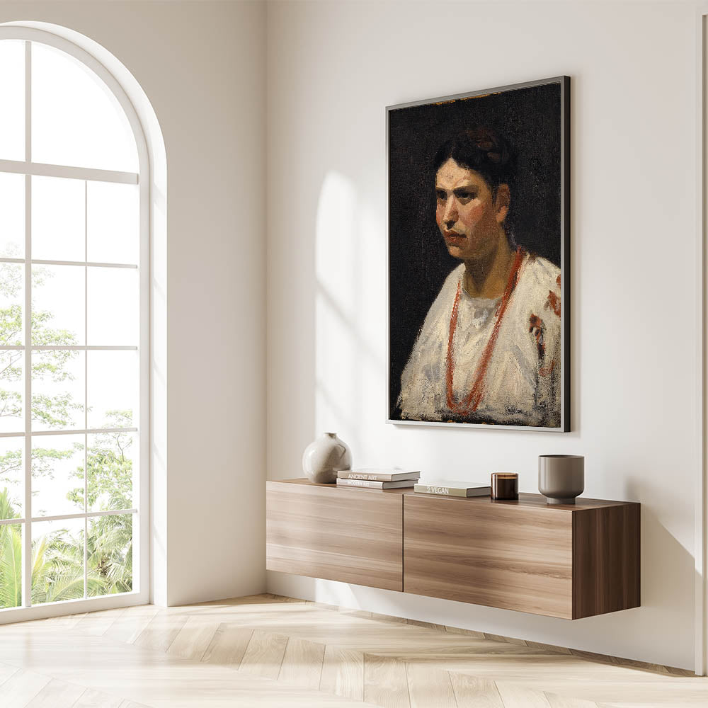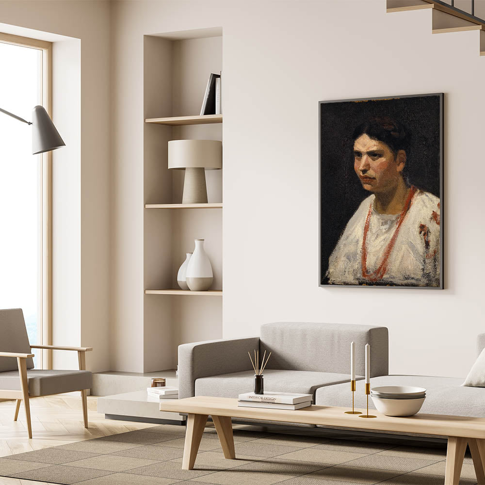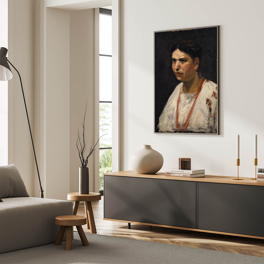 Infuse elegance and depth into your space with the "Portrait of a Girl Modern Wall Art." This stunning artwork captures the essence of minimalist modern decor with its dark background and intricate portrait details. The soft contrasts of white, red, and earthy tones add a timeless charm, making it an exquisite choice for contemporary art enthusiasts. Perfect for trendy home decor, this piece embodies unique modern art with a focus on emotion and character.