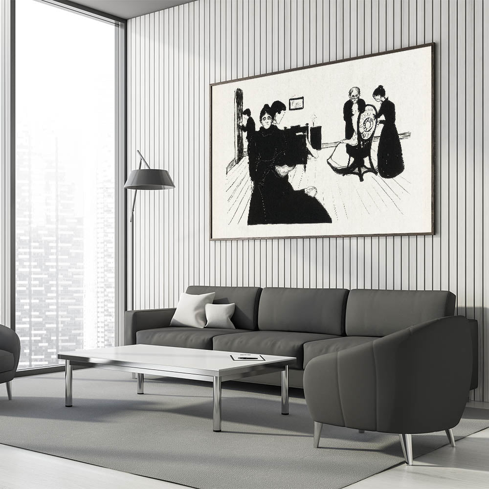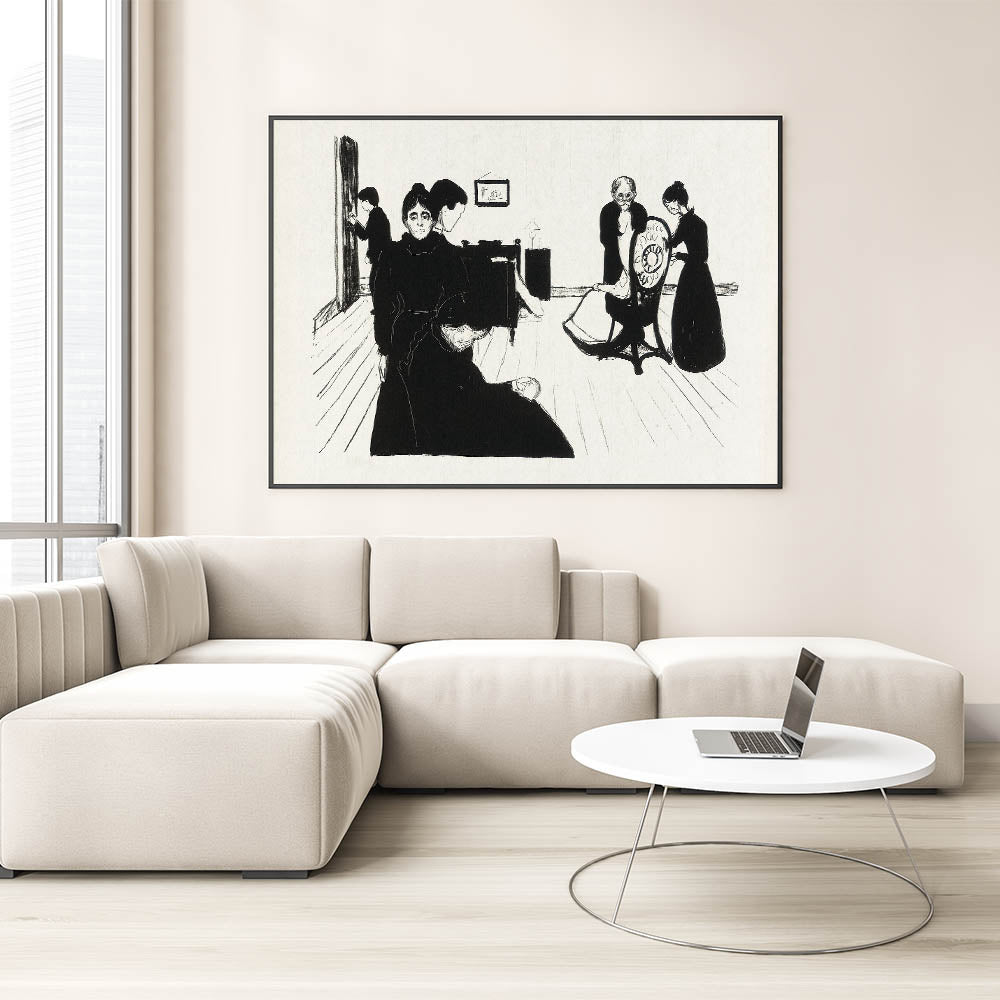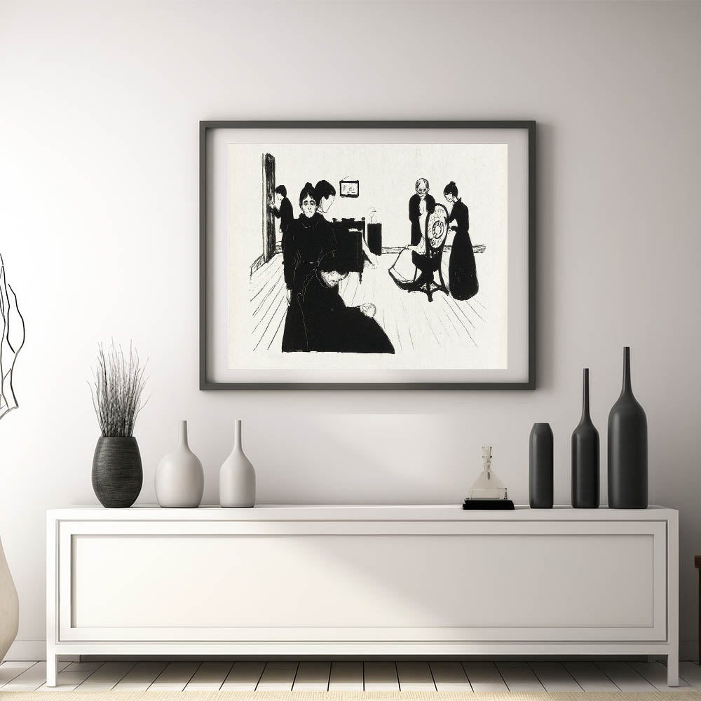 Explore the haunting depths of Expressionist Art with Death in the Sickroom by Edvard Munch, an iconic piece that captures raw emotion and the stark realities of life and death. This Modern Expressionism artwork depicts a moment of mourning, with figures in mourning clothes set against a somber, minimal interior. The stark black and white contrasts convey the weight of grief and the intense emotional atmosphere, making it a deeply impactful addition to any collection.