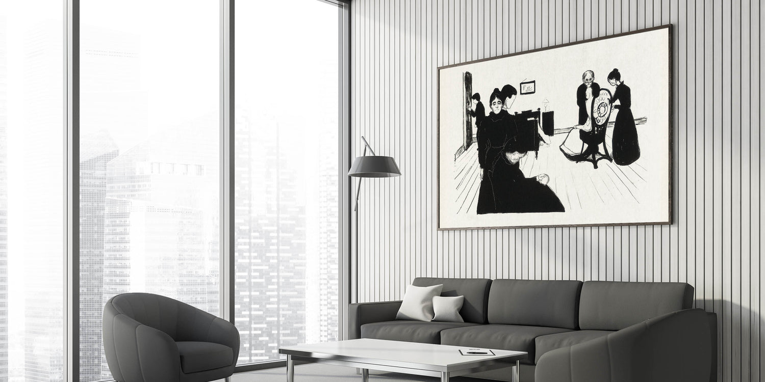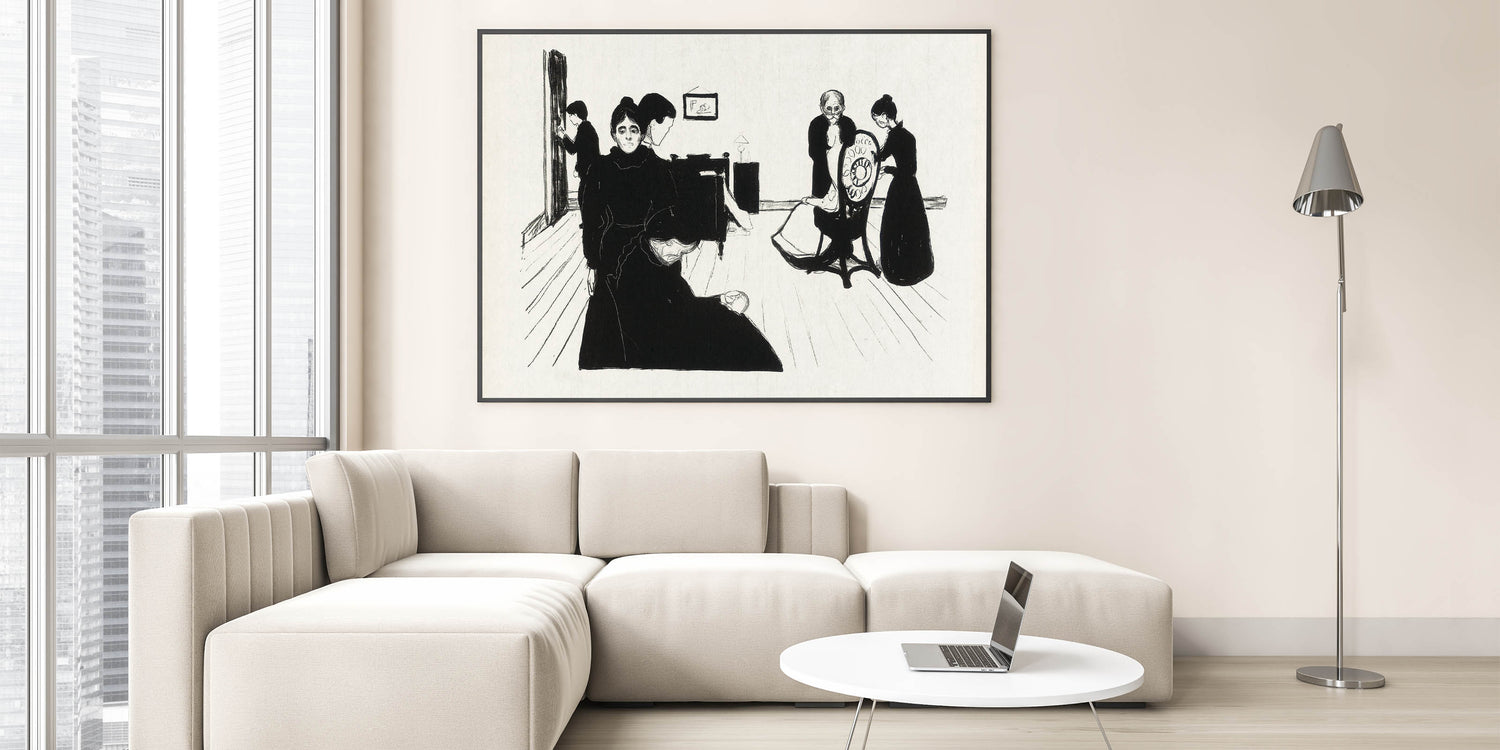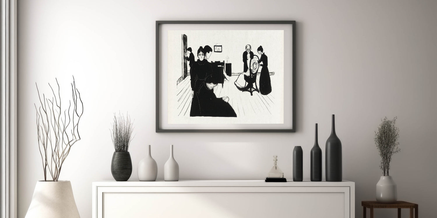 Explore the haunting depths of Expressionist Art with Death in the Sickroom by Edvard Munch, an iconic piece that captures raw emotion and the stark realities of life and death. This Modern Expressionism artwork depicts a moment of mourning, with figures in mourning clothes set against a somber, minimal interior. The stark black and white contrasts convey the weight of grief and the intense emotional atmosphere, making it a deeply impactful addition to any collection.