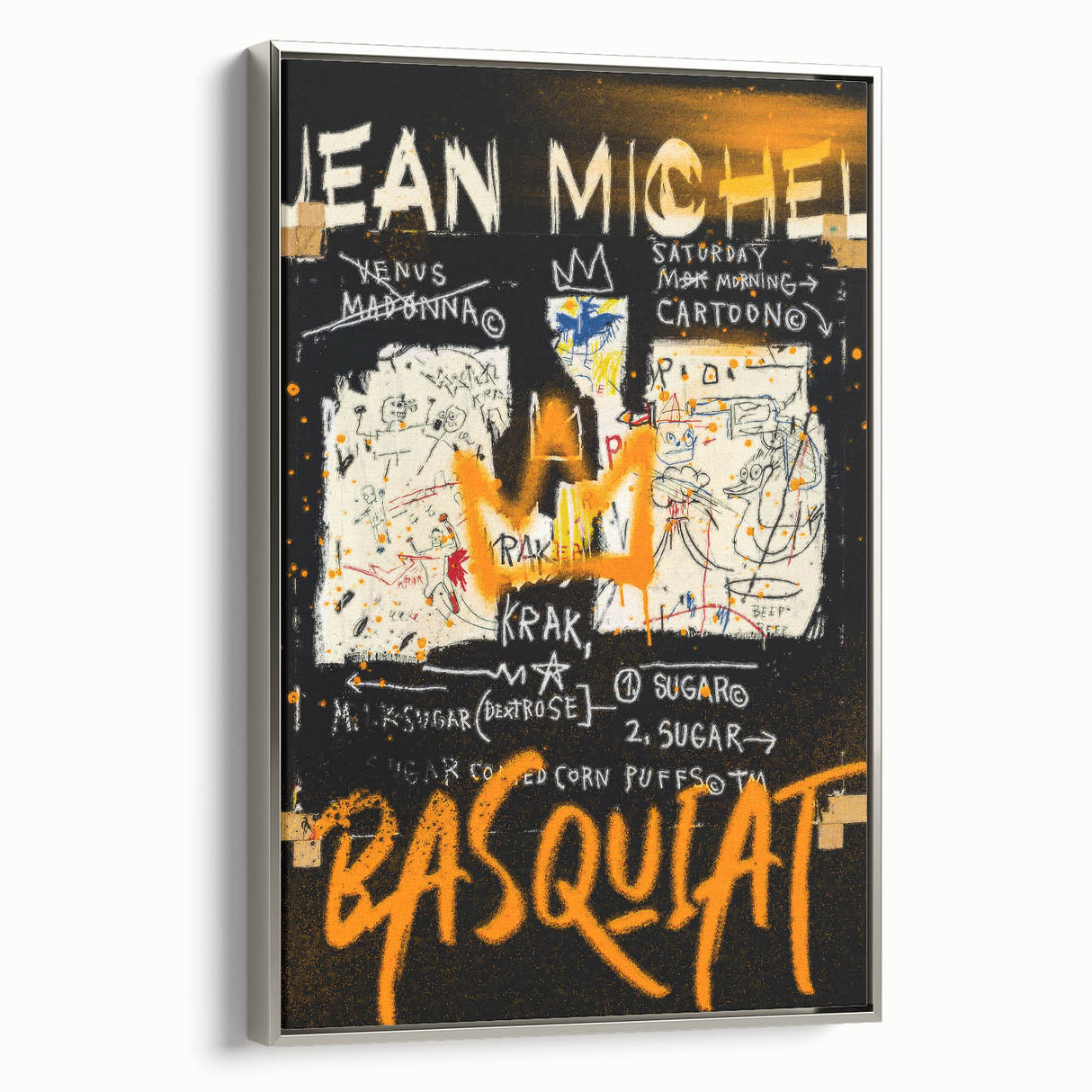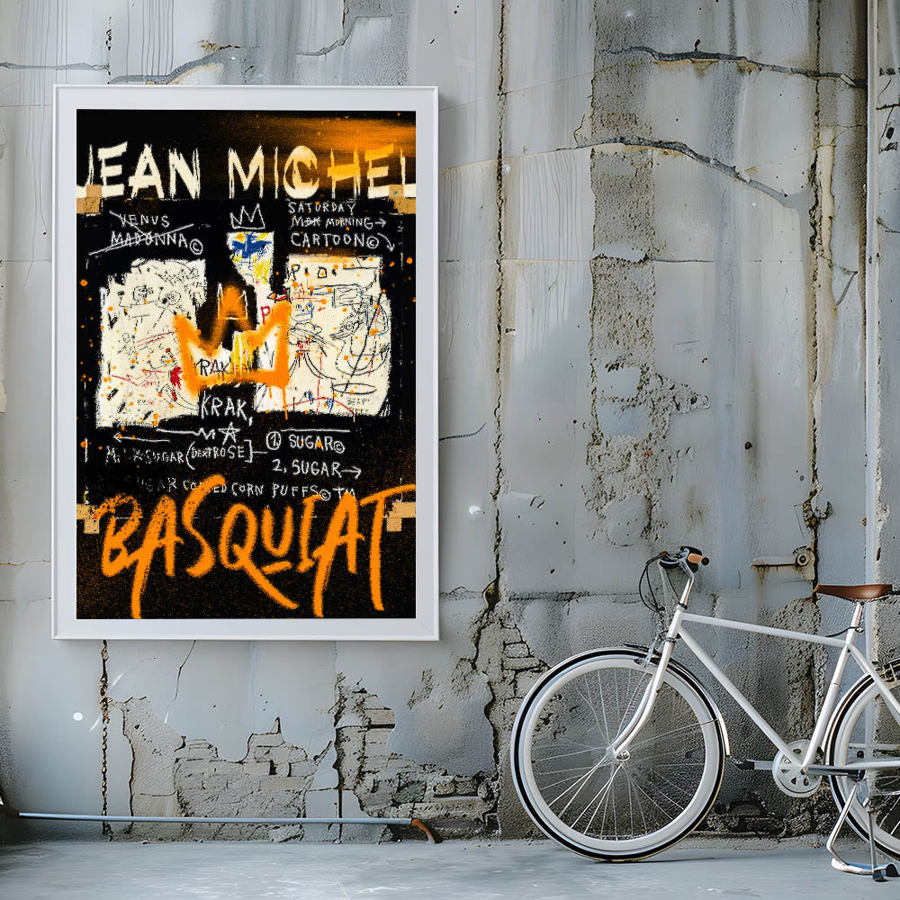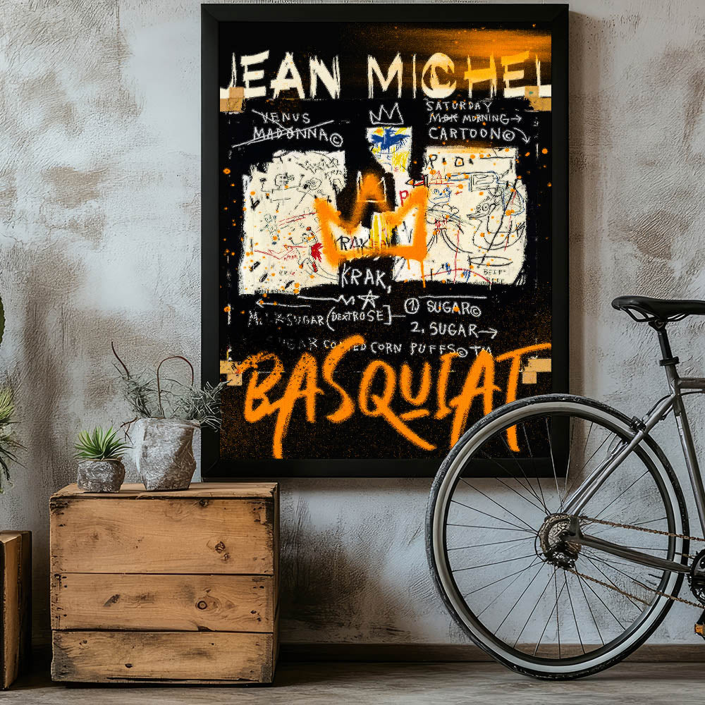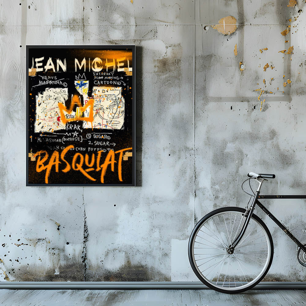 Capture the essence of urban art with this raw pop art wall art, inspired by the iconic graffiti style of Jean-Michel Basquiat. This artwork features a chaotic mix of white, orange, and yellow elements against a deep black backdrop, with hand-drawn text, symbols, and the iconic crown motif. The expressive strokes and layered elements create a powerful visual impact, making it a perfect statement piece for contemporary interiors.