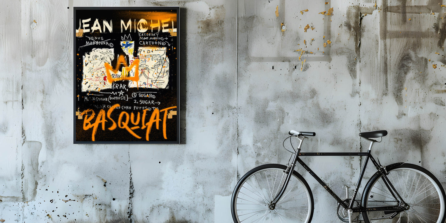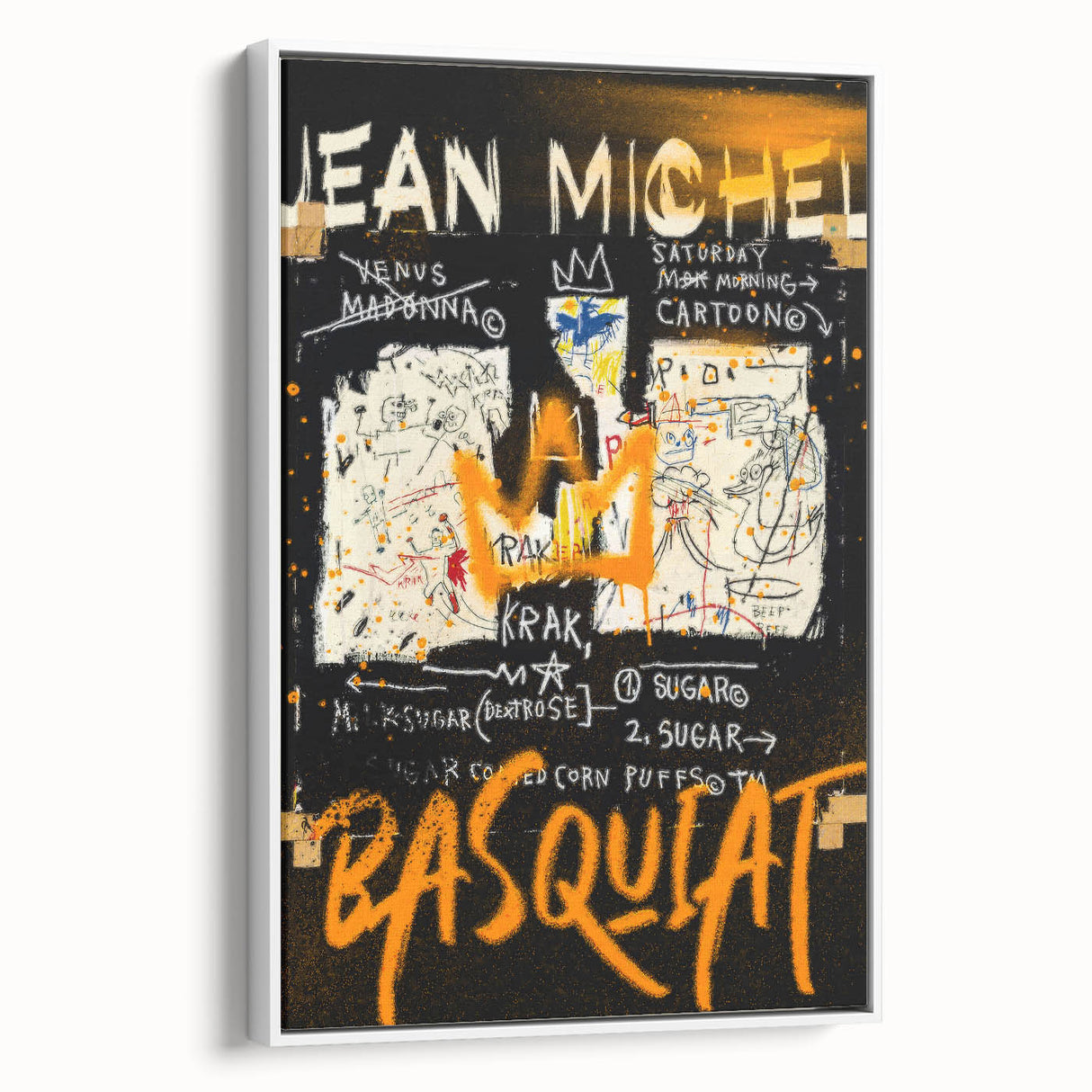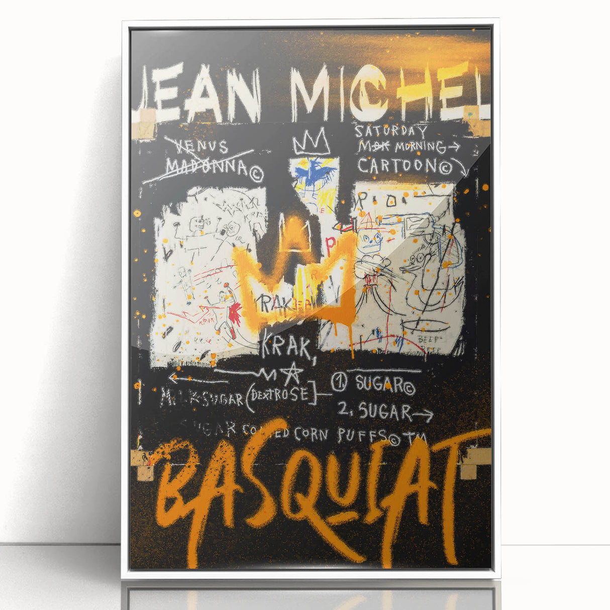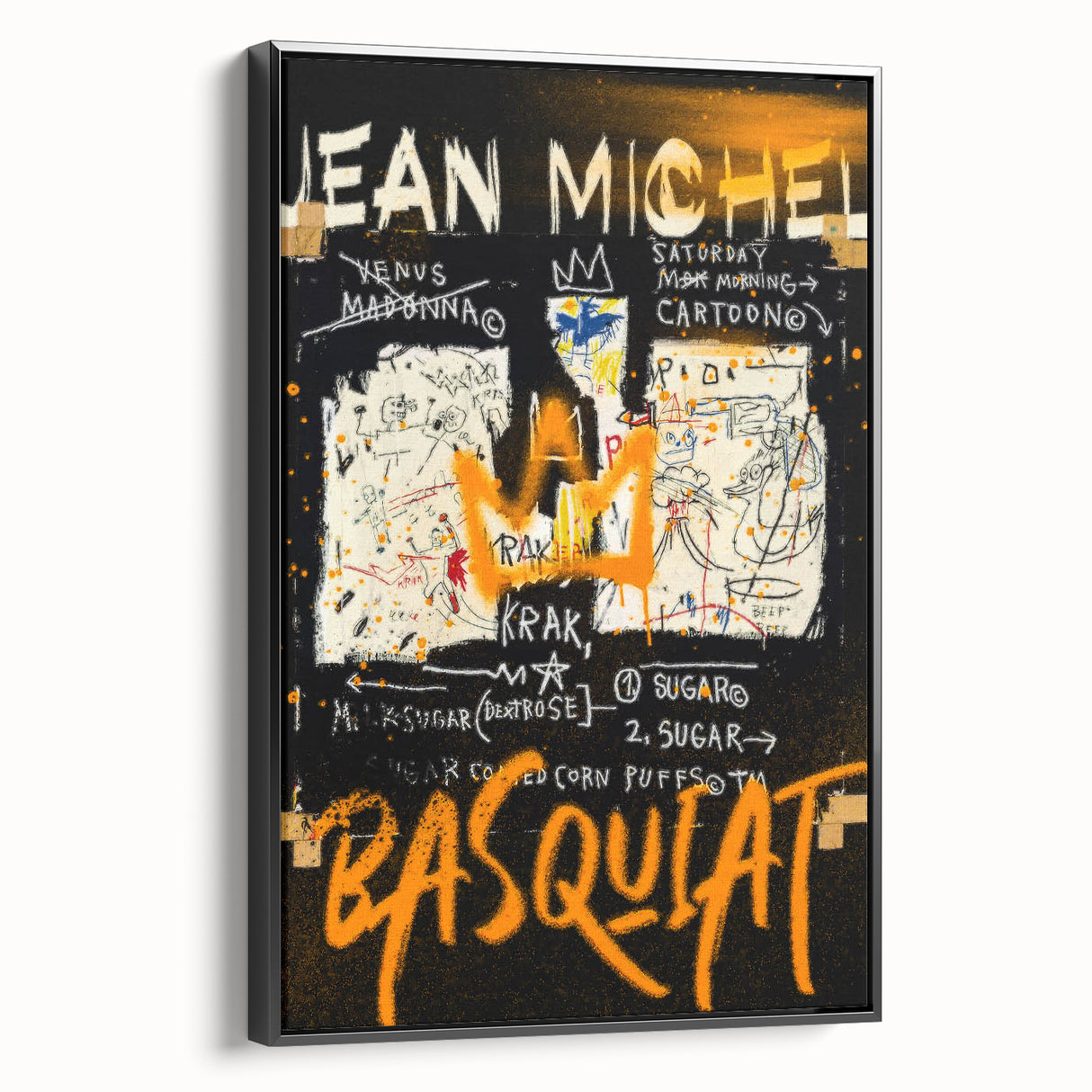 Capture the essence of urban art with this raw pop art wall art, inspired by the iconic graffiti style of Jean-Michel Basquiat. This artwork features a chaotic mix of white, orange, and yellow elements against a deep black backdrop, with hand-drawn text, symbols, and the iconic crown motif. The expressive strokes and layered elements create a powerful visual impact, making it a perfect statement piece for contemporary interiors.