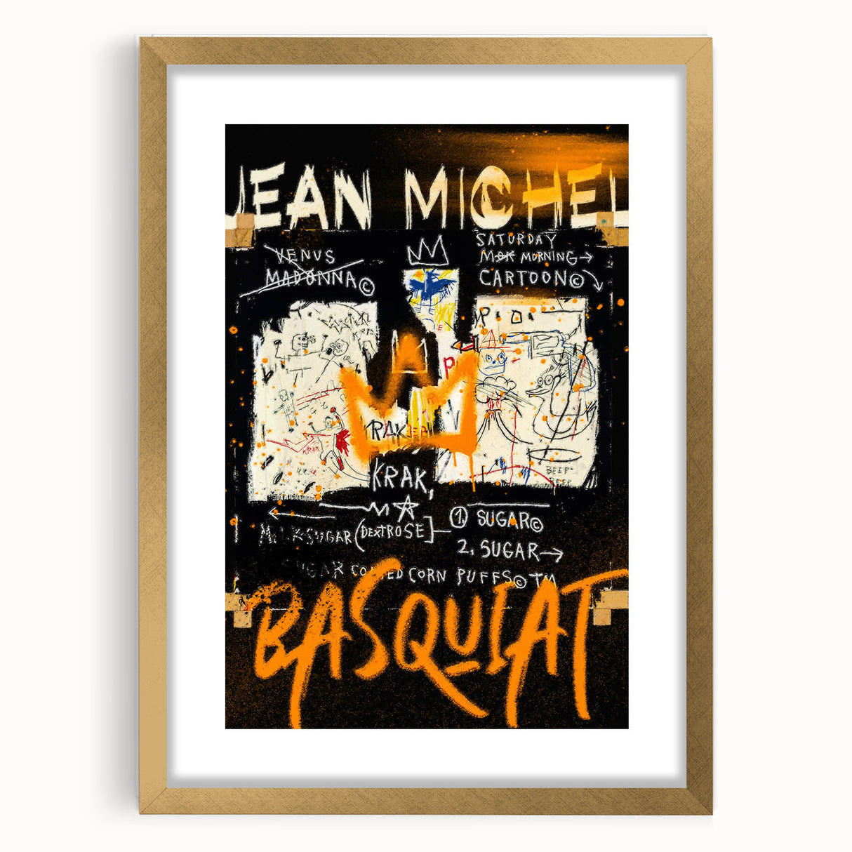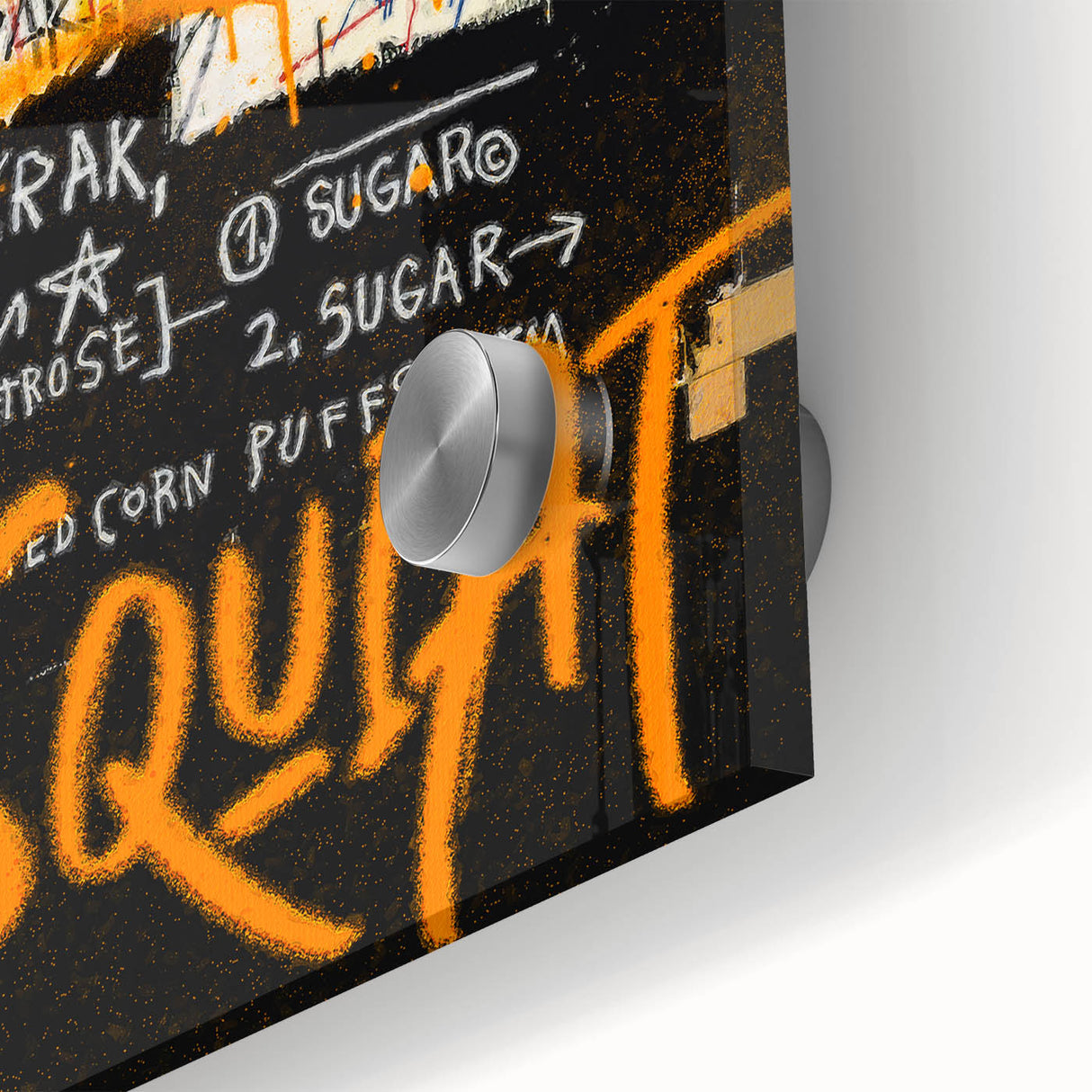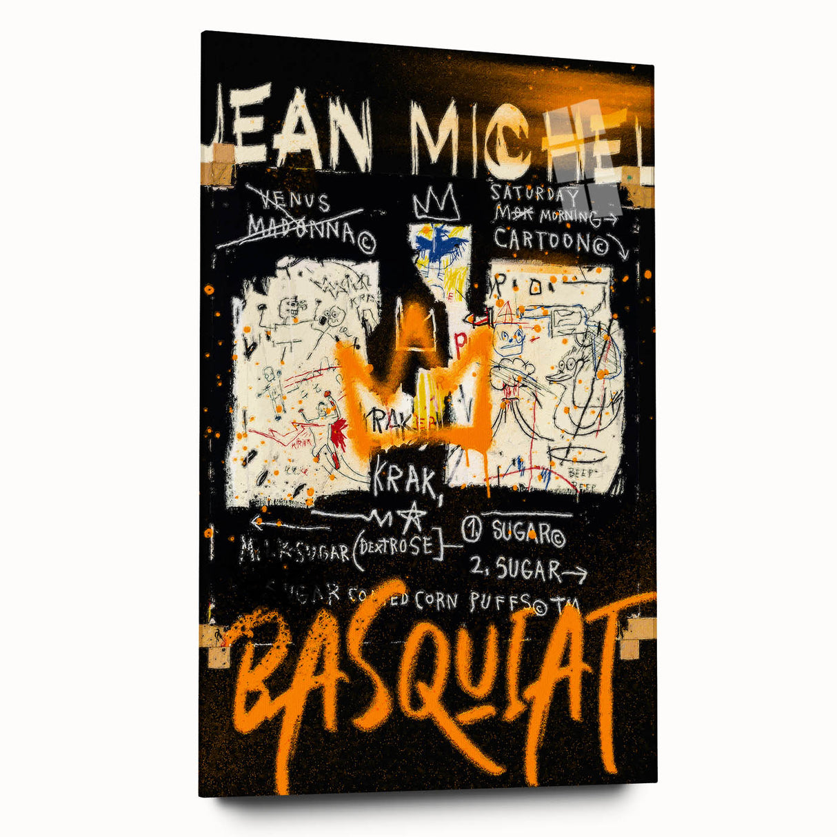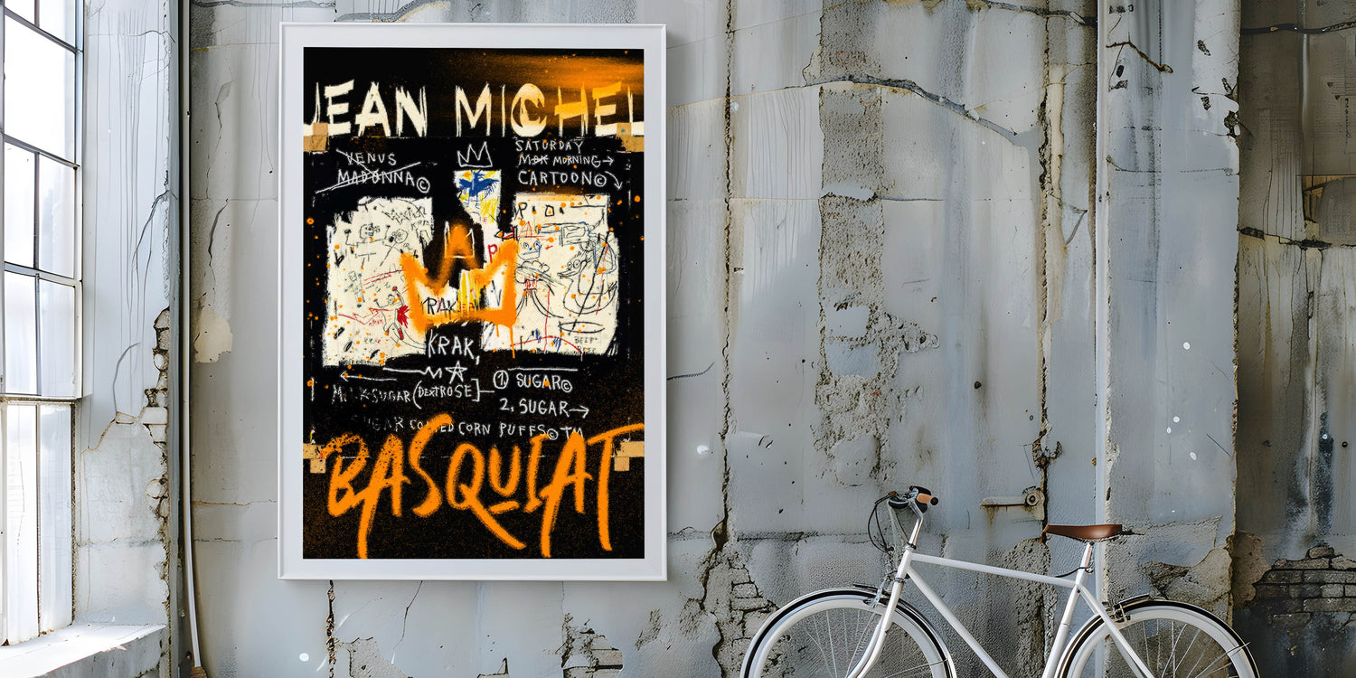Capture the essence of urban art with this raw pop art wall art, inspired by the iconic graffiti style of Jean-Michel Basquiat. This artwork features a chaotic mix of white, orange, and yellow elements against a deep black backdrop, with hand-drawn text, symbols, and the iconic crown motif. The expressive strokes and layered elements create a powerful visual impact, making it a perfect statement piece for contemporary interiors.