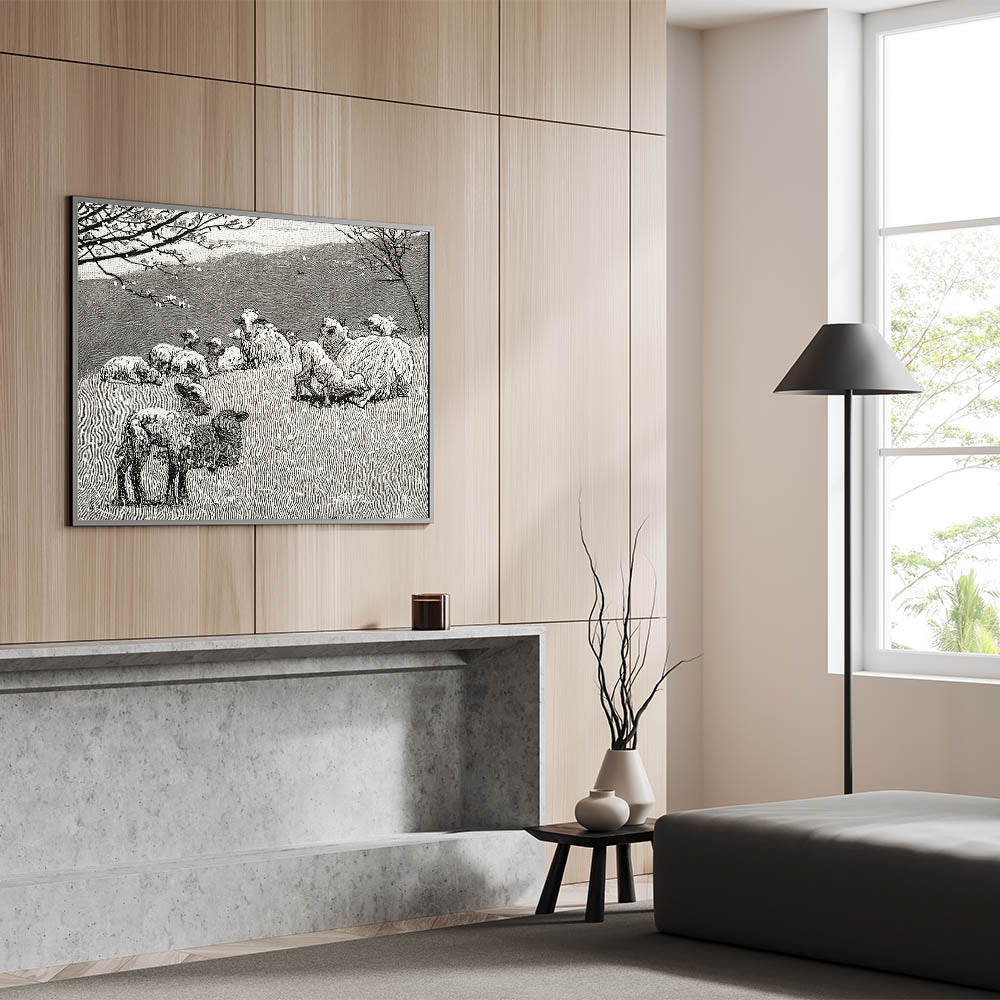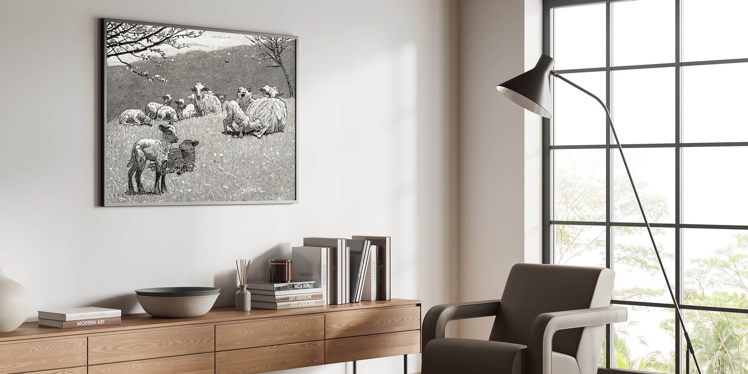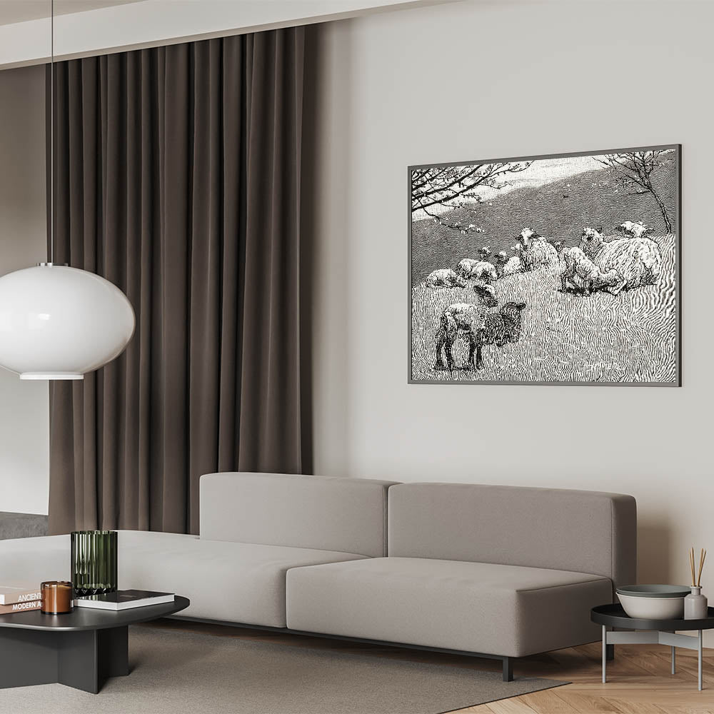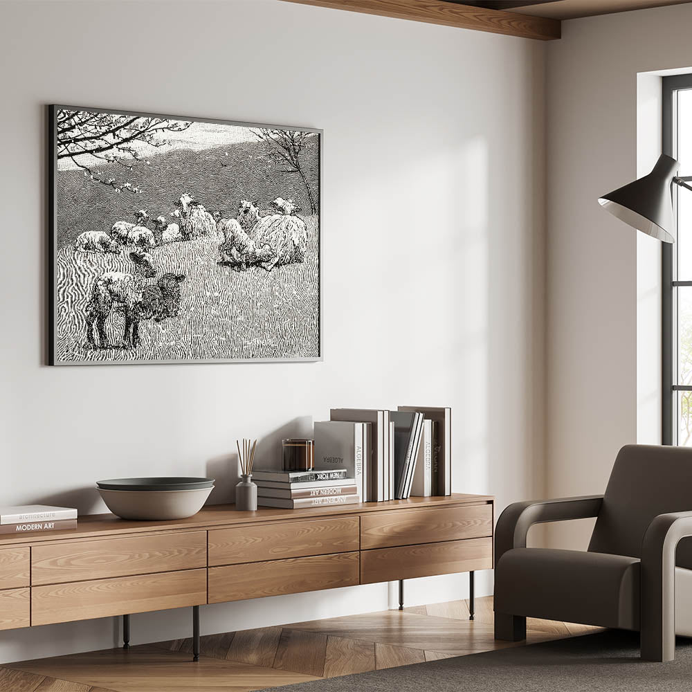 Celebrate the beauty of springtime and rural life with "Spring Lamb" by Winslow Homer. This monochromatic realism art print depicts a peaceful hillside with a flock of sheep and playful lambs basking in the warmth of a spring day. The detailed illustration, rendered in soft grayscale, brings a nostalgic touch to any space, capturing the innocence and simplicity of life in the countryside.