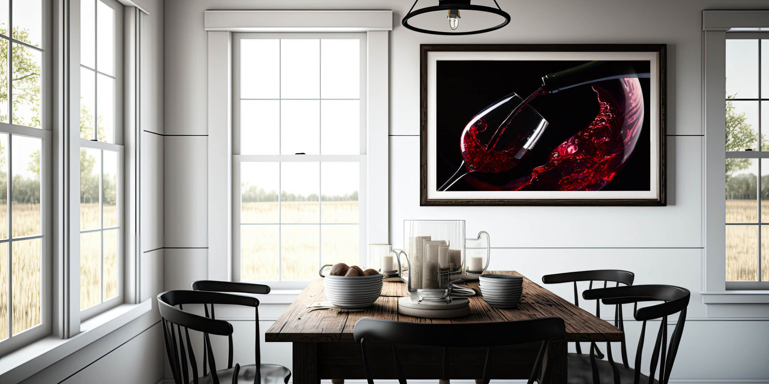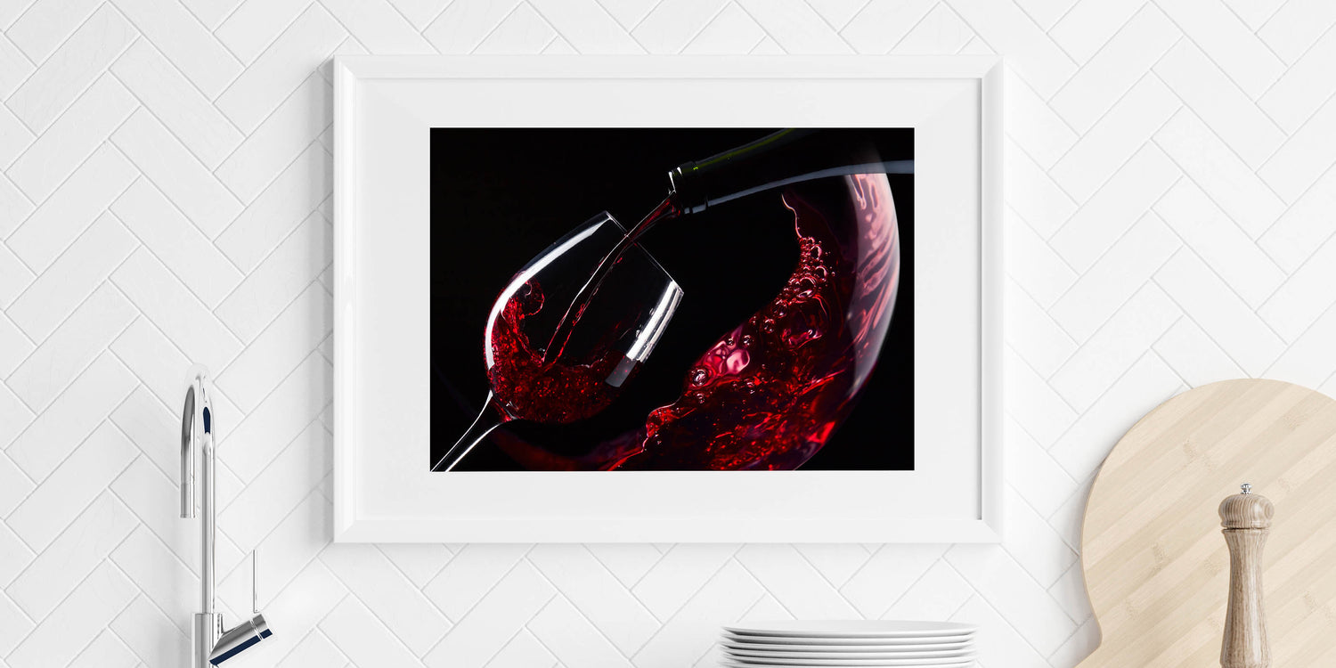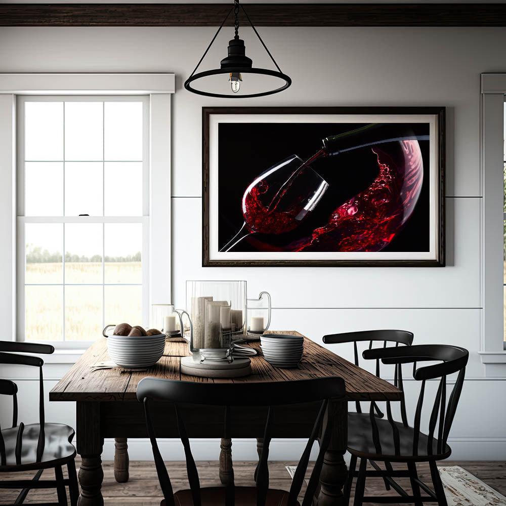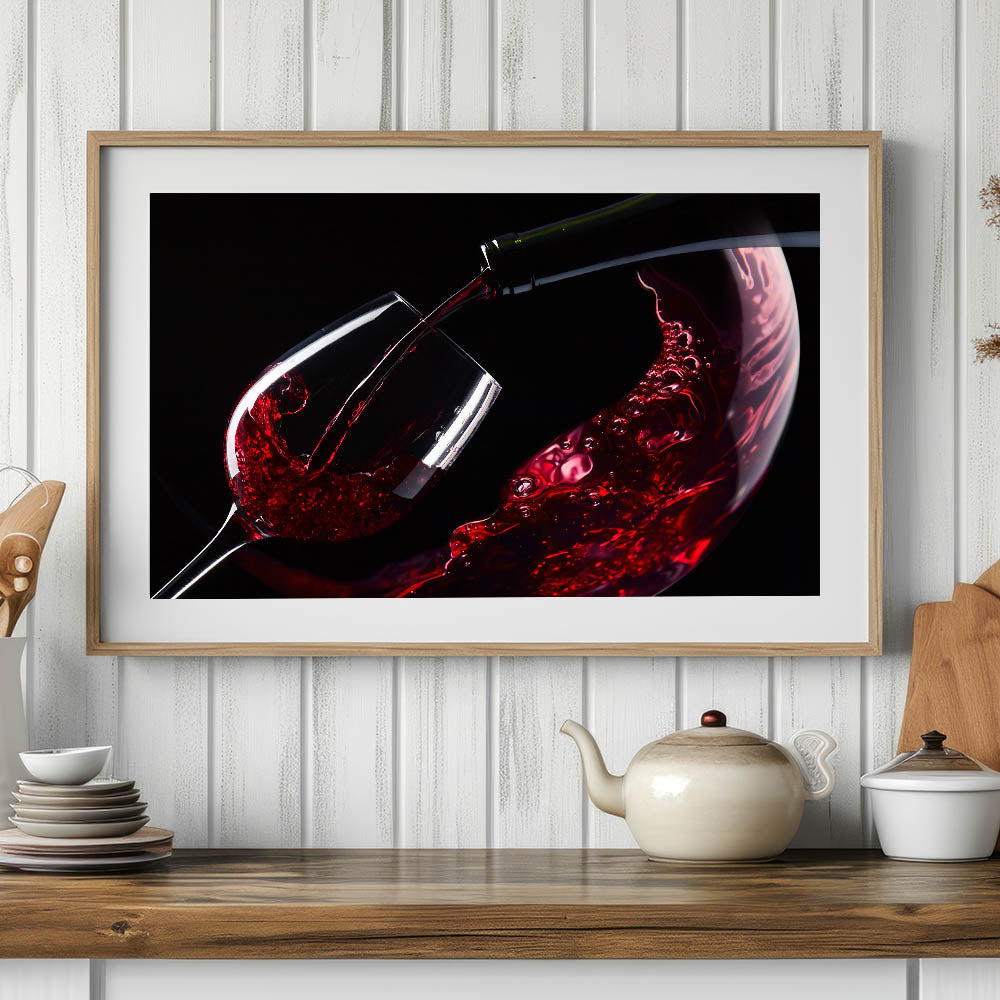 Elevate your kitchen ambiance with this stunning kitchen wall art, showcasing a close-up of rich red wine being elegantly poured into a glass. This modern kitchen art piece adds a touch of sophistication, making it the perfect choice for wine lovers and contemporary interior styles.