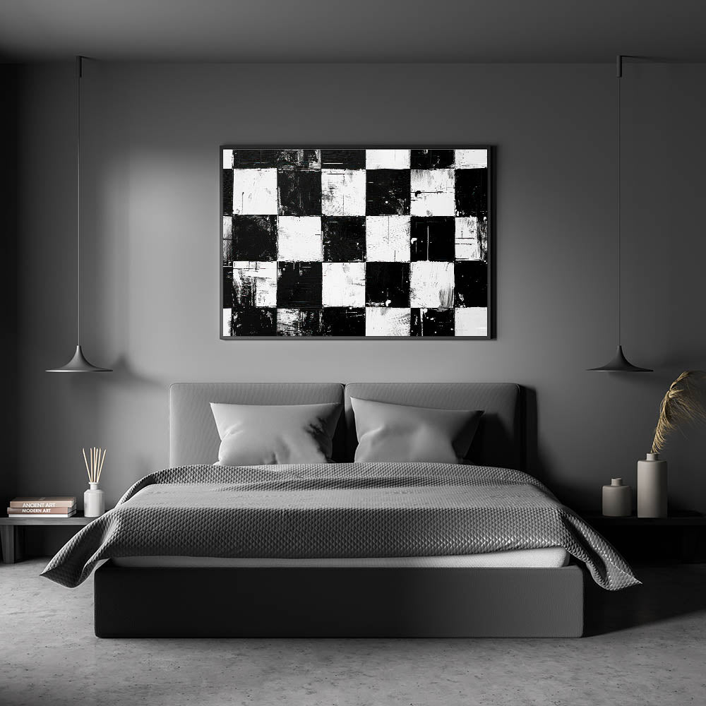 Add a bold, modern touch to your bedroom with this rolled canvas bedroom art, featuring an abstract black and white checkered pattern. The hand-painted texture and distressed aesthetic make this piece a striking focal point, perfect for those who love unique wall art designs for bedrooms.