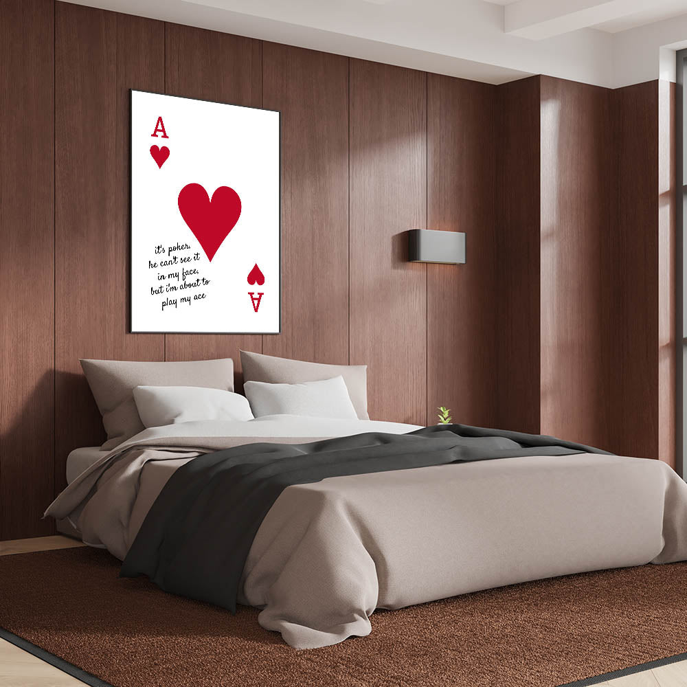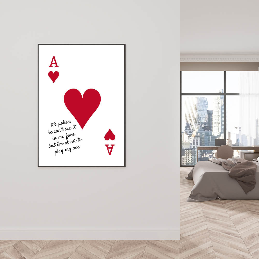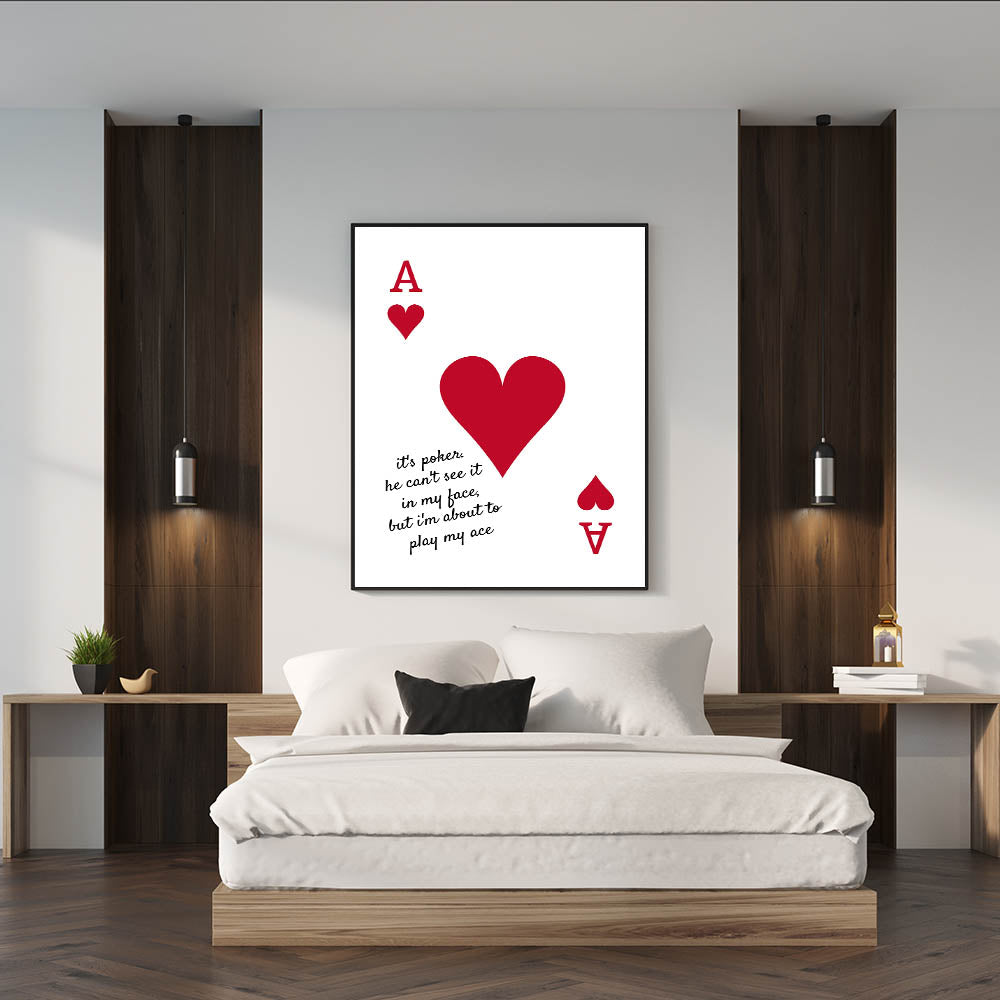 Add a touch of romance and wit to your space with our "Play My Ace" typography art print. Featuring a bold Ace of Hearts design in rich red and a playful handwritten quote, this piece captures the essence of love, strategy, and confidence. The clean white background and vibrant typography make it a perfect fit for modern, minimalist, or romantic decor themes. Ideal for bedrooms, living rooms, or as a gift for someone special, this artwork is both stylish and meaningful.