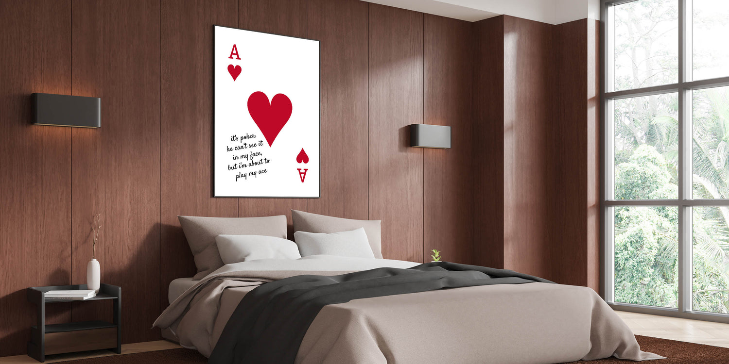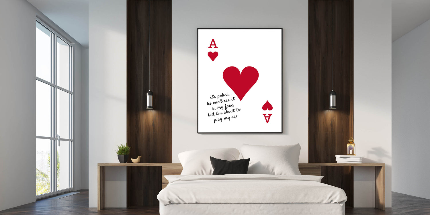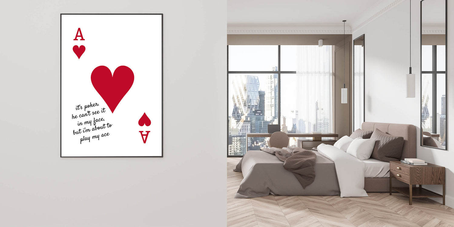 Add a touch of romance and wit to your space with our "Play My Ace" typography art print. Featuring a bold Ace of Hearts design in rich red and a playful handwritten quote, this piece captures the essence of love, strategy, and confidence. The clean white background and vibrant typography make it a perfect fit for modern, minimalist, or romantic decor themes. Ideal for bedrooms, living rooms, or as a gift for someone special, this artwork is both stylish and meaningful.