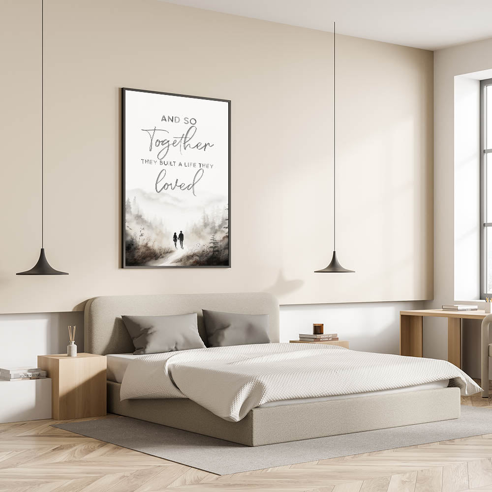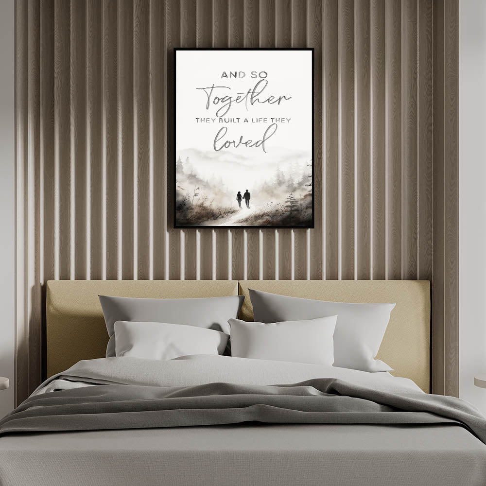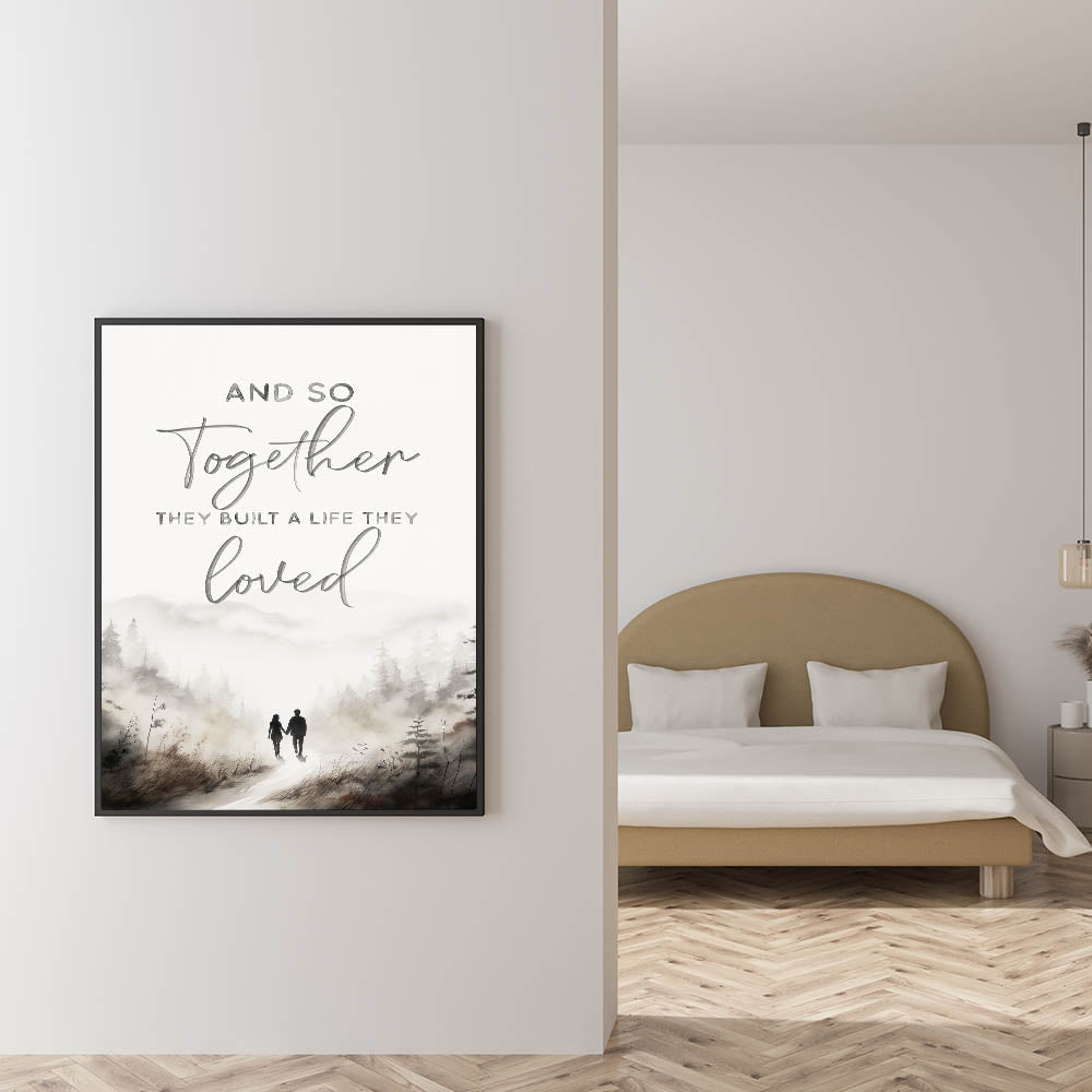 Capture the essence of love and commitment with our "Together They Loved" romantic typography art print. Featuring an elegant script and soft grayscale tones, this piece beautifully portrays the journey of love with the heartfelt quote, "And so together they built a life they loved." The serene backdrop of misty woods and the silhouette of a couple add a touch of warmth and nostalgia, making it a perfect choice for bedrooms, living rooms, or as a wedding or anniversary gift. Its minimalist yet sentimental design complements modern, rustic, and farmhouse decor styles effortlessly.