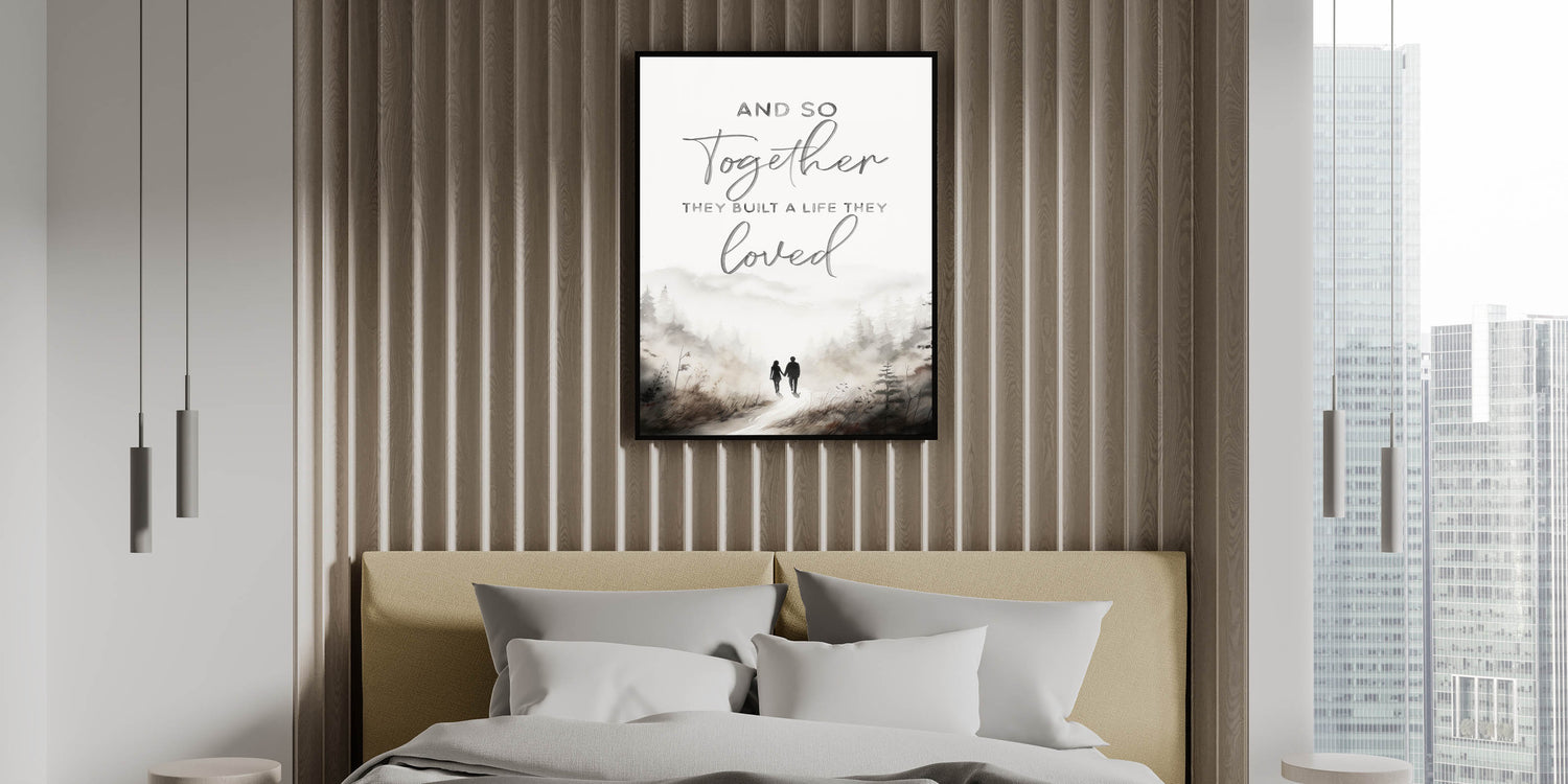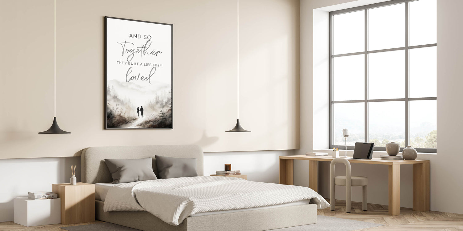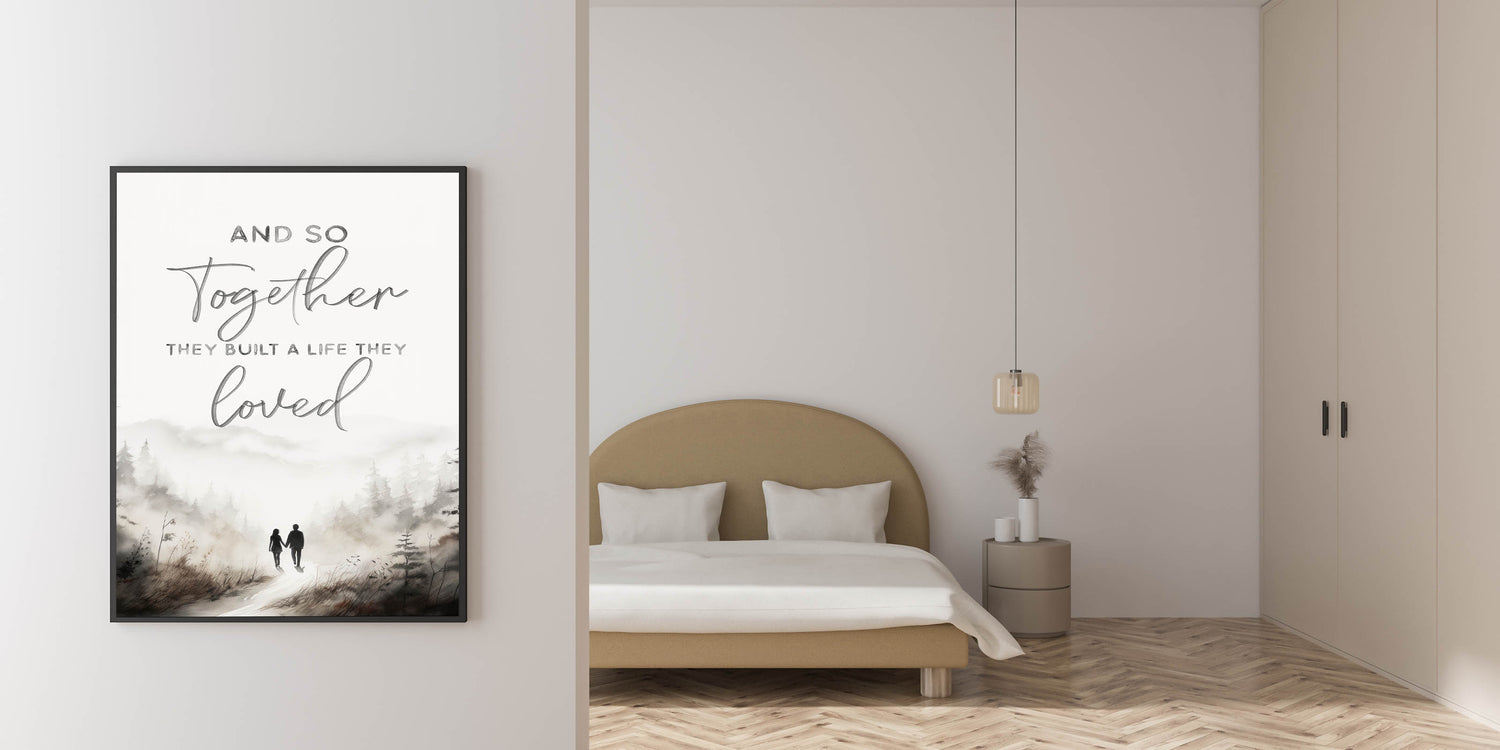 Capture the essence of love and commitment with our "Together They Loved" romantic typography art print. Featuring an elegant script and soft grayscale tones, this piece beautifully portrays the journey of love with the heartfelt quote, "And so together they built a life they loved." The serene backdrop of misty woods and the silhouette of a couple add a touch of warmth and nostalgia, making it a perfect choice for bedrooms, living rooms, or as a wedding or anniversary gift. Its minimalist yet sentimental design complements modern, rustic, and farmhouse decor styles effortlessly.