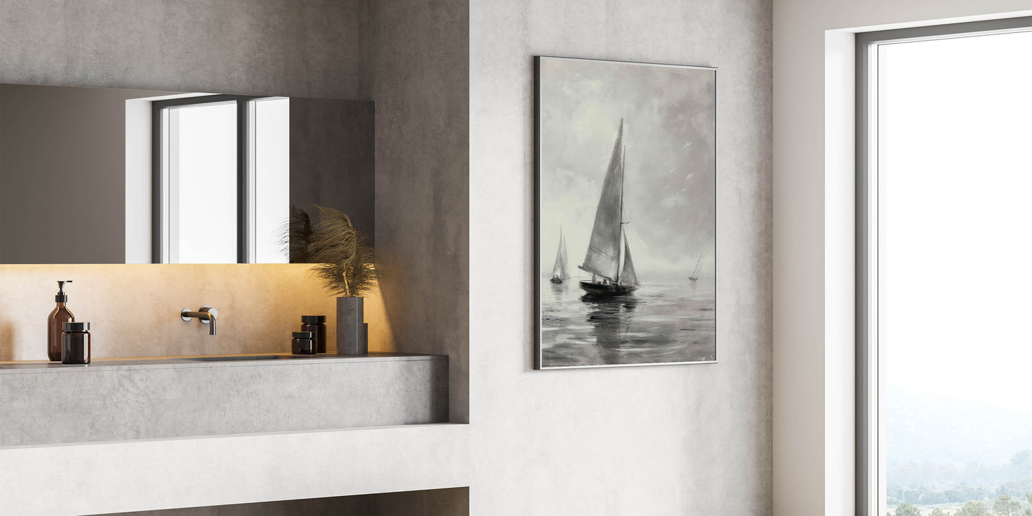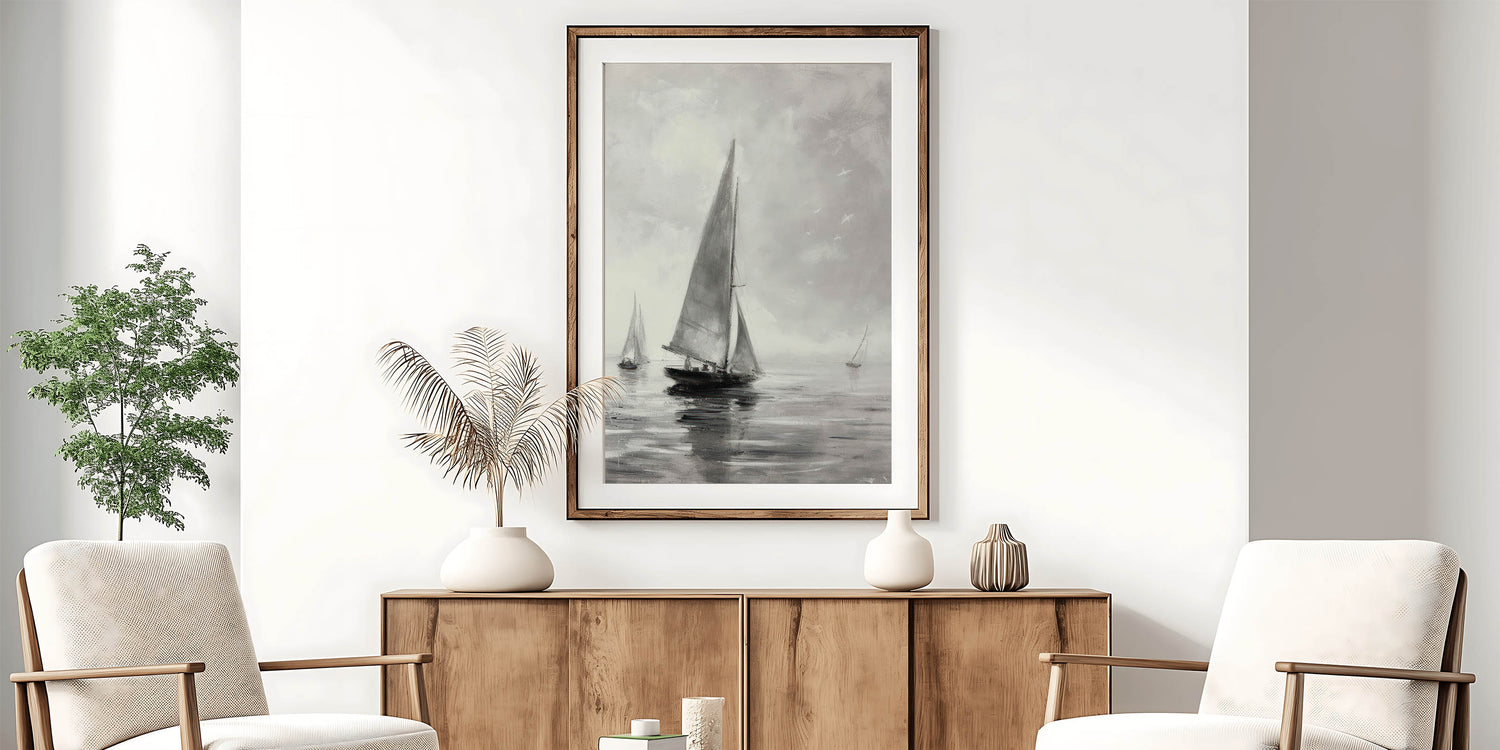 Experience the timeless elegance of sailing with this monochrome sailing landscape canvas print. Featuring serene sailboats gliding across calm waters in shades of black, gray, and white, this artwork radiates sophistication and tranquility. The minimalist design makes it a versatile choice for modern, nautical, or classic interiors.