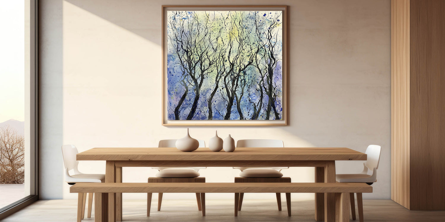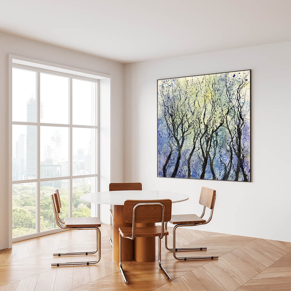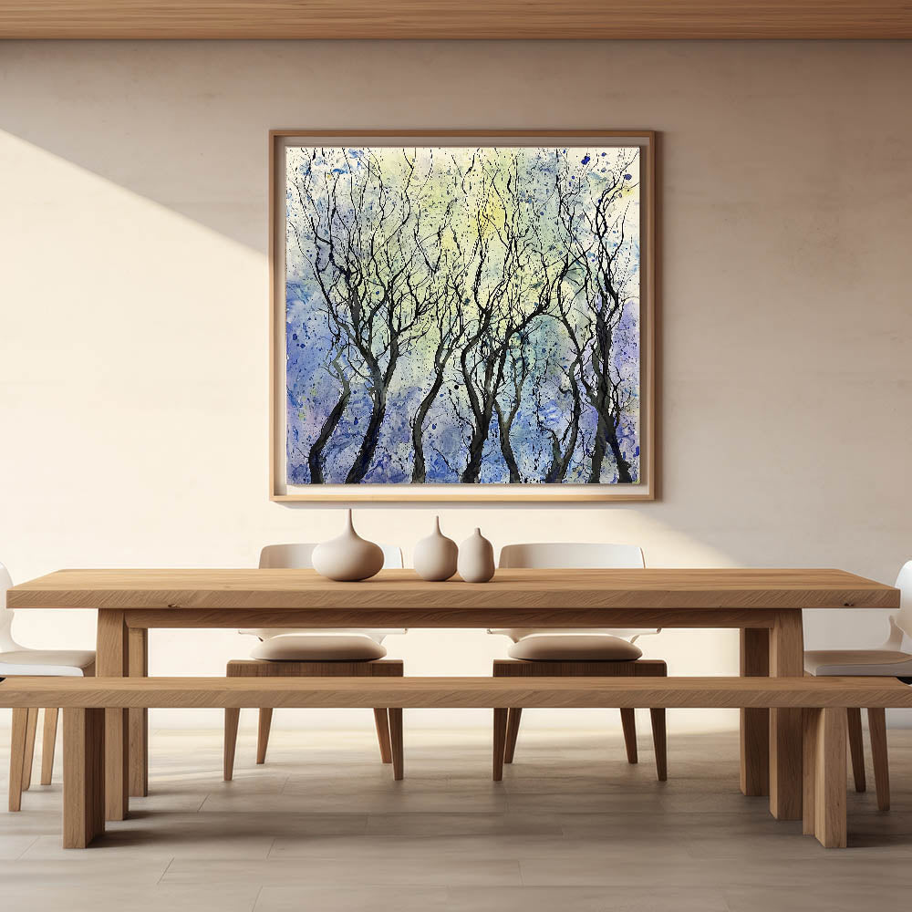 Create a calming and sophisticated ambiance in your dining space with this serene abstract tree wall art. Featuring intricate black branches set against a dreamy blend of blue, purple, and yellow hues, this piece captures the beauty of nature in an expressive, modern style. The fluid brushstrokes and artistic splatters add a sense of movement, making this elegant dining room wall art an eye-catching focal point.