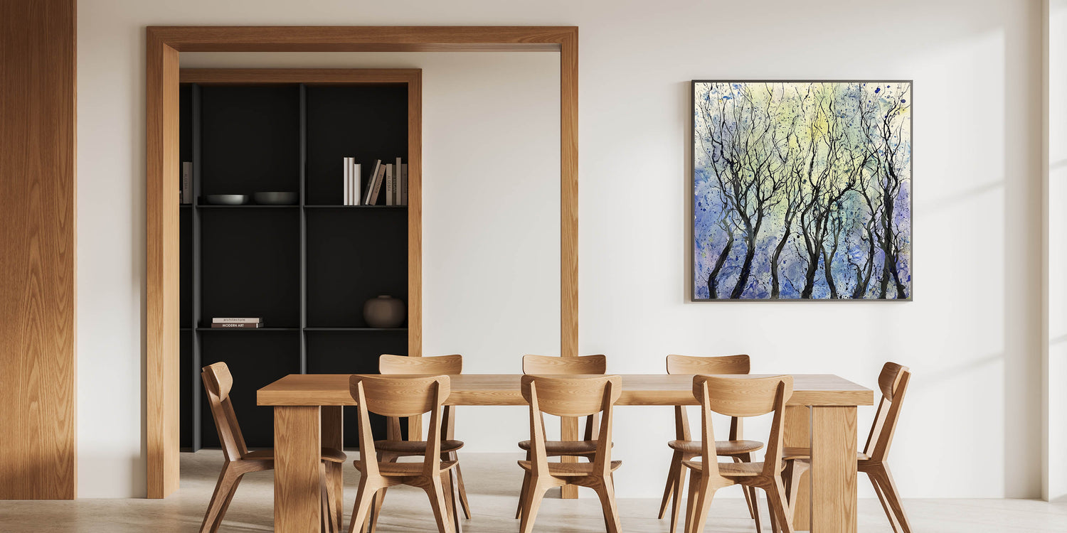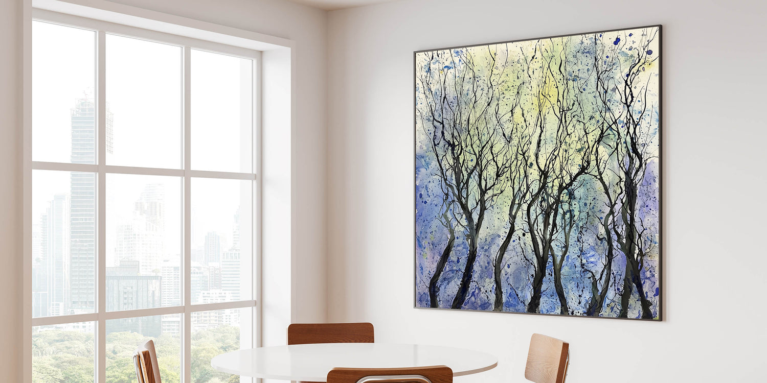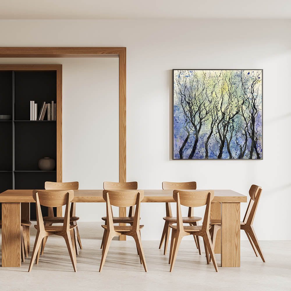 Create a calming and sophisticated ambiance in your dining space with this serene abstract tree wall art. Featuring intricate black branches set against a dreamy blend of blue, purple, and yellow hues, this piece captures the beauty of nature in an expressive, modern style. The fluid brushstrokes and artistic splatters add a sense of movement, making this elegant dining room wall art an eye-catching focal point.