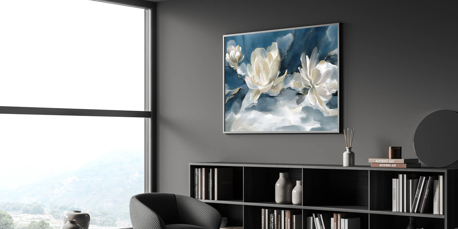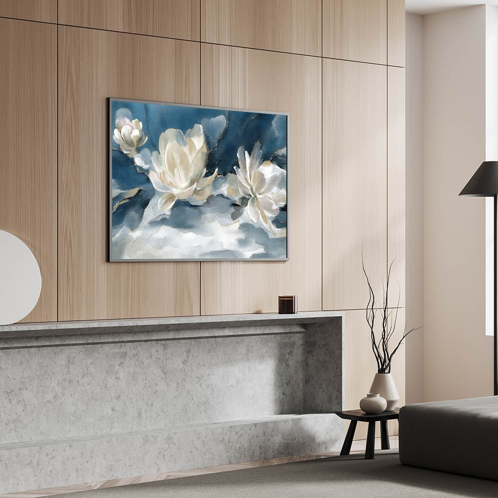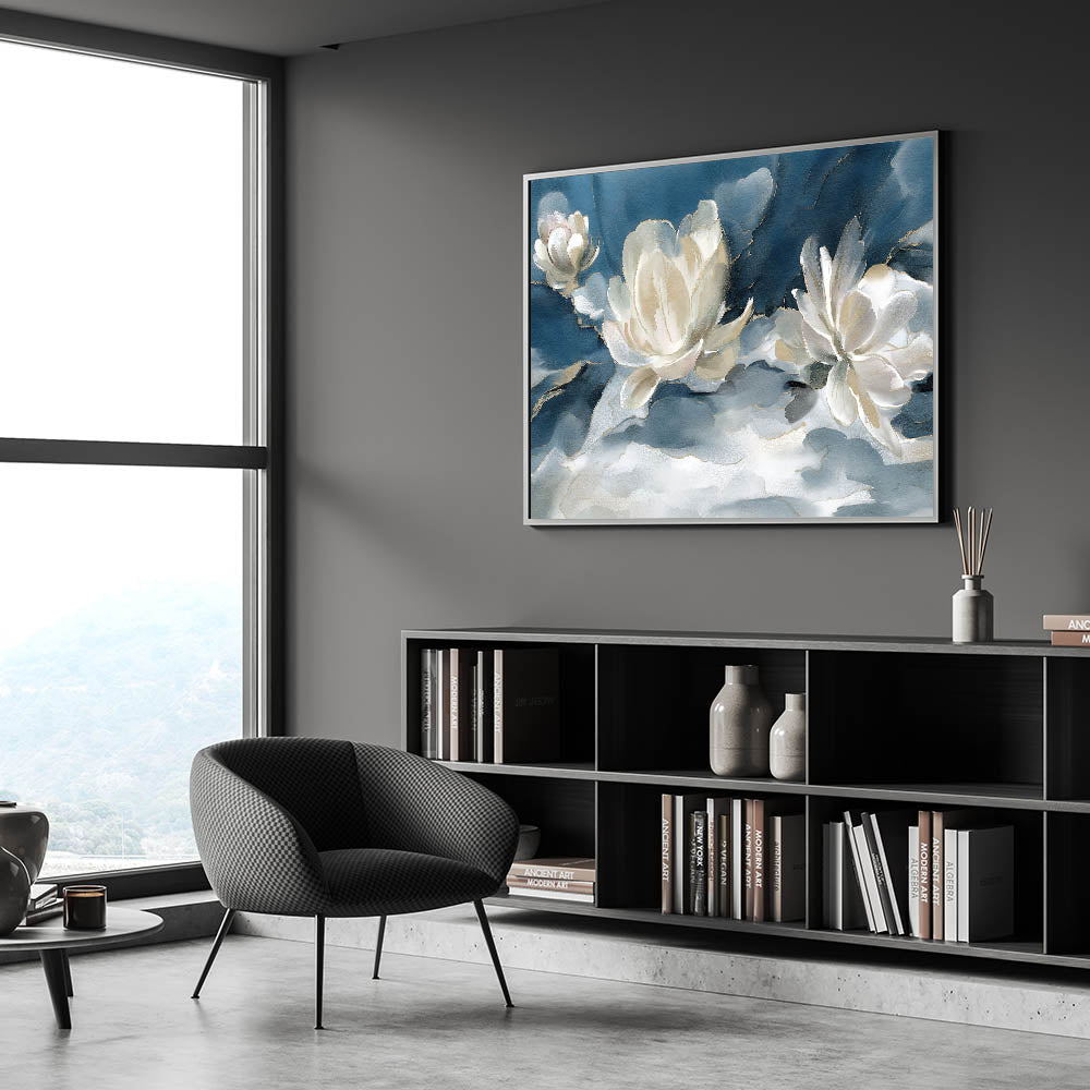 Bring tranquility and elegance to your home with this stunning floral wall art. Featuring delicate white blossoms with soft beige tones set against a deep navy blue background, this artwork captures a sense of peace and sophistication. Perfect for wall art for living room spaces, this piece blends modern living room decor with timeless floral beauty.