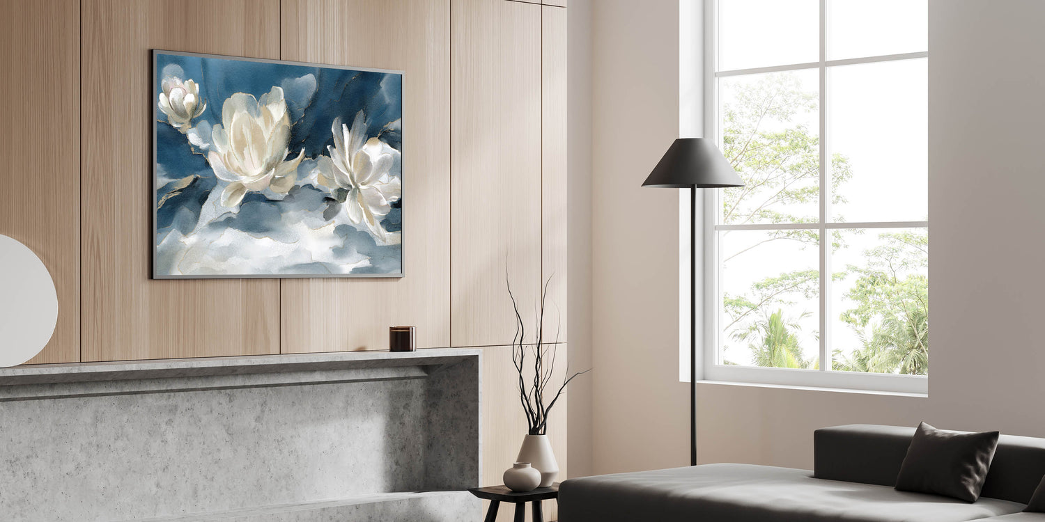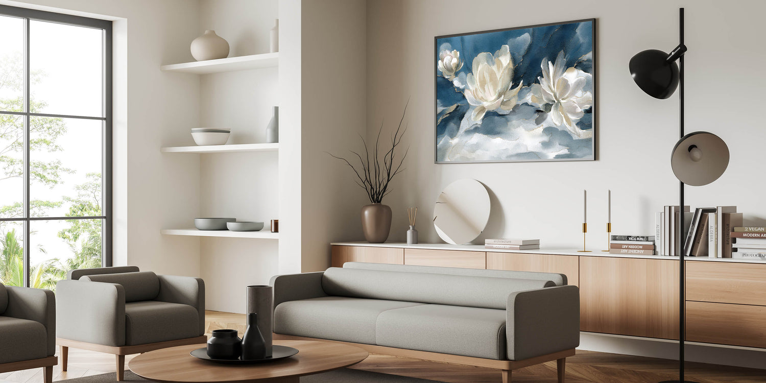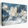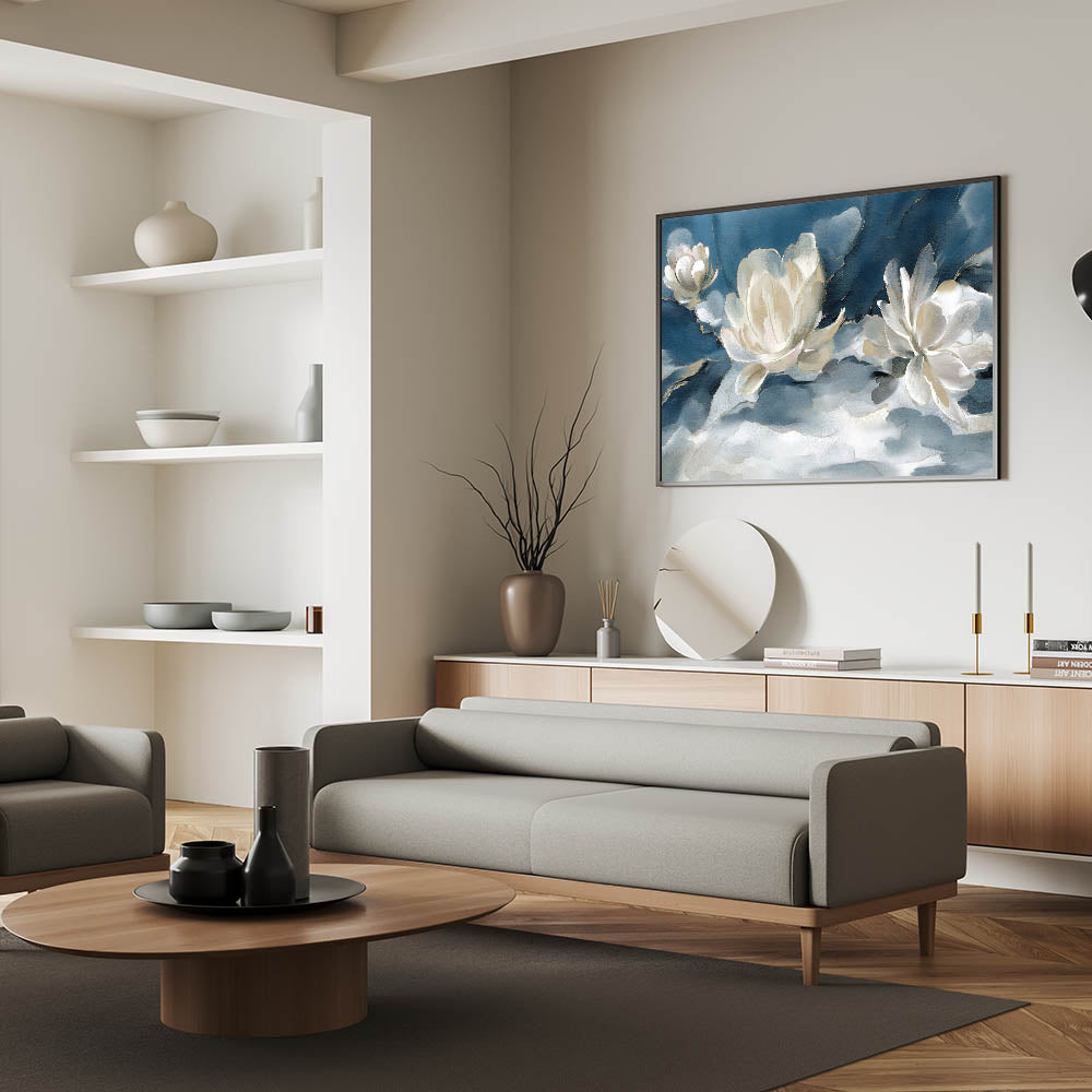 Bring tranquility and elegance to your home with this stunning floral wall art. Featuring delicate white blossoms with soft beige tones set against a deep navy blue background, this artwork captures a sense of peace and sophistication. Perfect for wall art for living room spaces, this piece blends modern living room decor with timeless floral beauty.