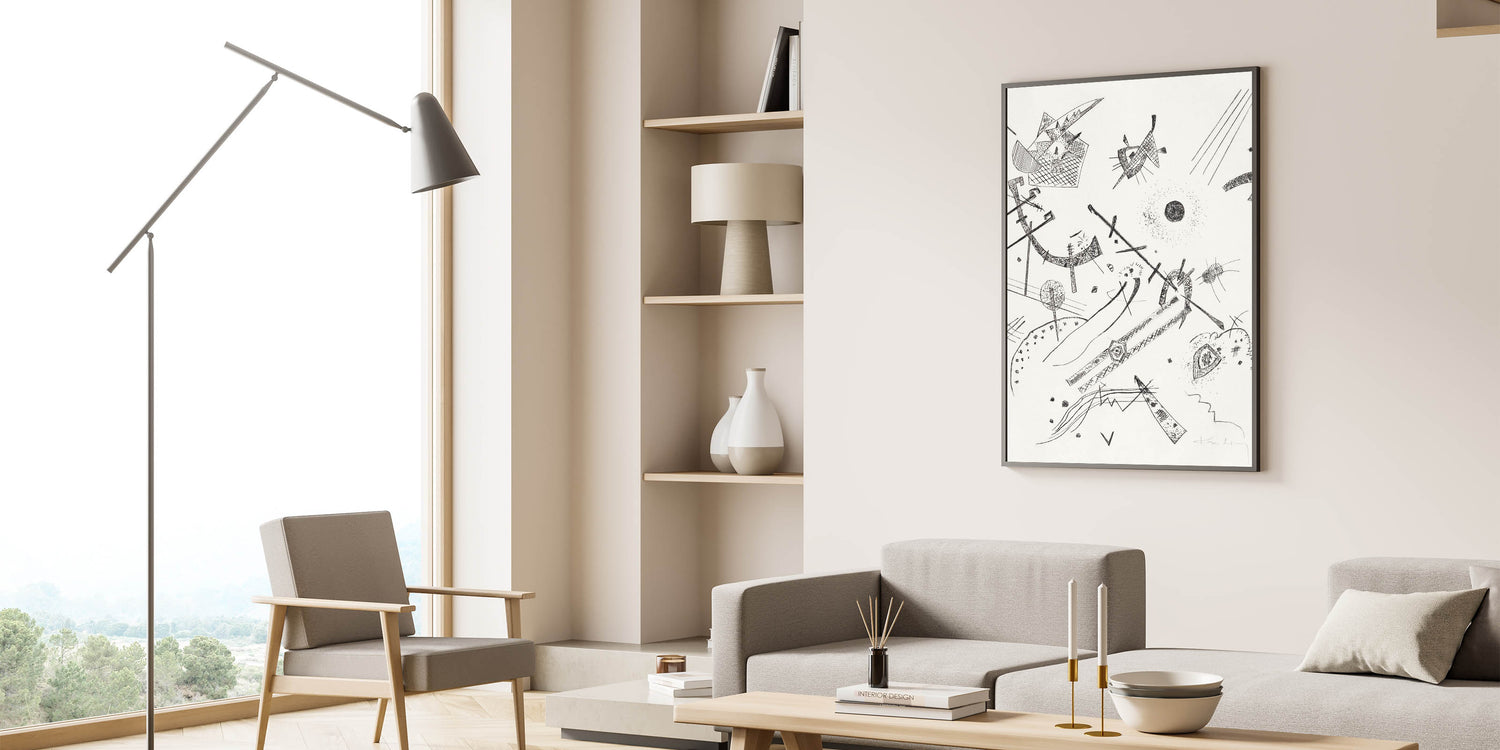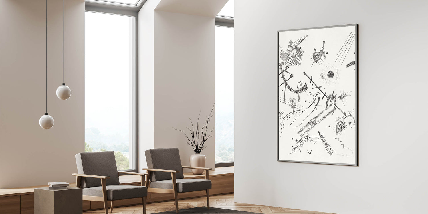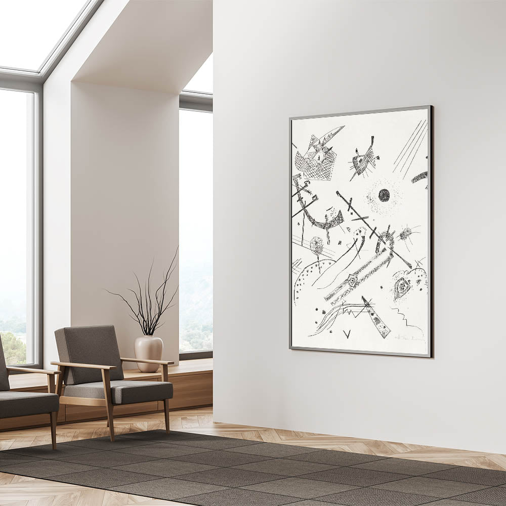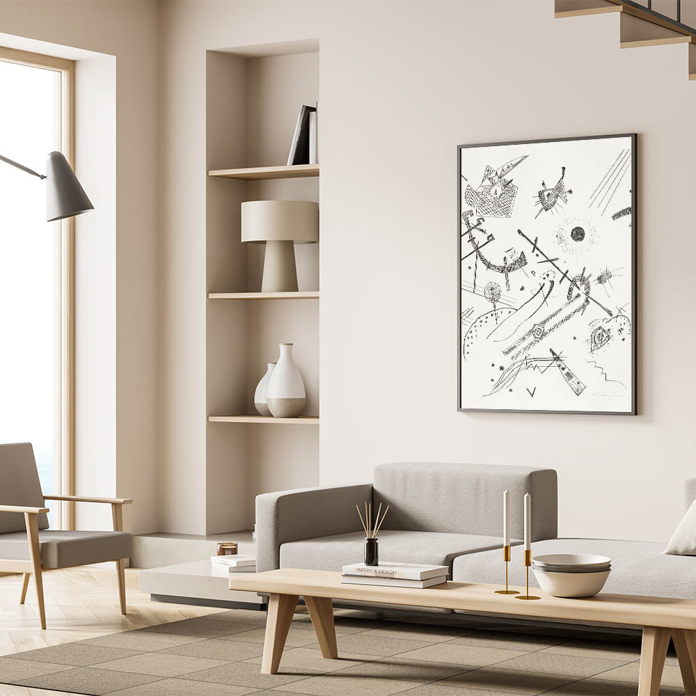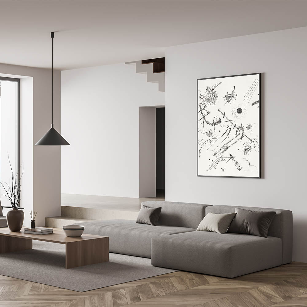 Explore the world of abstract expression with "Small Worlds," an intricate monochrome artwork inspired by Wassily Kandinsky’s iconic style. This piece features a complex composition of lines, shapes, and forms that invite viewers to interpret and explore its details. Ideal for lovers of modern, abstract art, this wall piece adds a sense of movement and curiosity, making it a thought-provoking addition to any contemporary space.