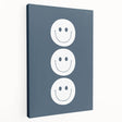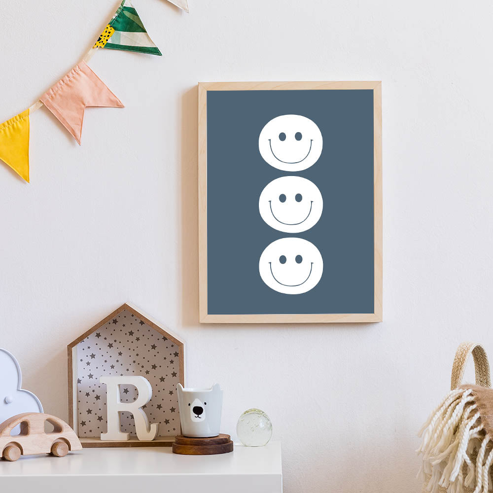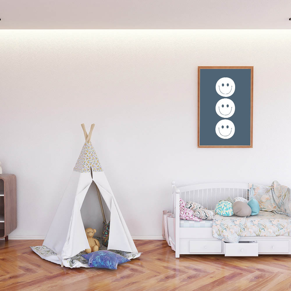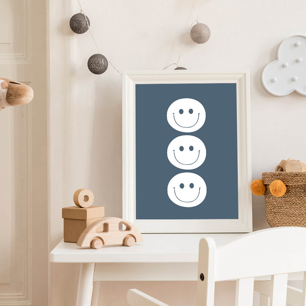 Brighten up your child's space with this Smiley Faces wall art, a fun and cheerful addition to any boys' bedroom, playroom, or nursery. Featuring three white smiley faces stacked vertically on a muted blue background, this minimalist yet playful design creates a positive and uplifting vibe in any kids' space.