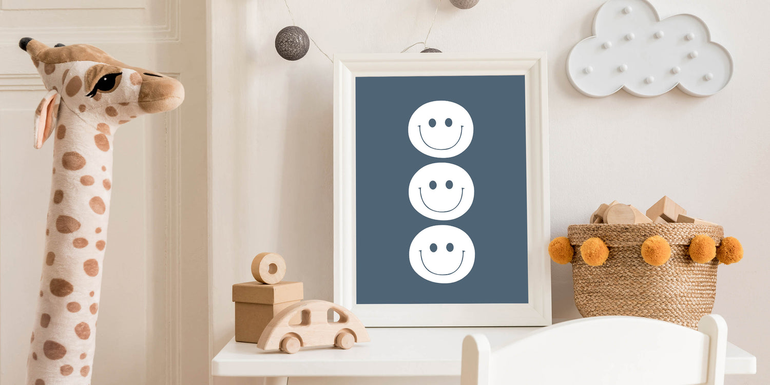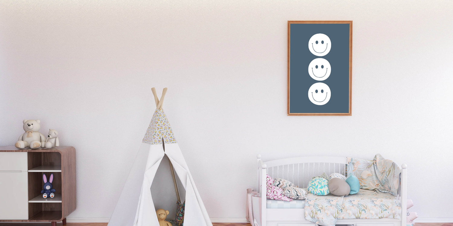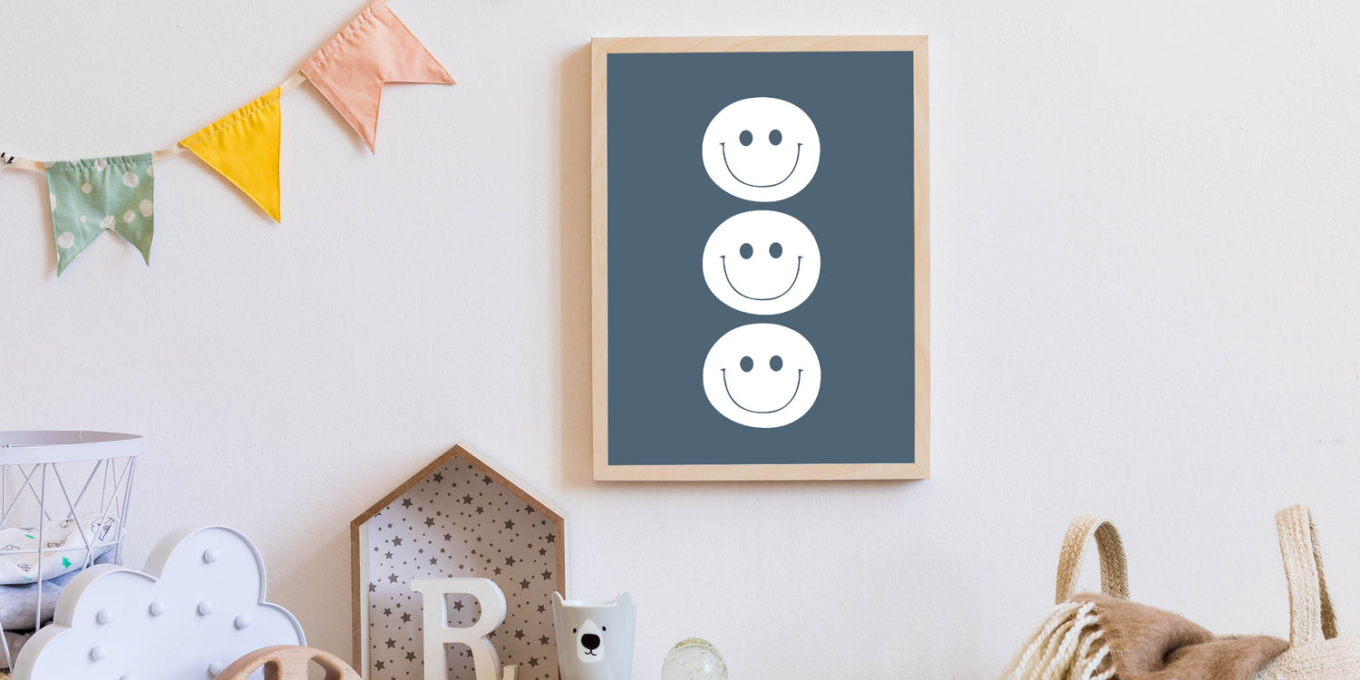 Brighten up your child's space with this Smiley Faces wall art, a fun and cheerful addition to any boys' bedroom, playroom, or nursery. Featuring three white smiley faces stacked vertically on a muted blue background, this minimalist yet playful design creates a positive and uplifting vibe in any kids' space.