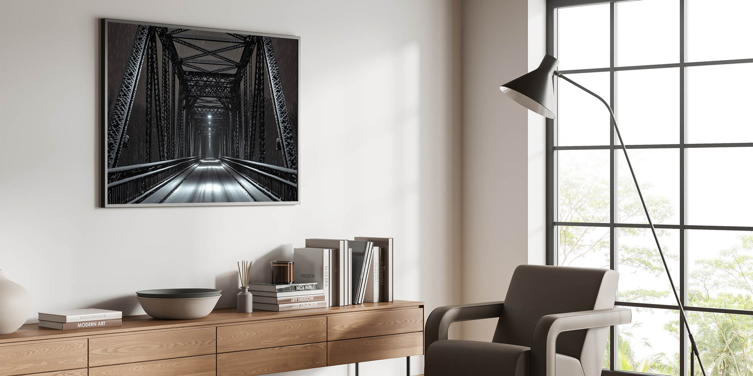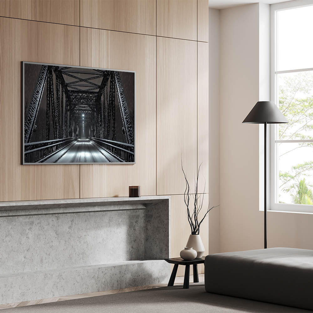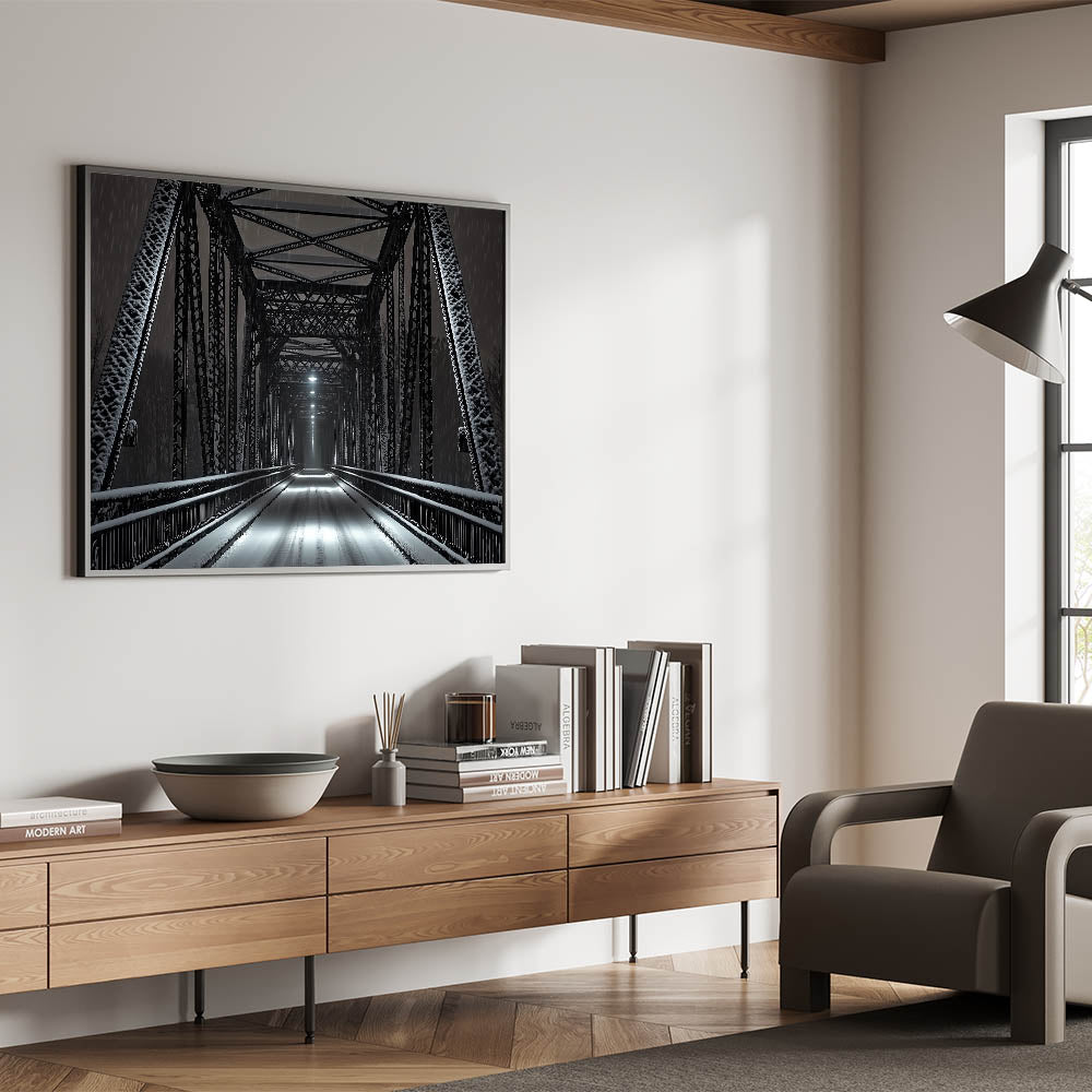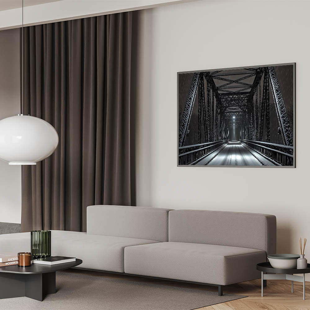 Transform your space with this moody and atmospheric wall art. Whether displayed in a living room, office, or hallway, this piece captures the beauty of winter’s serenity and the architectural elegance of iron bridges.