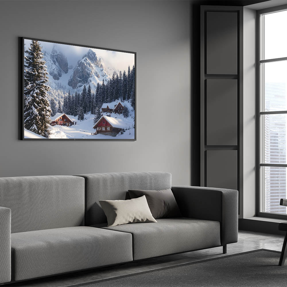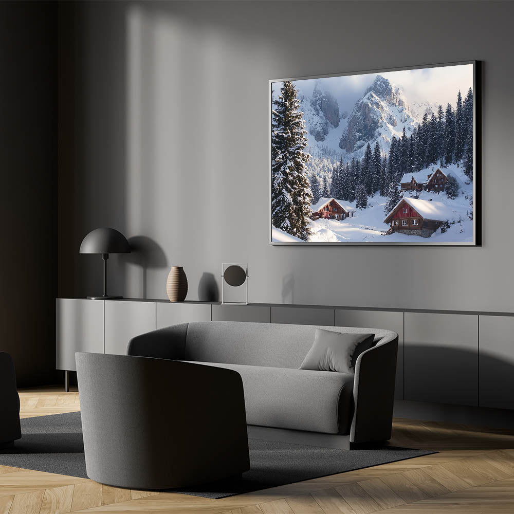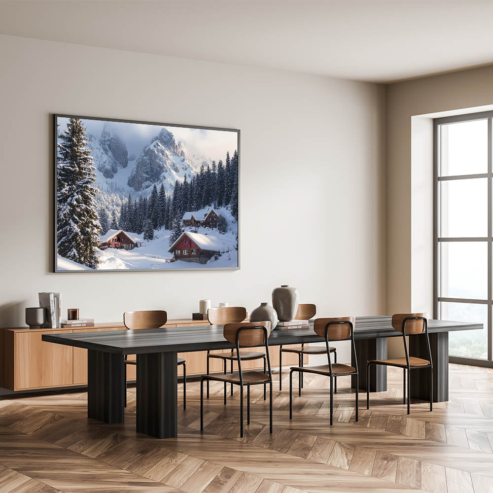 Experience the serene charm of winter with this stunning countryside wall art. Featuring a picturesque mountain village nestled among snow-covered pine trees, with majestic peaks towering in the background, this artwork beautifully captures the tranquility of a snowy retreat. Perfect for rustic farmhouse decor or nature-inspired interiors, it’s a timeless piece that brings warmth and serenity to any room.