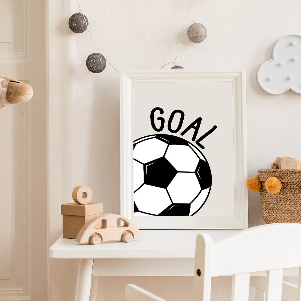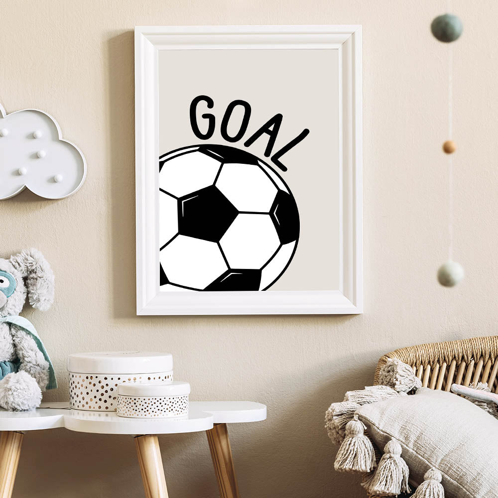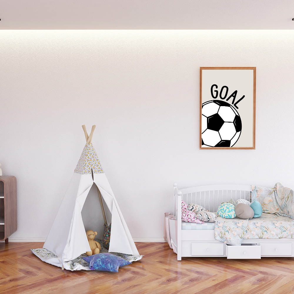 Score big with this Soccer Goal wall art, the perfect decor for young sports lovers. Featuring a bold black and white soccer ball with the word "GOAL" on a neutral beige background, this modern and dynamic design is ideal for boys' bedrooms, playrooms, and sports-themed spaces. Whether your child is a soccer fan or dreams of becoming a future champion, this artwork brings energy and motivation to their space.