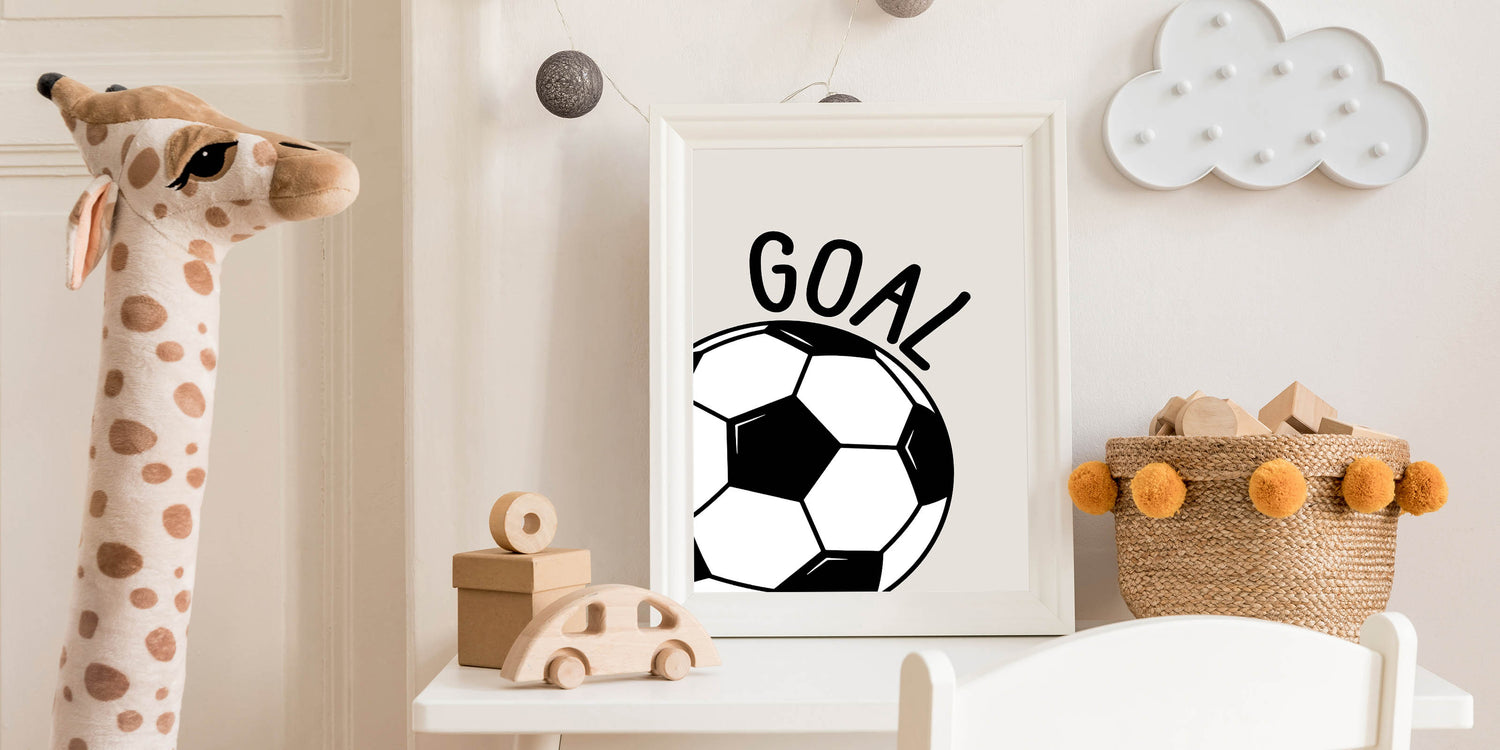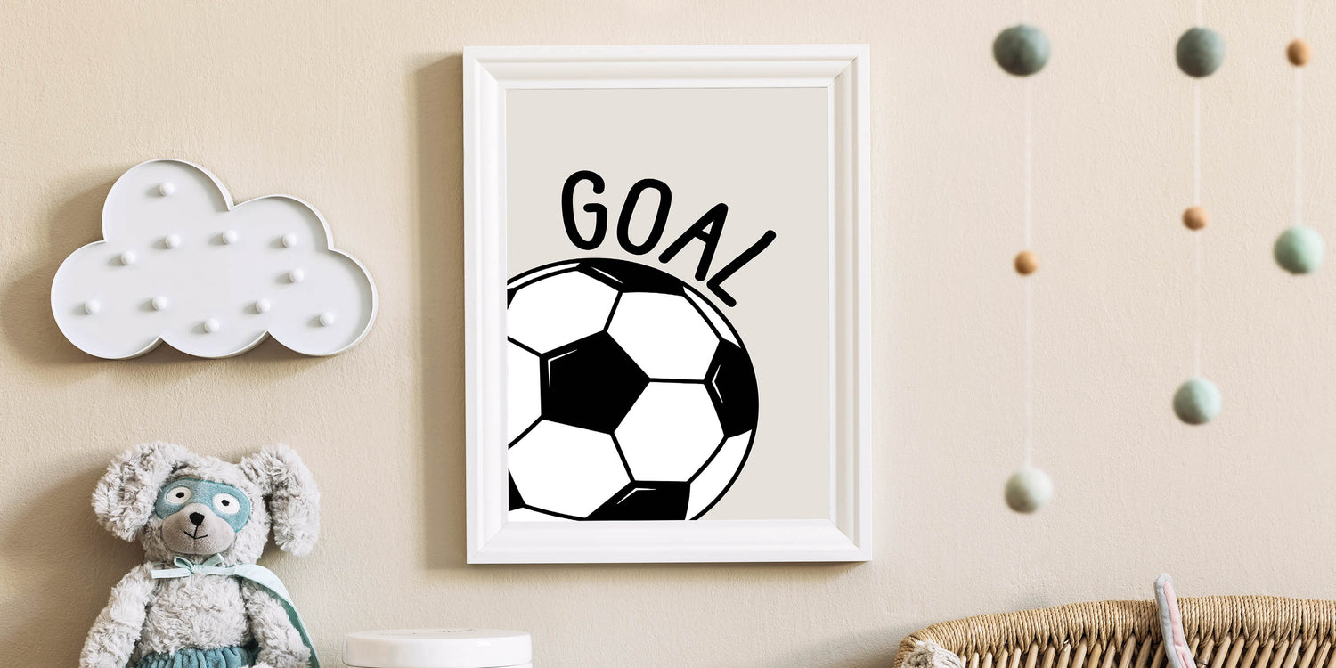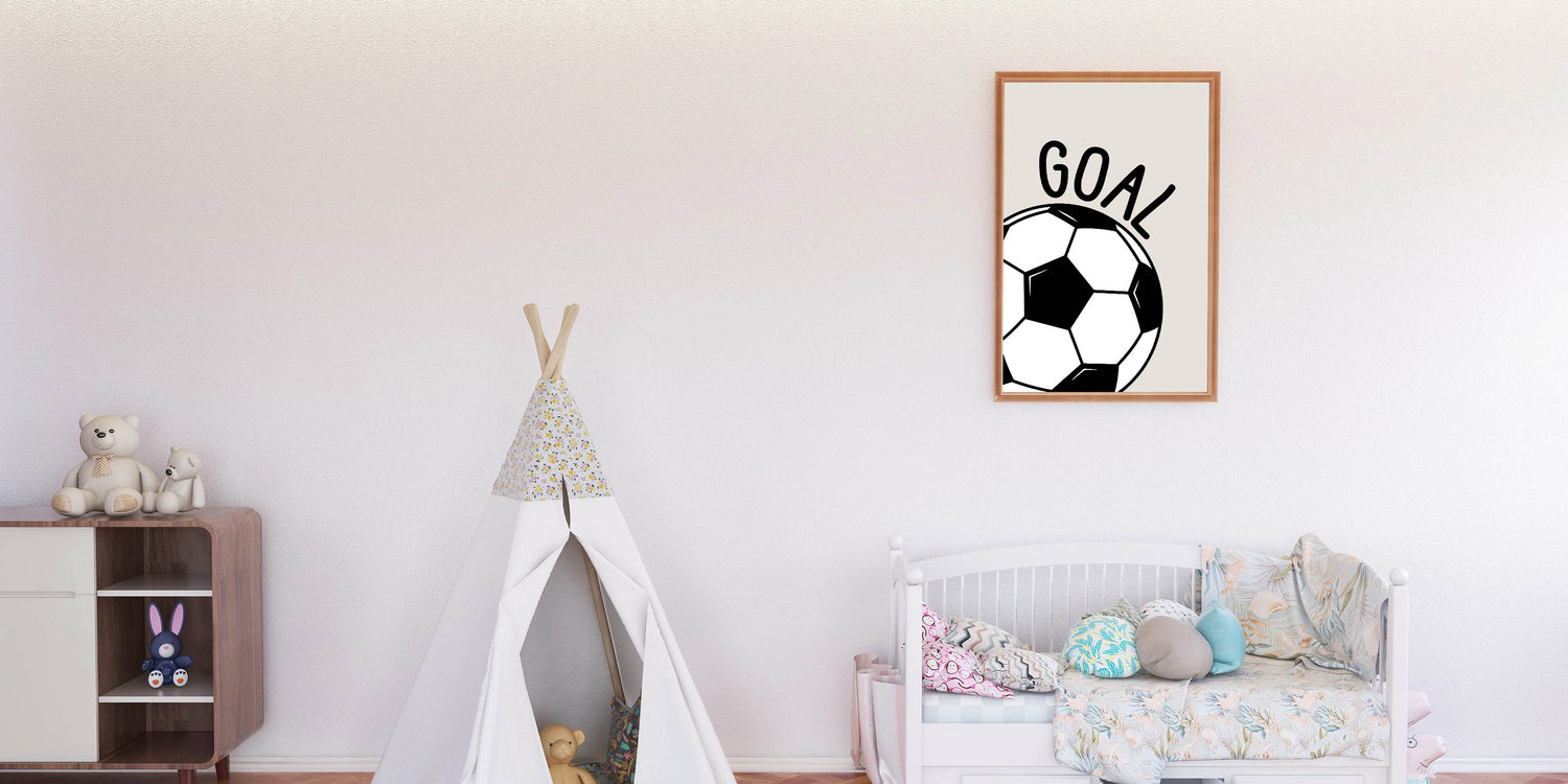 Score big with this Soccer Goal wall art, the perfect decor for young sports lovers. Featuring a bold black and white soccer ball with the word "GOAL" on a neutral beige background, this modern and dynamic design is ideal for boys' bedrooms, playrooms, and sports-themed spaces. Whether your child is a soccer fan or dreams of becoming a future champion, this artwork brings energy and motivation to their space.