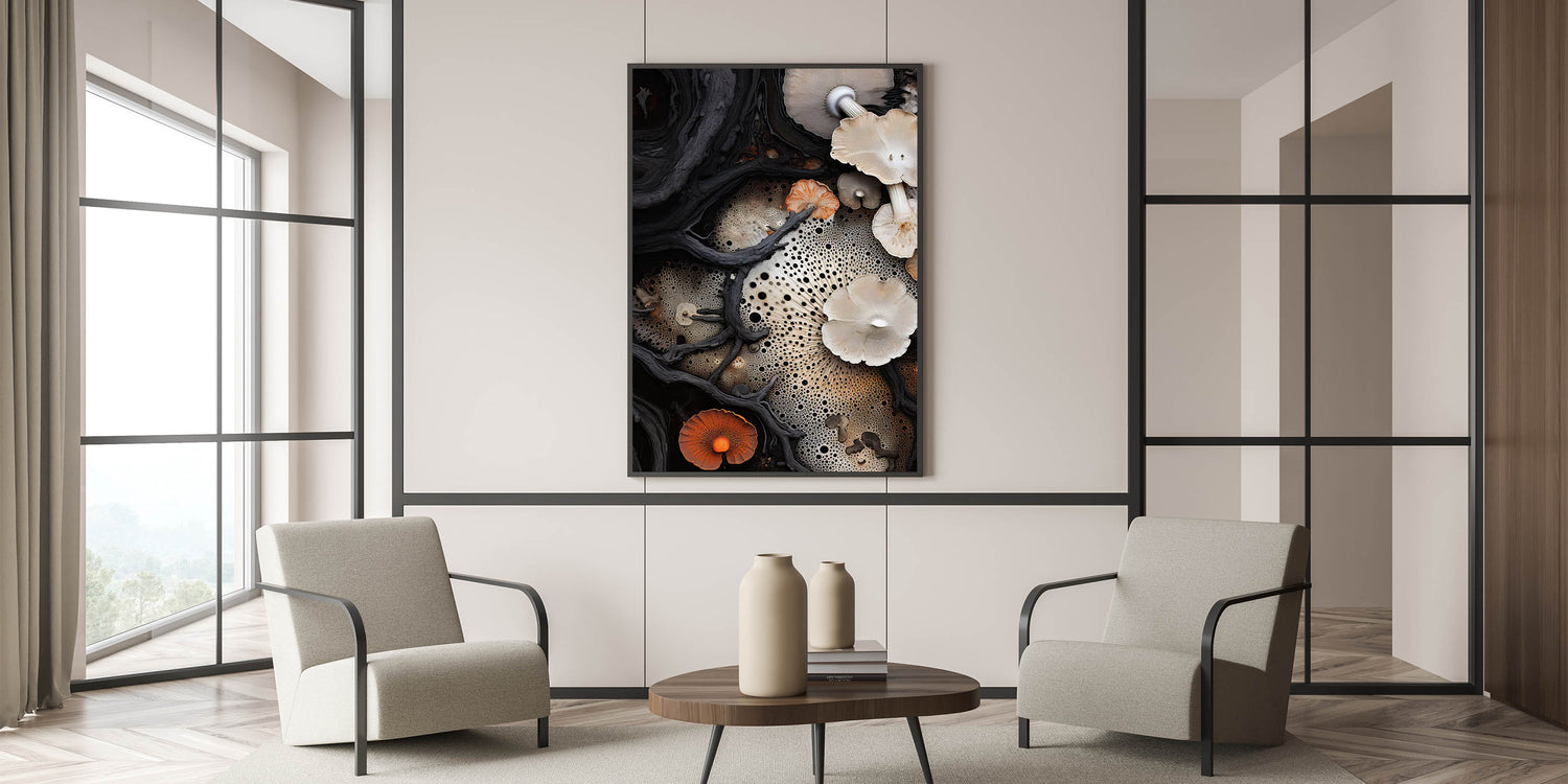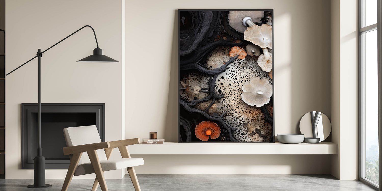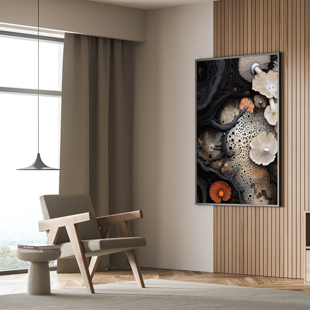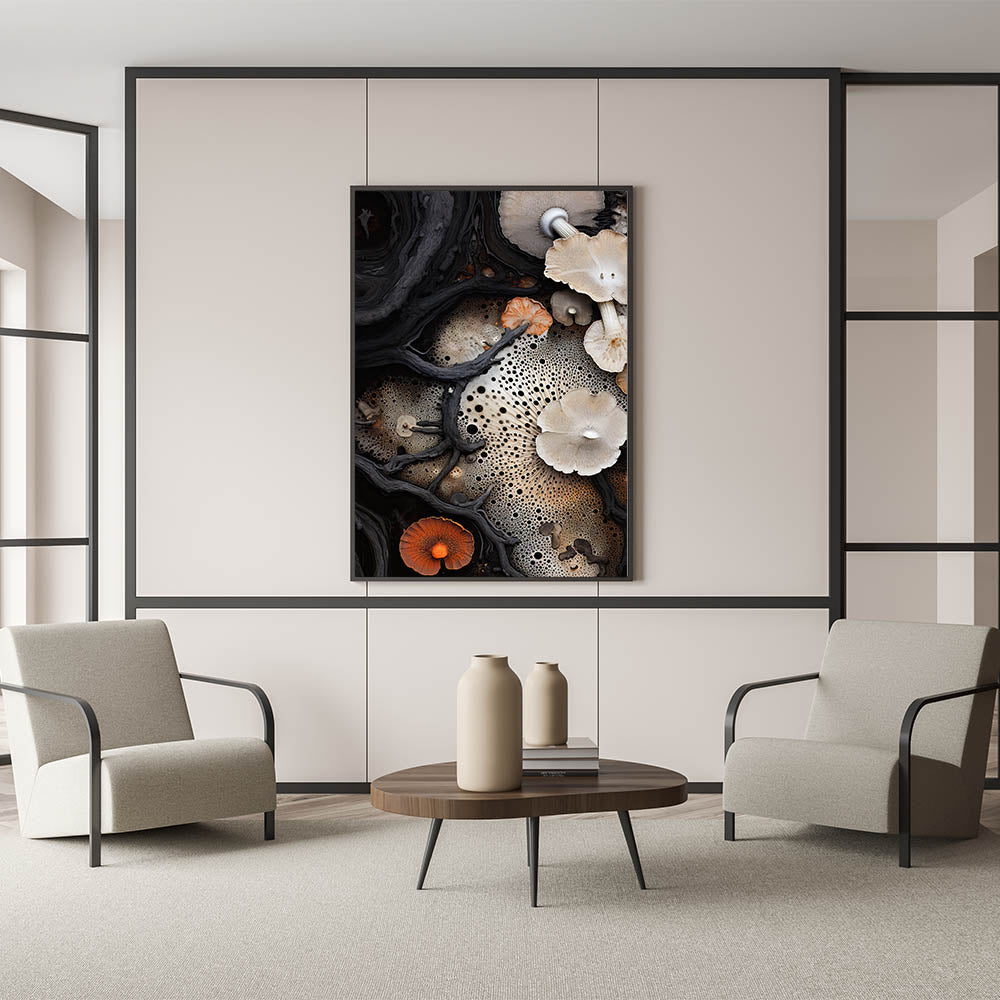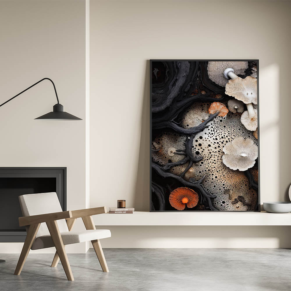 Immerse yourself in the mysterious allure of nature with this macro wall art print showcasing twisted branches and delicate mushrooms. The artwork captures a stunning closeup, highlighting the intricate textures and organic beauty of fungi nestled among dark, gnarled wood. The soft cream and peach hues of the mushrooms stand out against the deep black background, creating a harmonious balance of light and shadow.