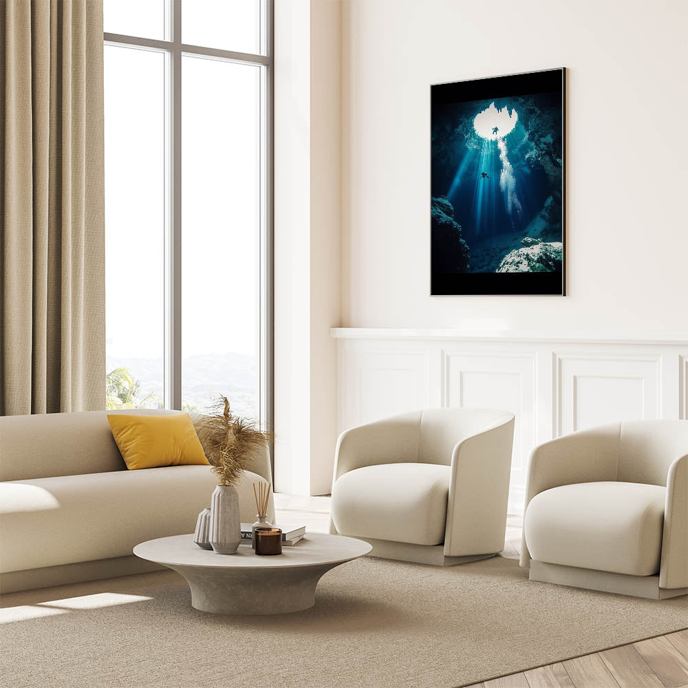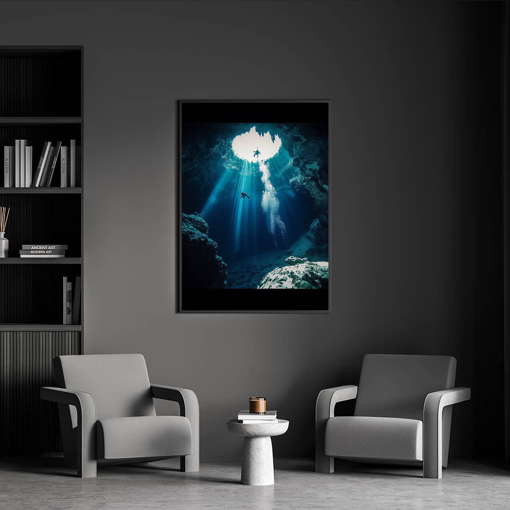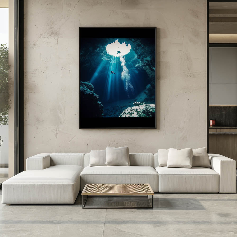 Enhance your living room, office, or bedroom with this unique underwater cave art. Whether displayed in a modern, minimalist, or eclectic decor style, this piece adds a calming and adventurous touch. Choose from various formats