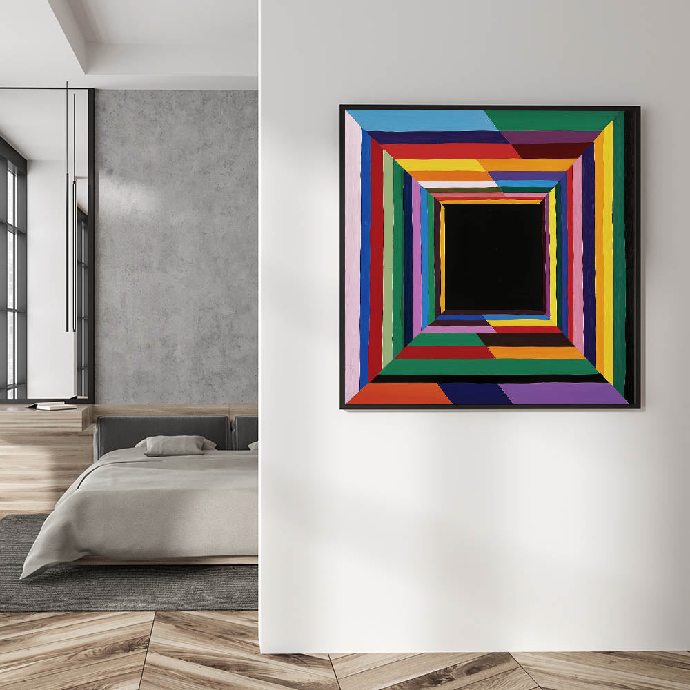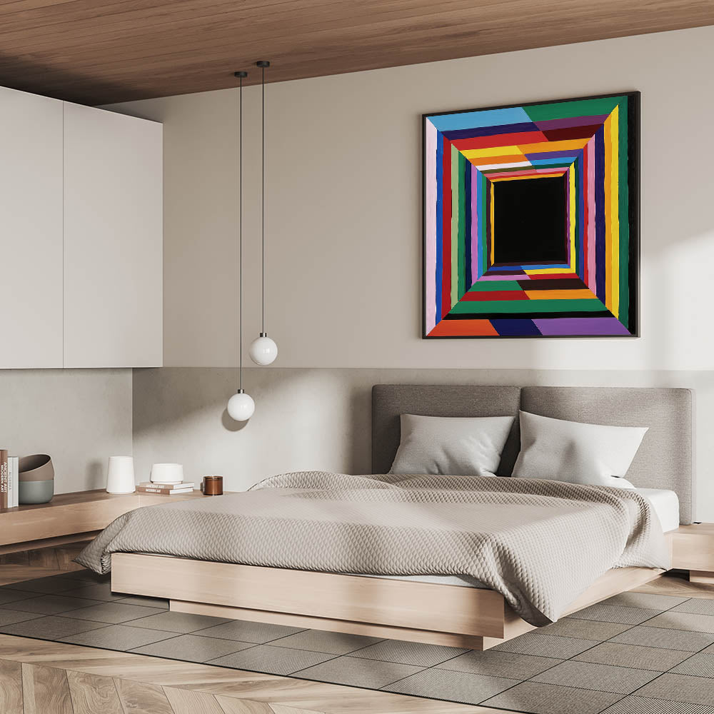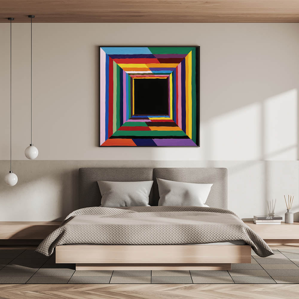 Add an energetic and modern touch to your bedroom with this vibrant geometric bedroom wall art, featuring a bold multicolor composition. With an eye-catching tunnel-like perspective, this customizable bedroom wall art creates a striking illusion of depth, drawing viewers into its mesmerizing, colorful world. Perfect for modern, contemporary, and eclectic interiors, this piece transforms any space with its lively presence.