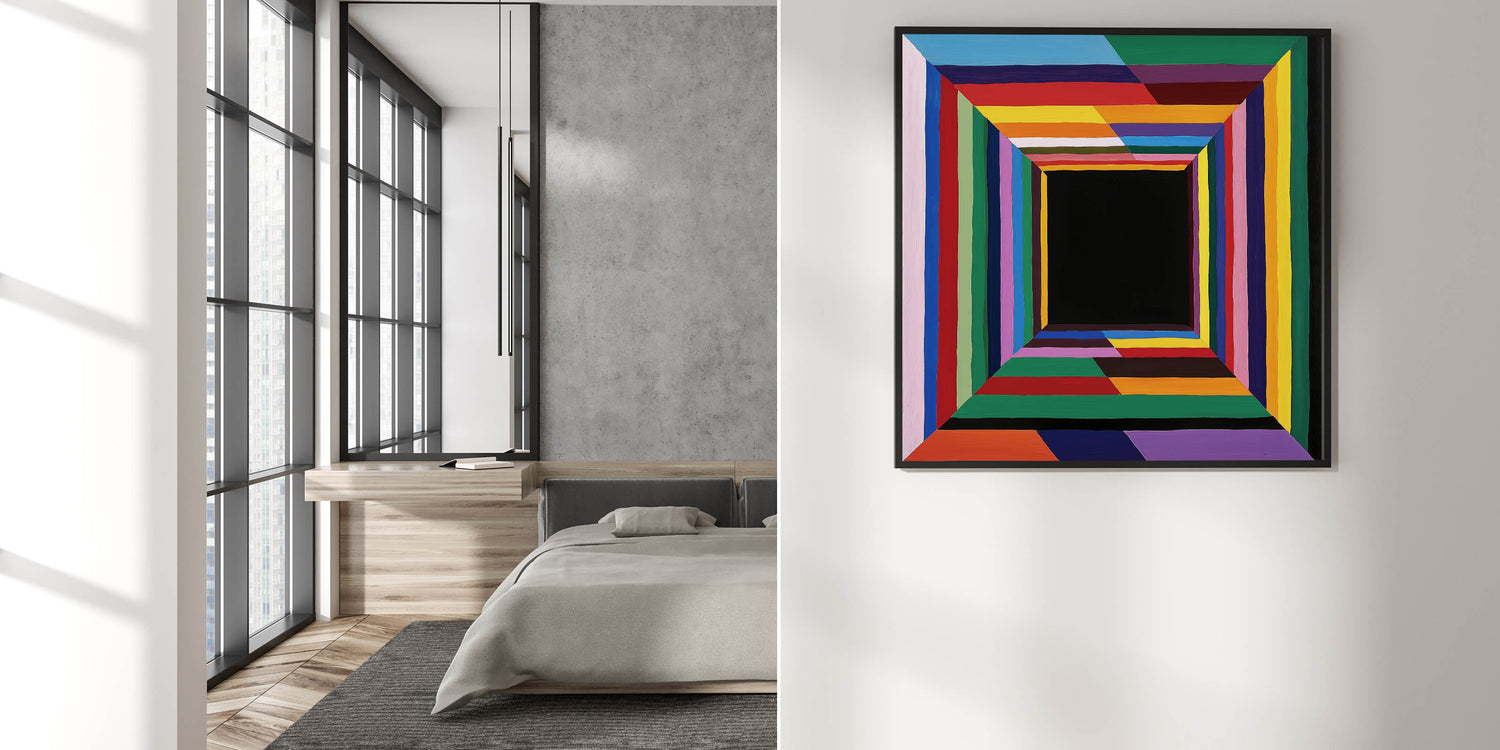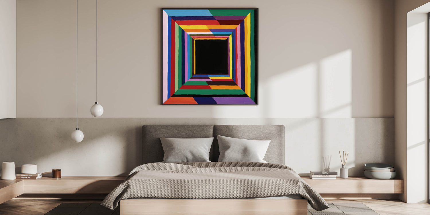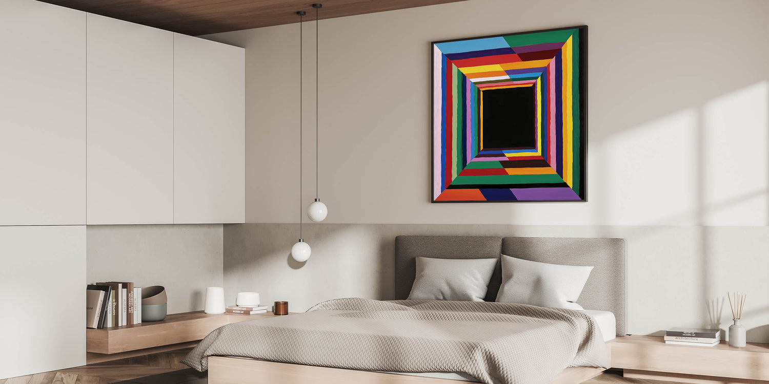 Add an energetic and modern touch to your bedroom with this vibrant geometric bedroom wall art, featuring a bold multicolor composition. With an eye-catching tunnel-like perspective, this customizable bedroom wall art creates a striking illusion of depth, drawing viewers into its mesmerizing, colorful world. Perfect for modern, contemporary, and eclectic interiors, this piece transforms any space with its lively presence.