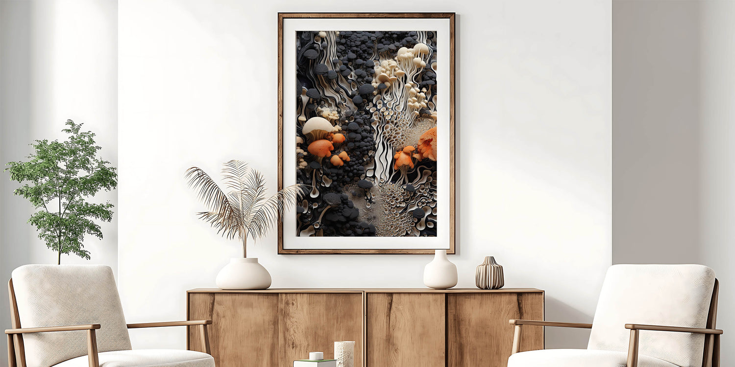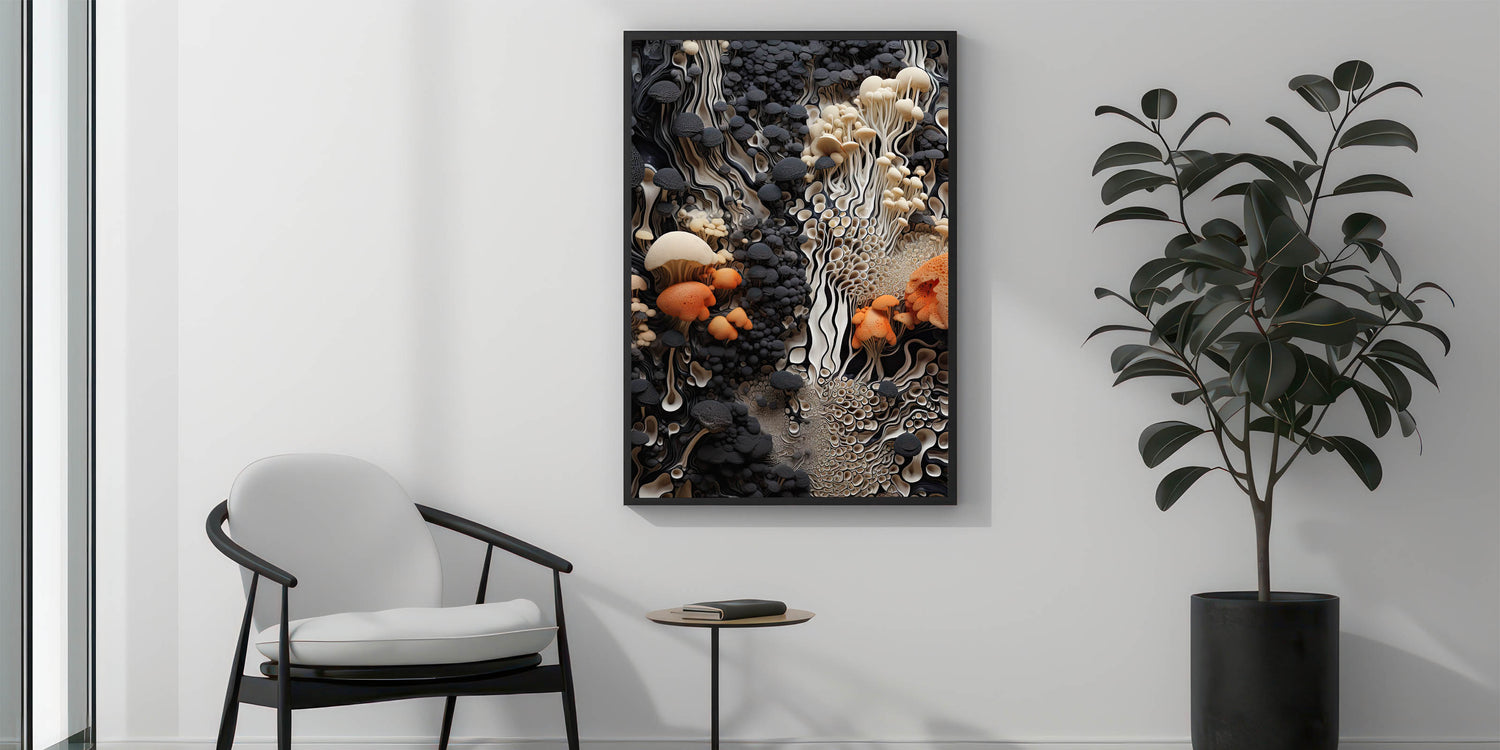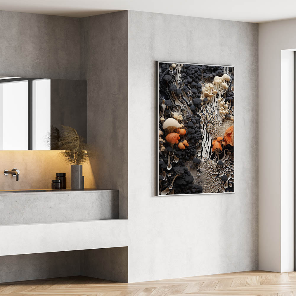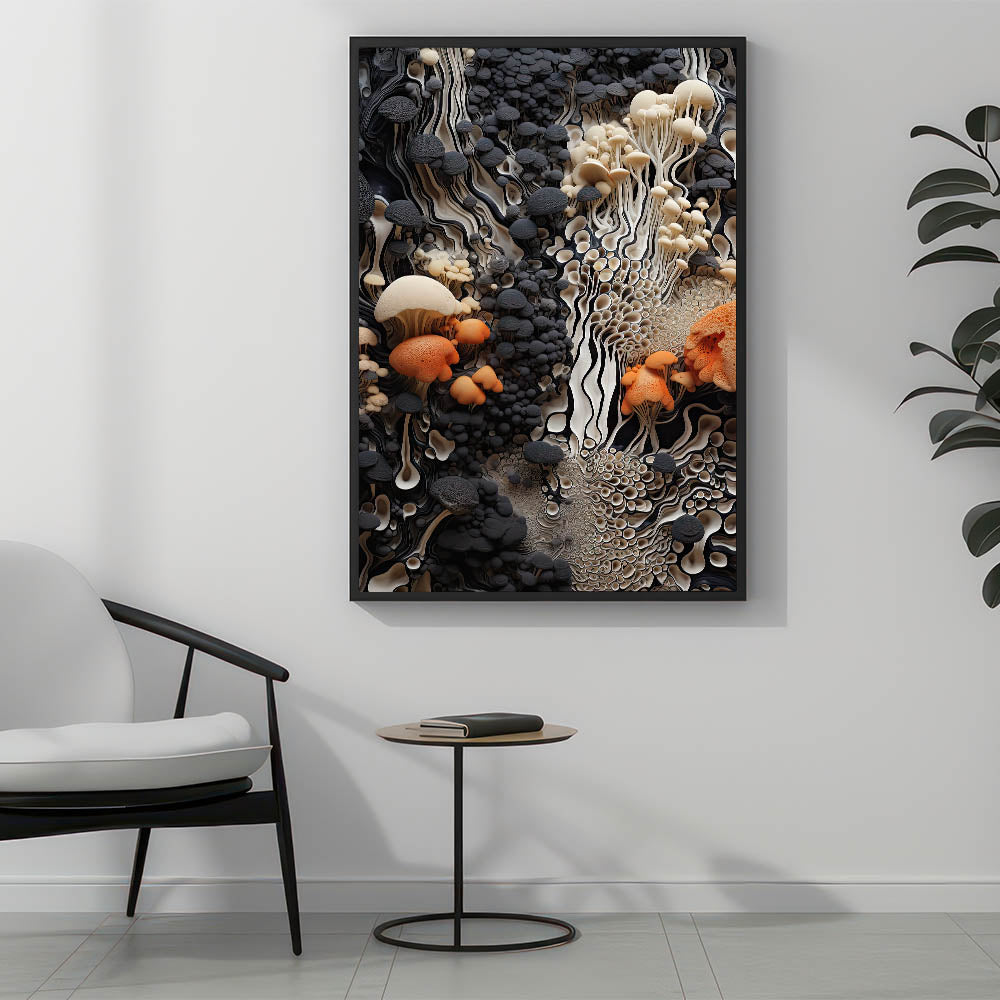 Bring a burst of natural beauty to your home with this vibrant mushroom macro wall art. This captivating piece showcases a detailed closeup of various mushrooms, highlighted by contrasting cream, deep black, and bright orange hues. The intricate textures and flowing lines create a sense of movement, making it an eye-catching artwork that beautifully blends realism with abstract design.