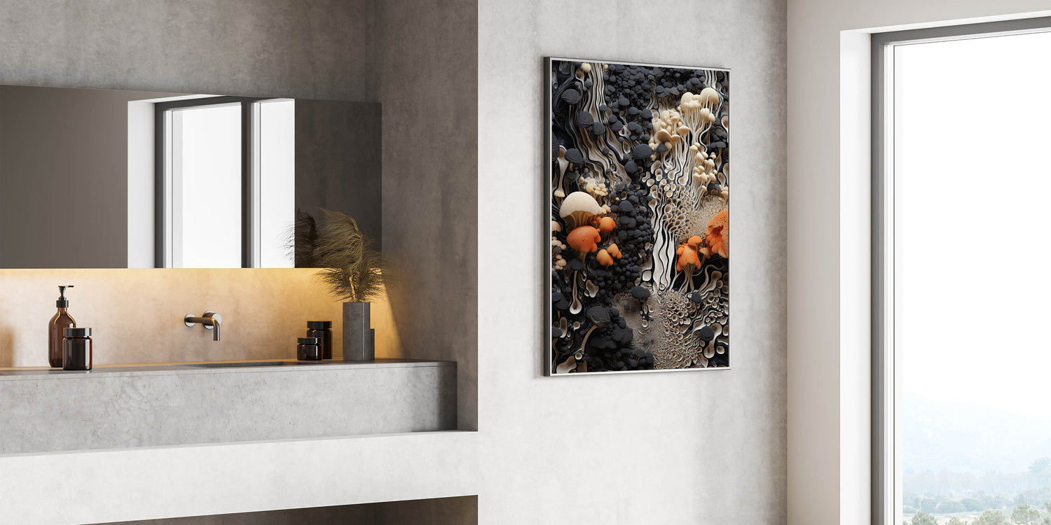 Elevate your decor with this stunning artwork that captures the delicate beauty of mushrooms in their natural environment. Its bold colors and intricate details make it a versatile piece, adding warmth and an artistic touch to any room.