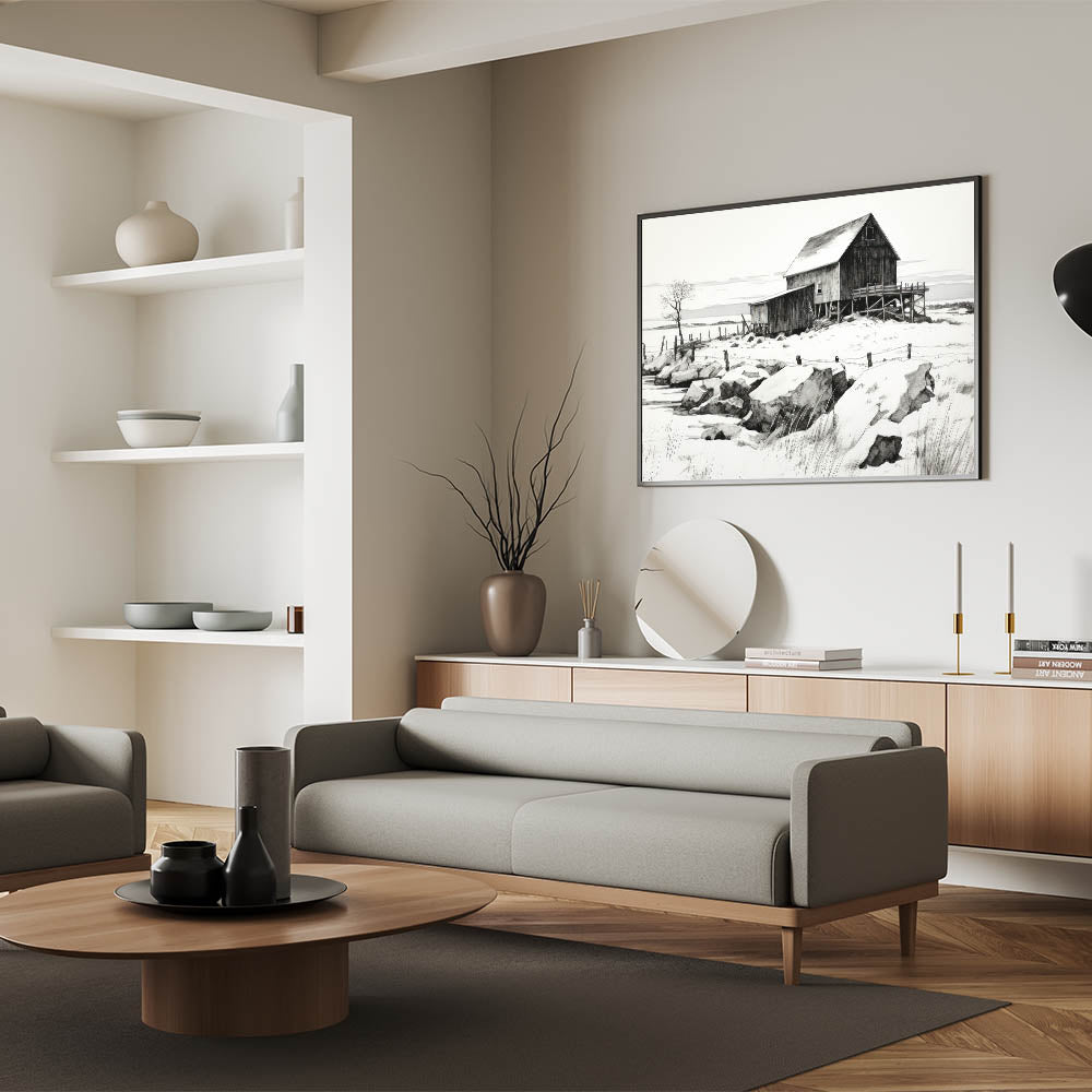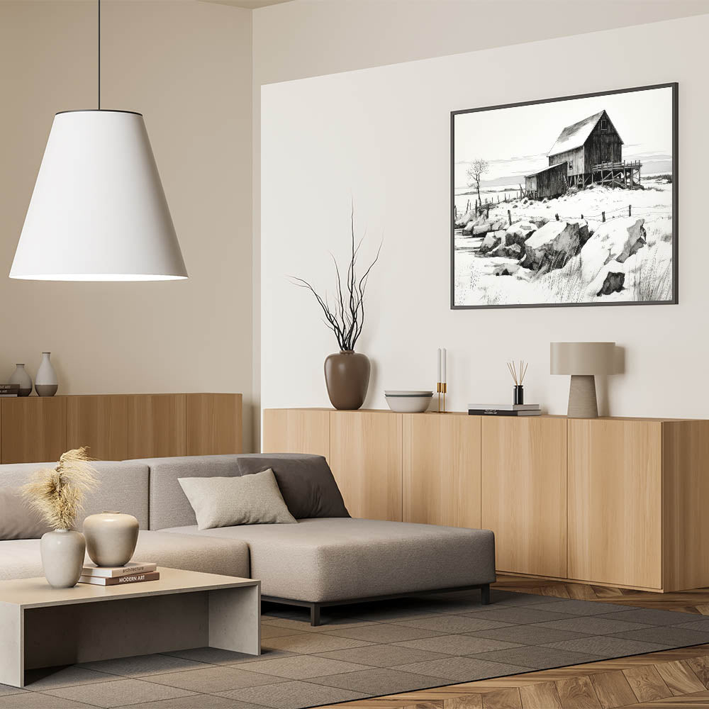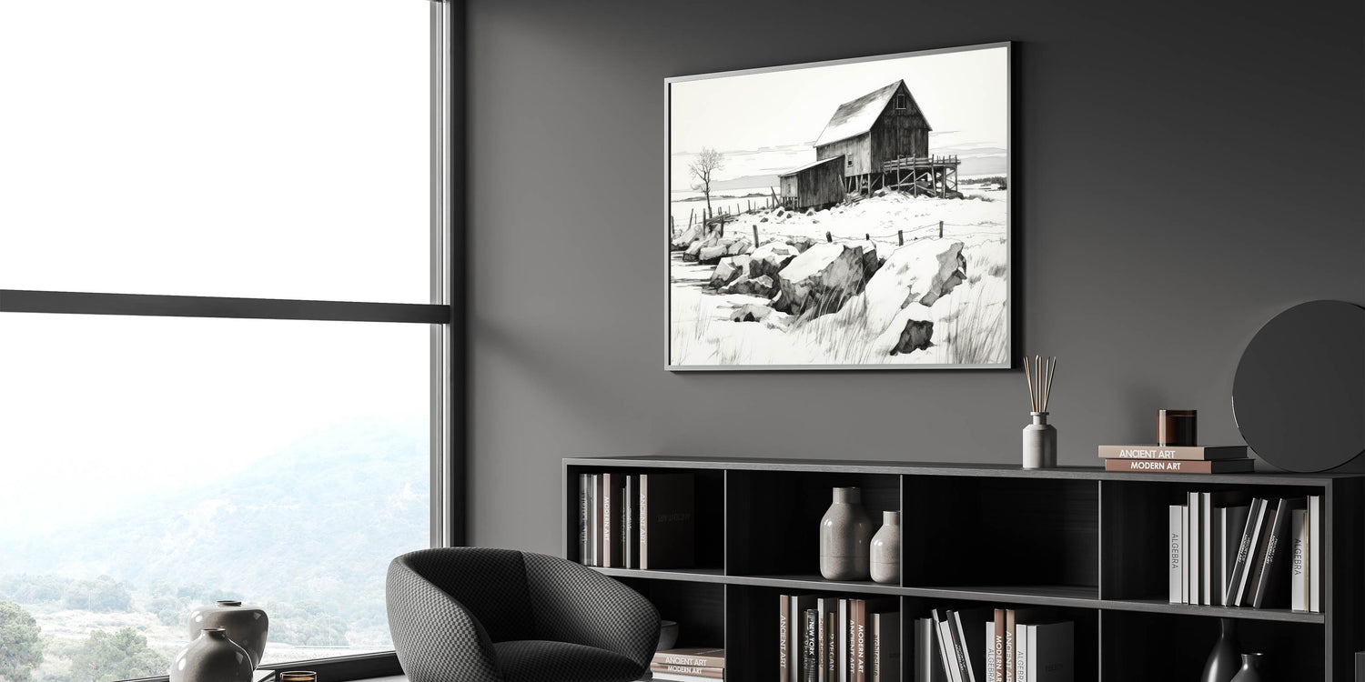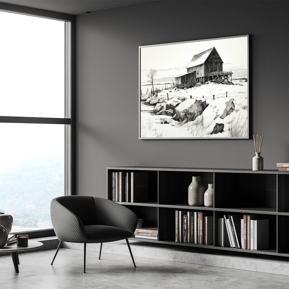 This vintage landscape art captures the rustic charm of a snow-covered barn set against a serene winter landscape. The monochromatic tones of black and white evoke a sense of timeless simplicity, with the detailed lines of the barn and the rocky foreground adding depth and contrast. The quiet winter scene is perfect for bringing a touch of vintage rural elegance to your home decor.