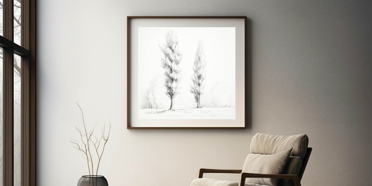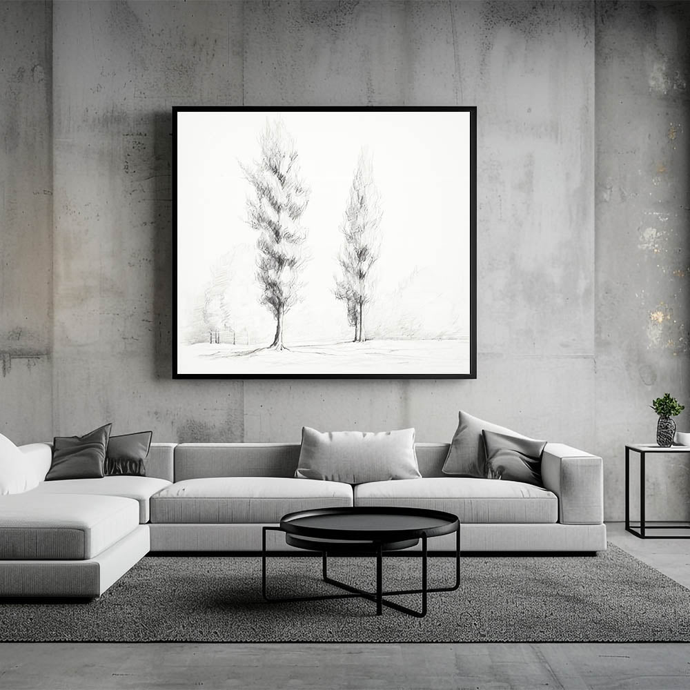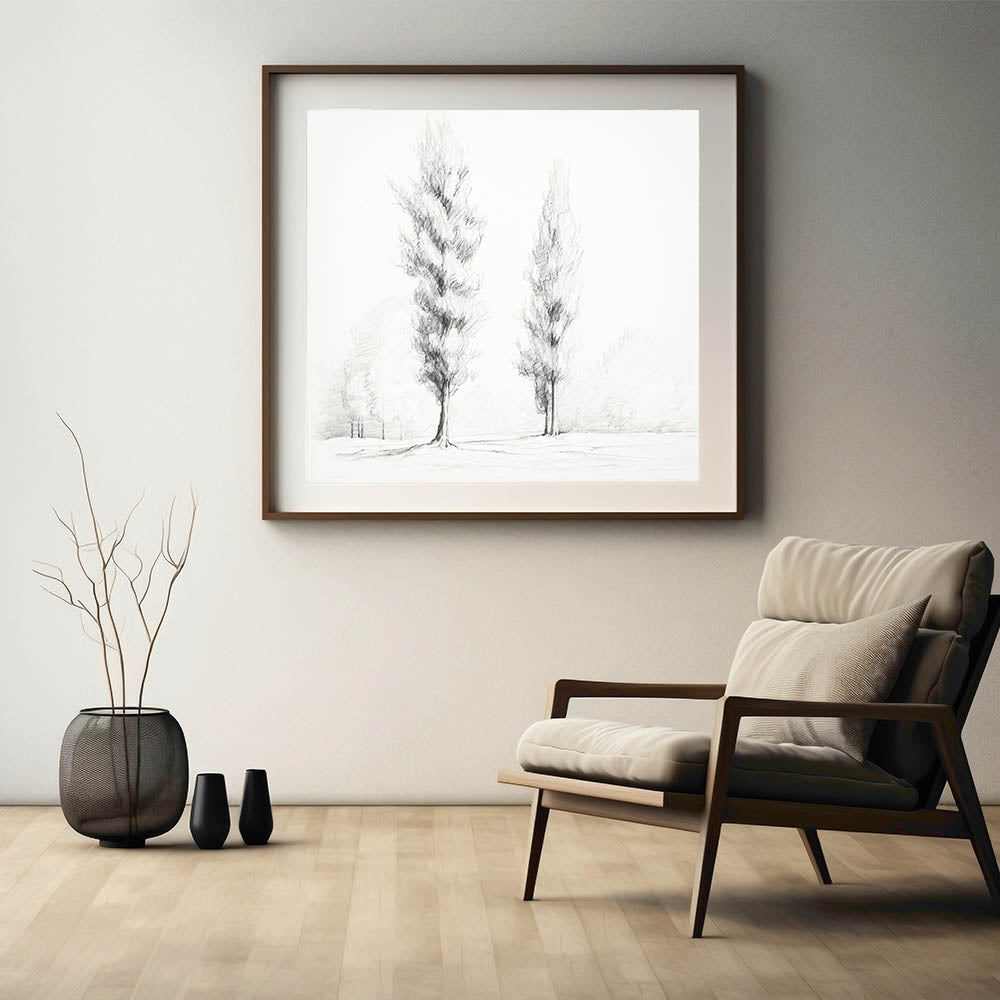 Immerse yourself in the timeless beauty of vintage landscapes with this elegant monochrome tree sketch. Featuring delicate pencil strokes that bring tall, graceful trees to life, this artwork embodies classic elegance with retro landscapes. The minimalistic, hand-drawn style evokes antique charm in landscape art, making it a refined addition to any space.