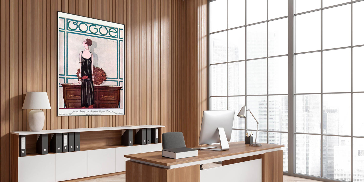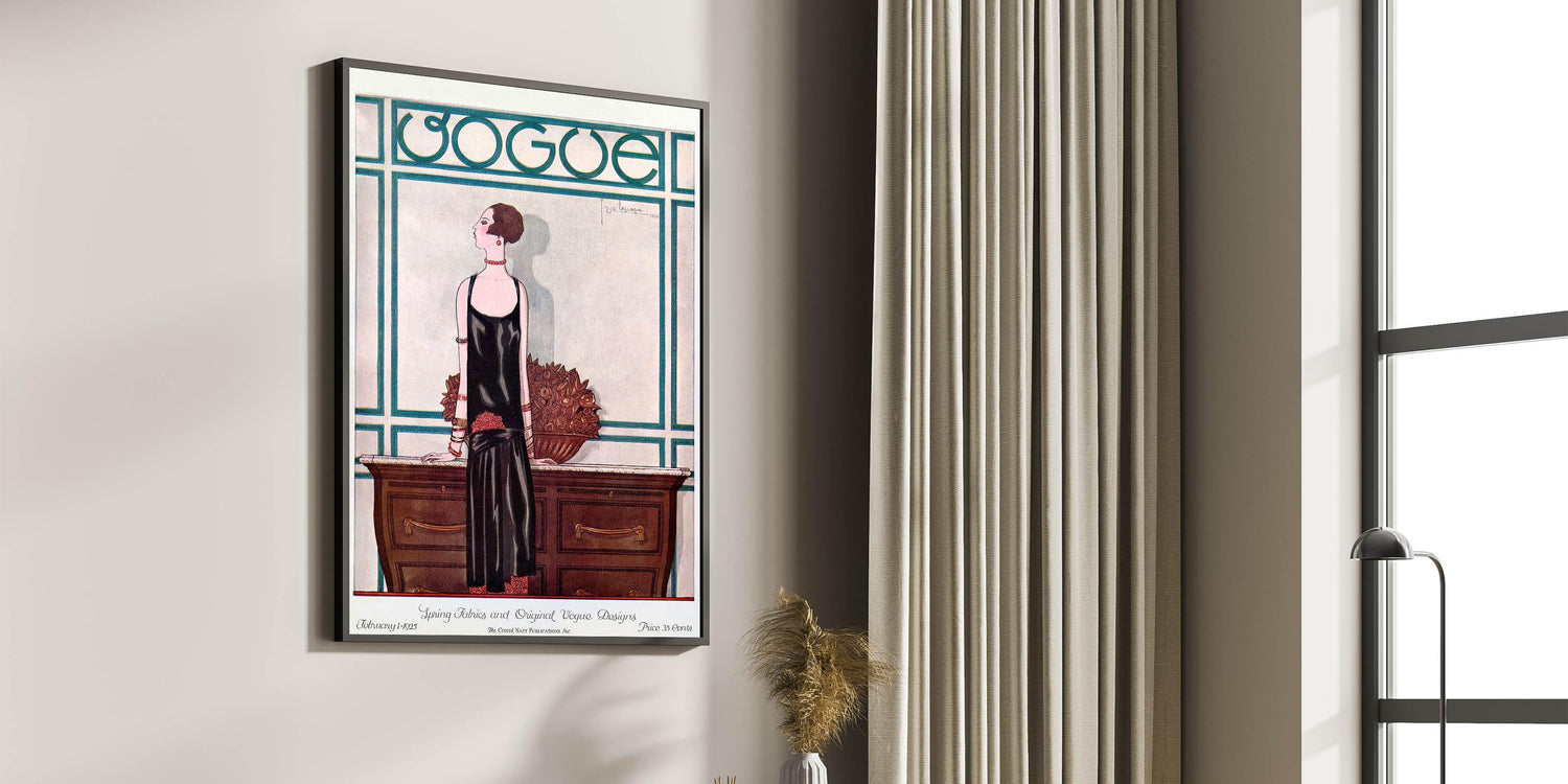 Step back into the 1920s with this iconic Fashion Magazine Print, a beautiful reproduction of a classic Vogue cover. The artwork features a stylish woman in a sleek black dress, adorned with delicate red details, leaning gracefully against an elegant dresser. Her poised stance and the refined backdrop evoke the sophisticated allure of the era. The muted gray tones, complemented by teal accents, give the piece a true art deco feel, making it a striking addition to any interior decor.