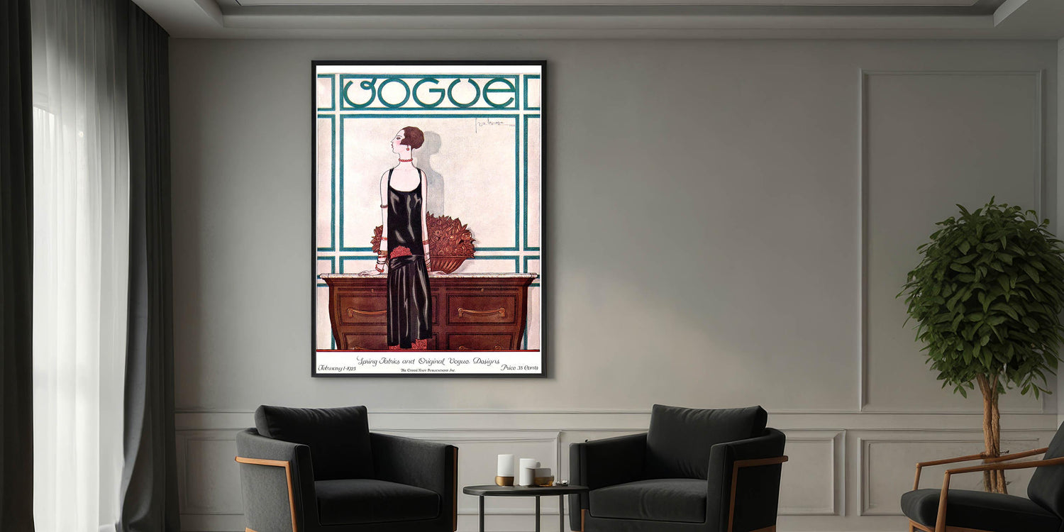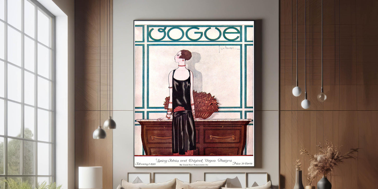 Celebrate the timeless elegance of the Roaring Twenties with this Vogue Framed Art, a beautiful reproduction of a classic 1925 Vogue cover. The illustration features a sophisticated woman in a sleek black dress, adorned with striking red accents and jewelry. Her poised stance against a luxurious wooden dresser and the art deco background highlights the refined style of the era. The muted beige and teal tones complement the rich details, making this piece a stunning addition to any decor.